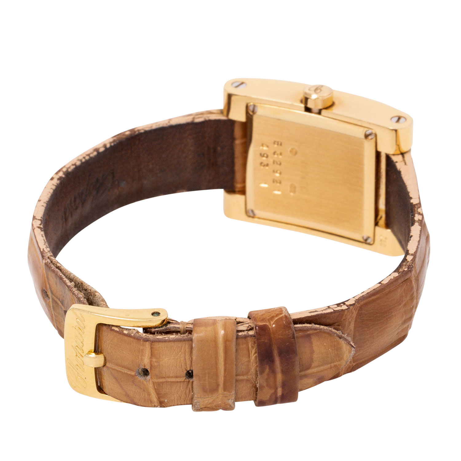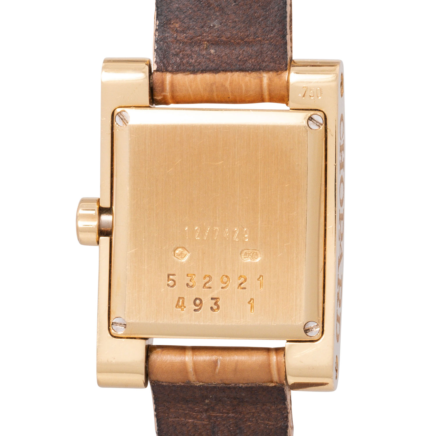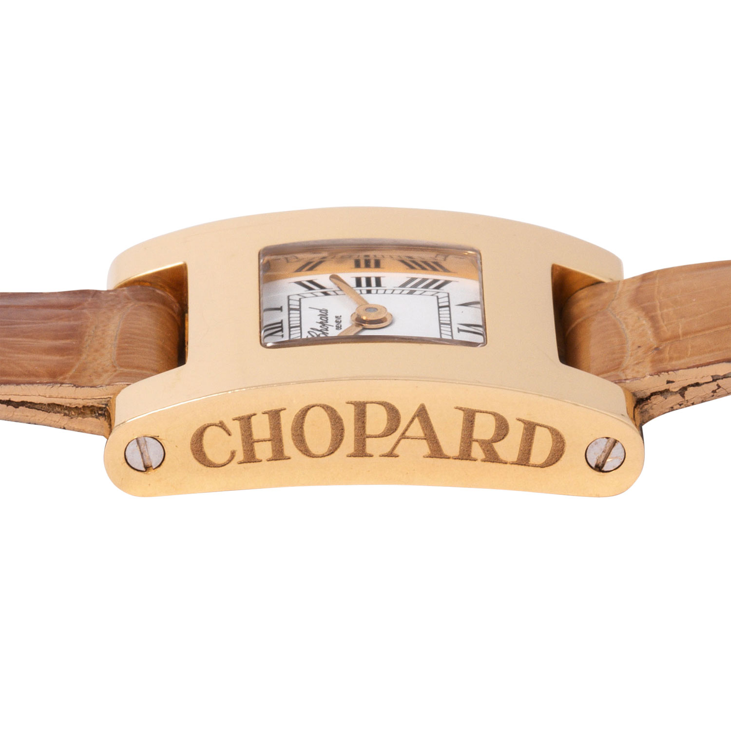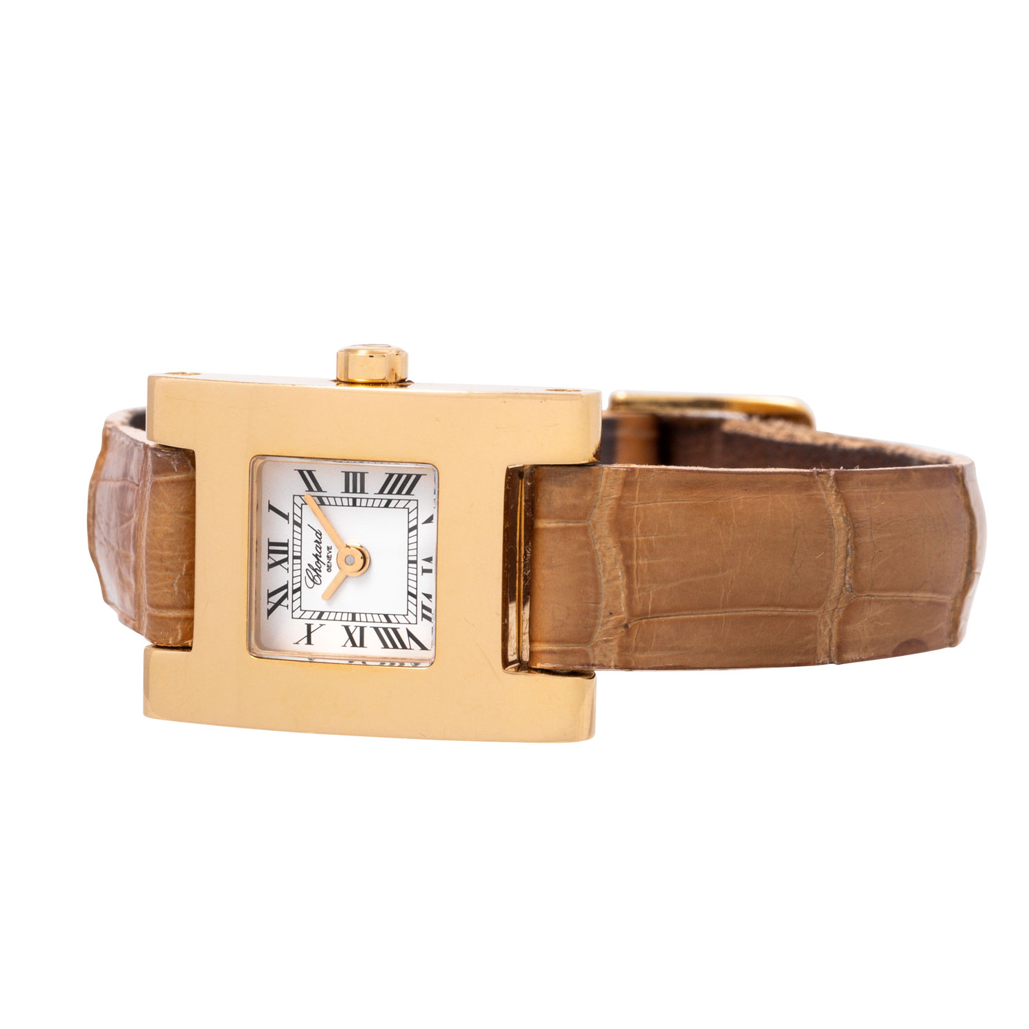 CHOPARD 'Your Hour' Ref 4451-1 ladies' watch. 18K yellow gold. 18K yellow gold. Quartz movement in working condition. Original leather wristband with pin buckle. White dial with Roman numerals. Used condition with visible signs of wear on the case and bracelet (heavily worn). Certificate of authenticity from the purchase at jeweler Wempe in Hamburg from September 2002 enclosed. Diameter approx. 19 mm without crown. Fits up to approx. 16 cm wrist size.