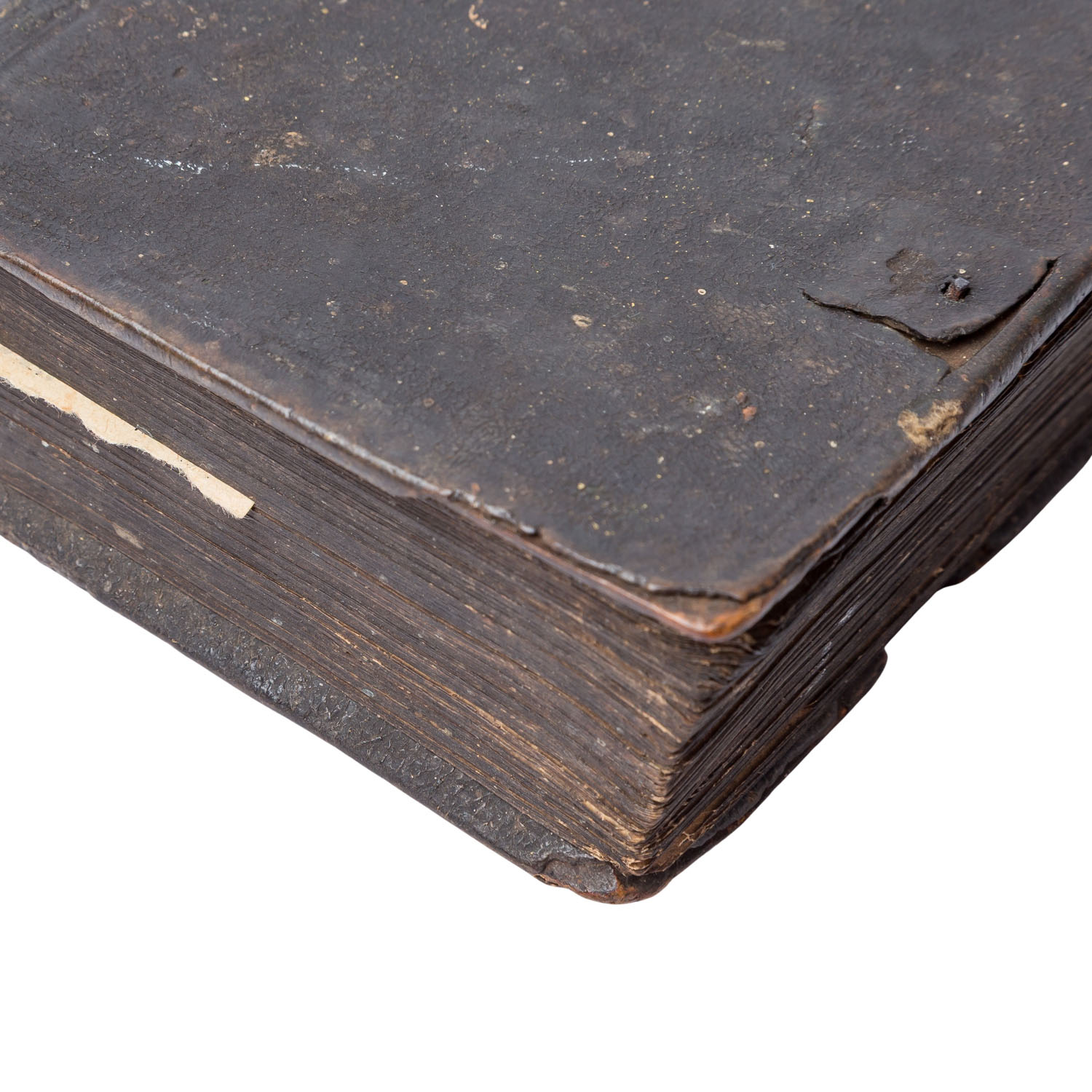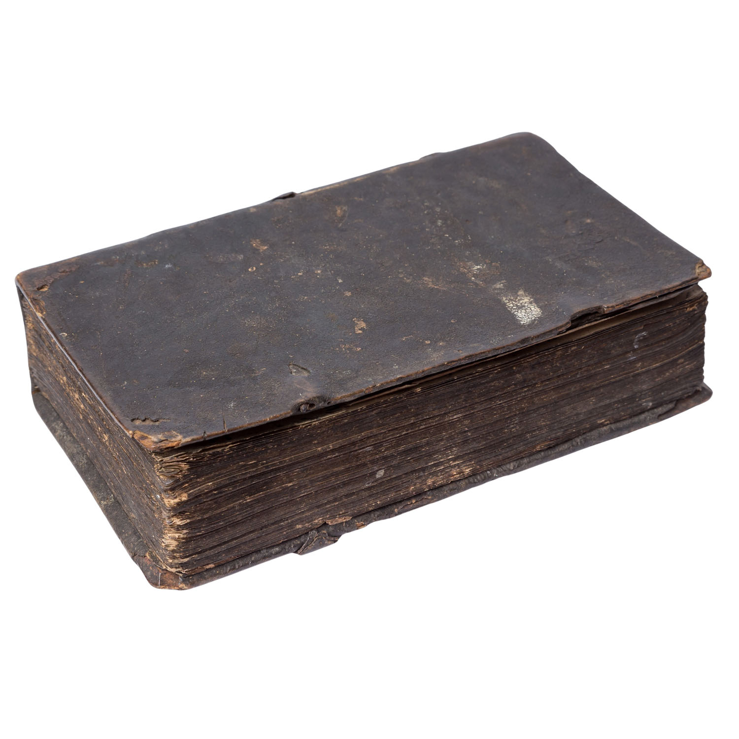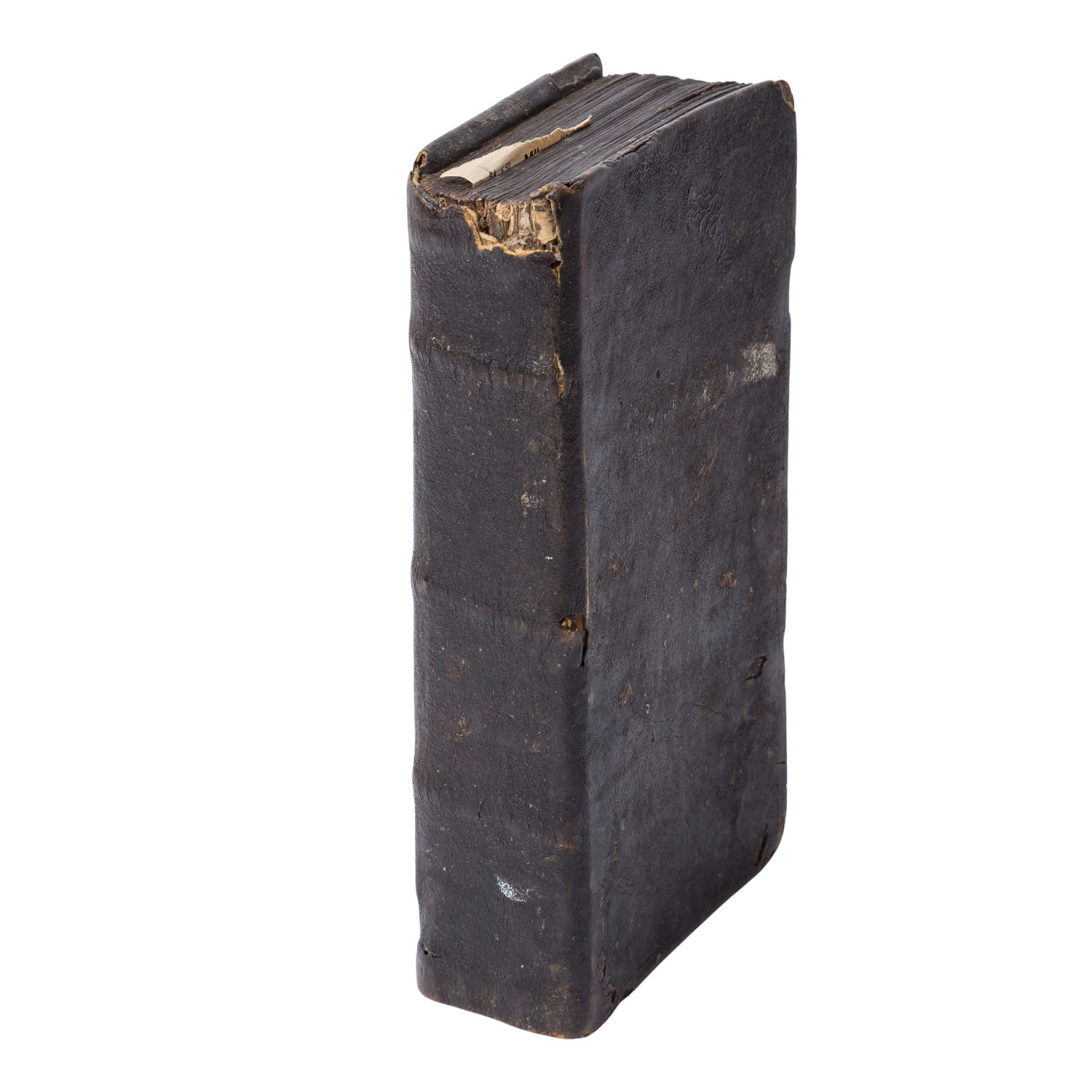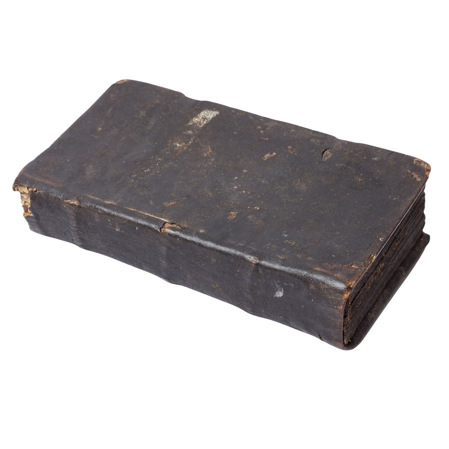 With very heavy signs of age and use, book clasps missing, binding clearly damaged with flaws, discoloration, rubbing, creases, stains, tears, pages missing.