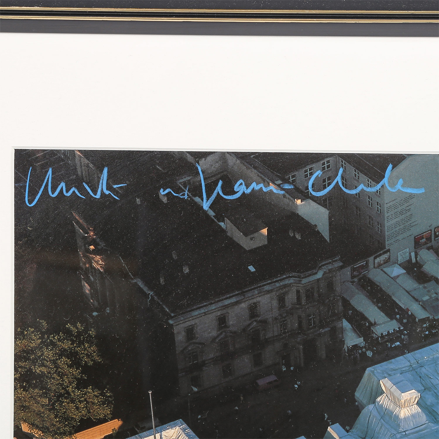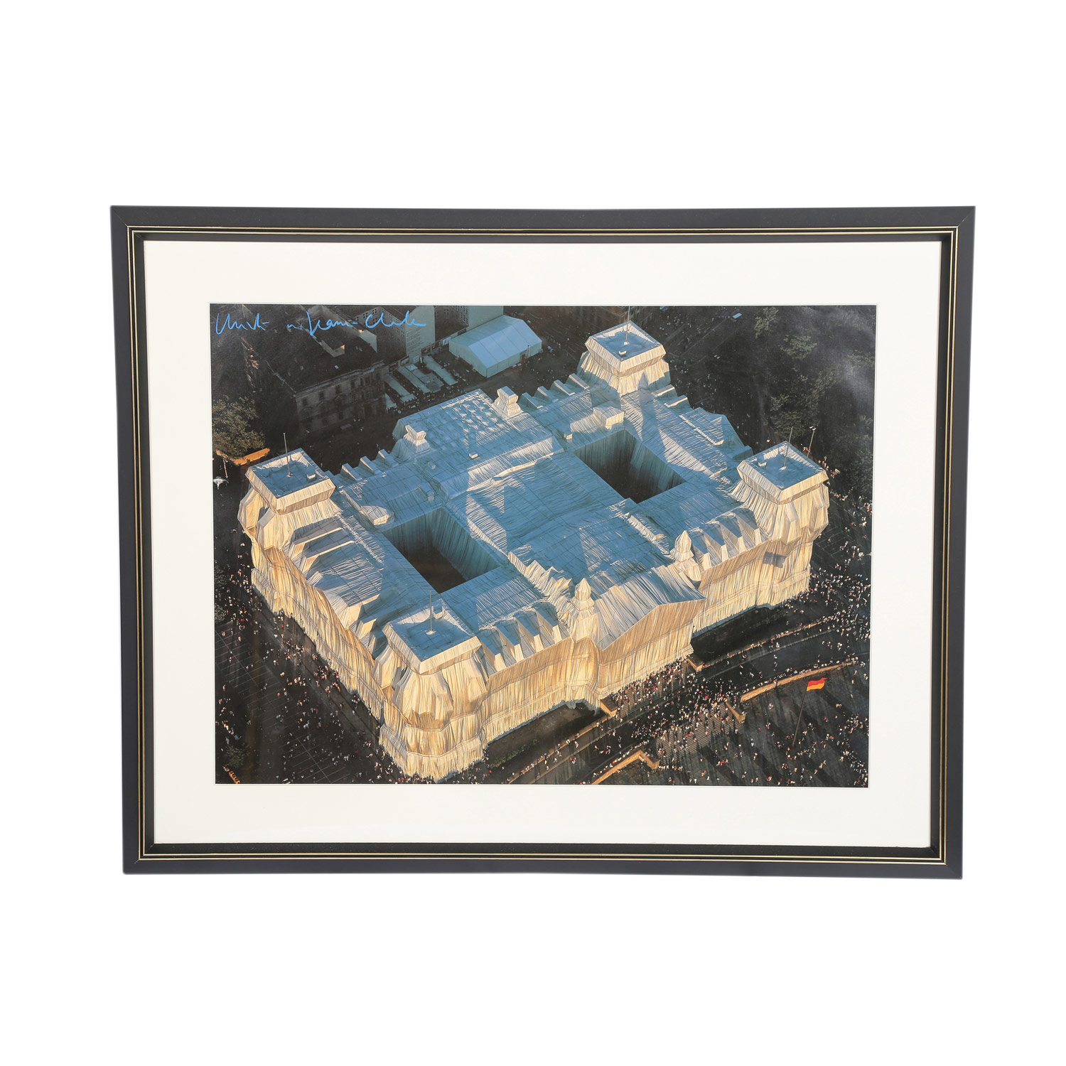 CHRISTO UND JEANNE-CLAUDE (Christo 1935-2020), 'Wrapped Reichstag', 'Wrapped Reichstag' (project for the German Reichstag - Berlin), the Reichstag in aerial view of the west facade, digital print on paper, signed , HxW: 58/78 cm. Framed, slight signs of age.