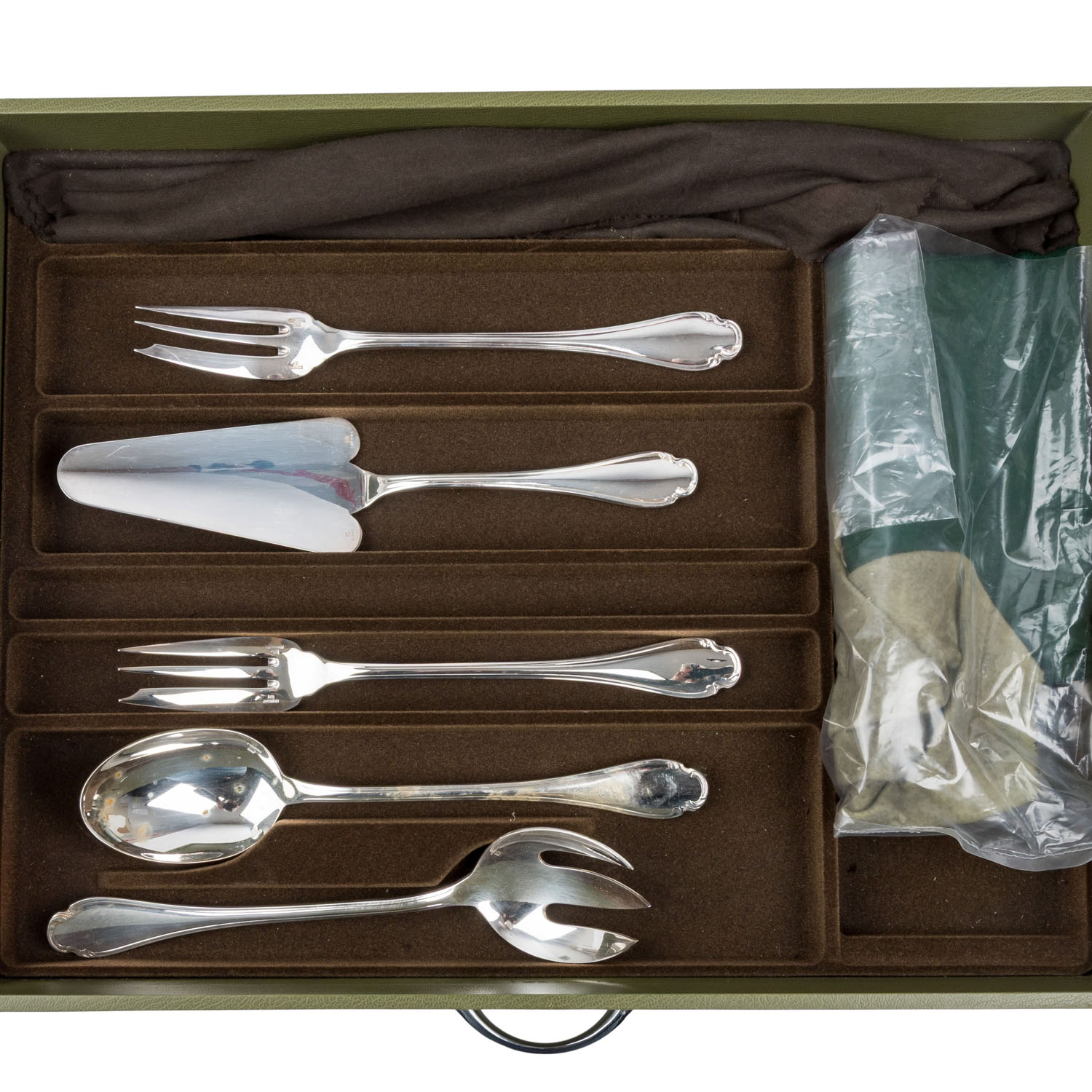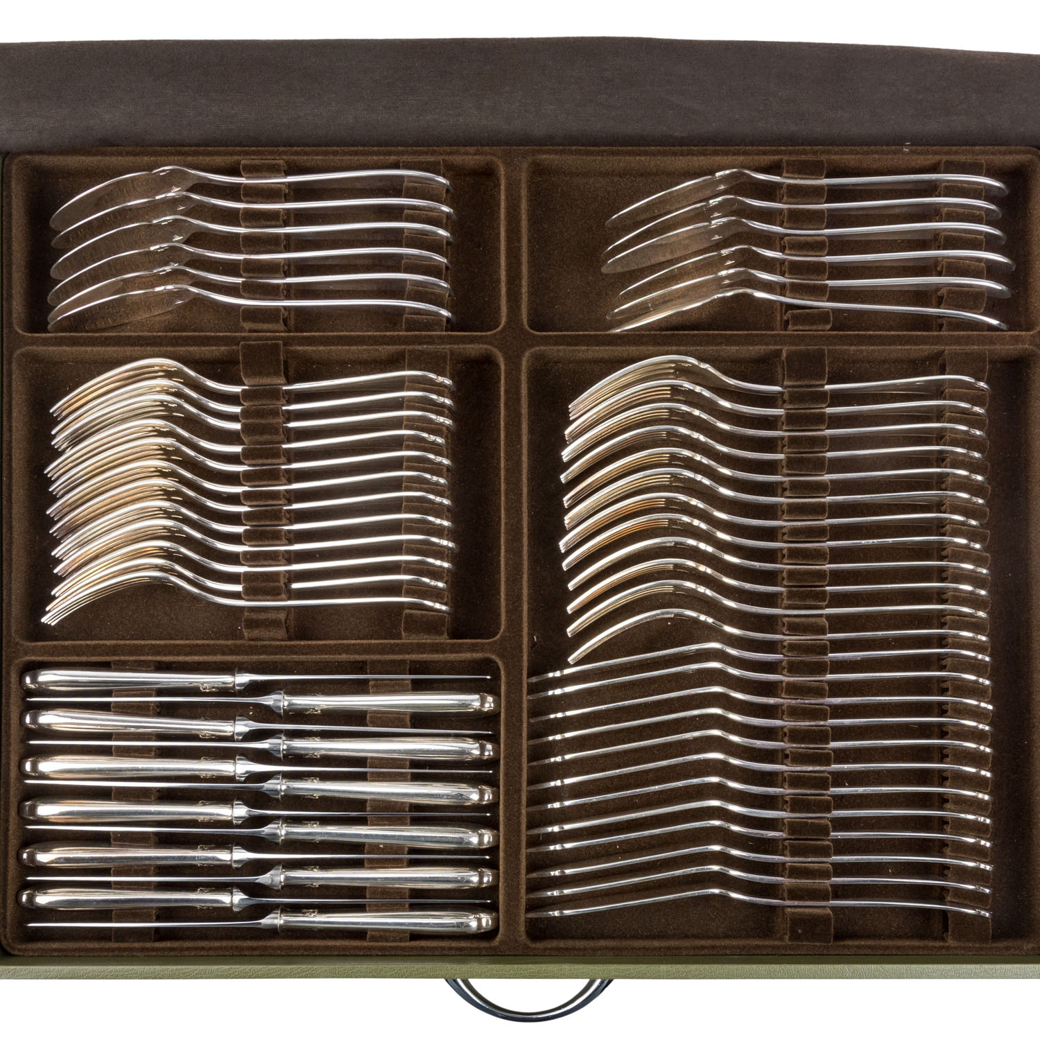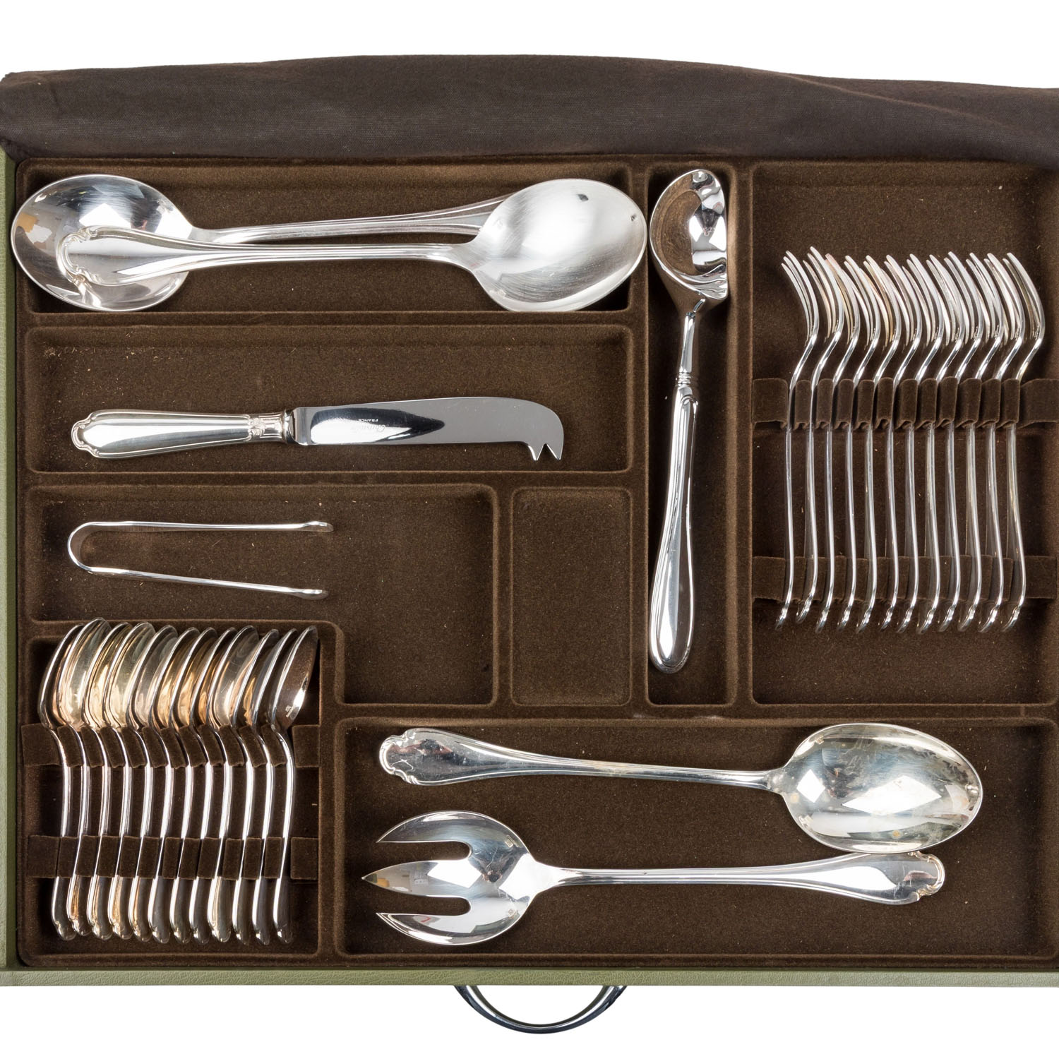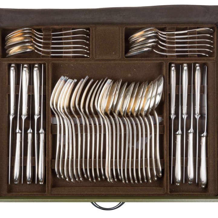 CHRISTOFLE cutlery set for 12 people, “Pompadour”, silver-plated, in cutlery box, 20th century. 12 dessert forks, 12 dessert spoons, 12 dessert knives, 12 dinner forks, 12 dinner spoons, 12 dinner knives, 12 gourmet spoons, 12 fish forks, 12 fish knives, 12 coffee spoons, 12 cake forks and 12 serving pieces, 144 pieces of cutlery in total. Slight signs of age and use.