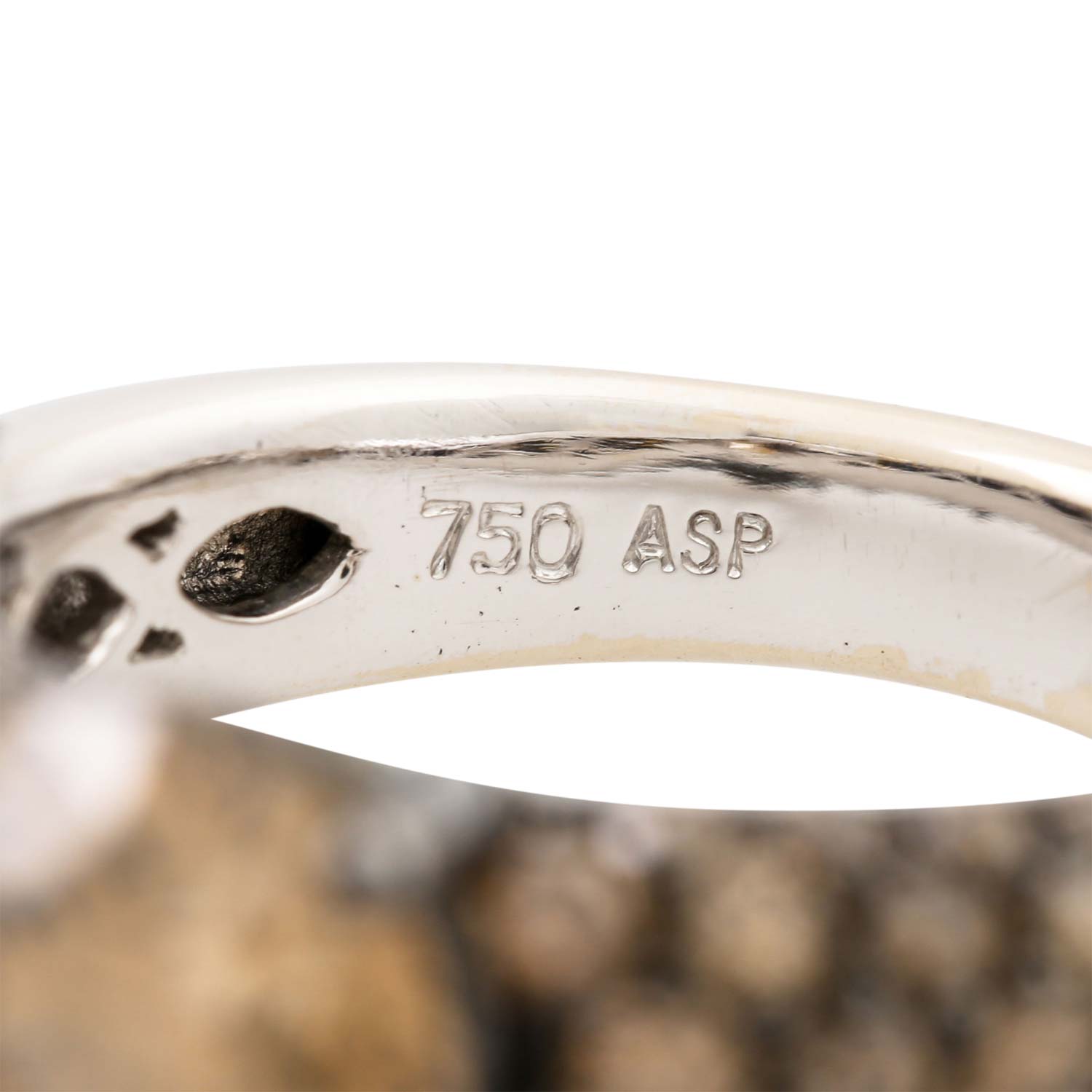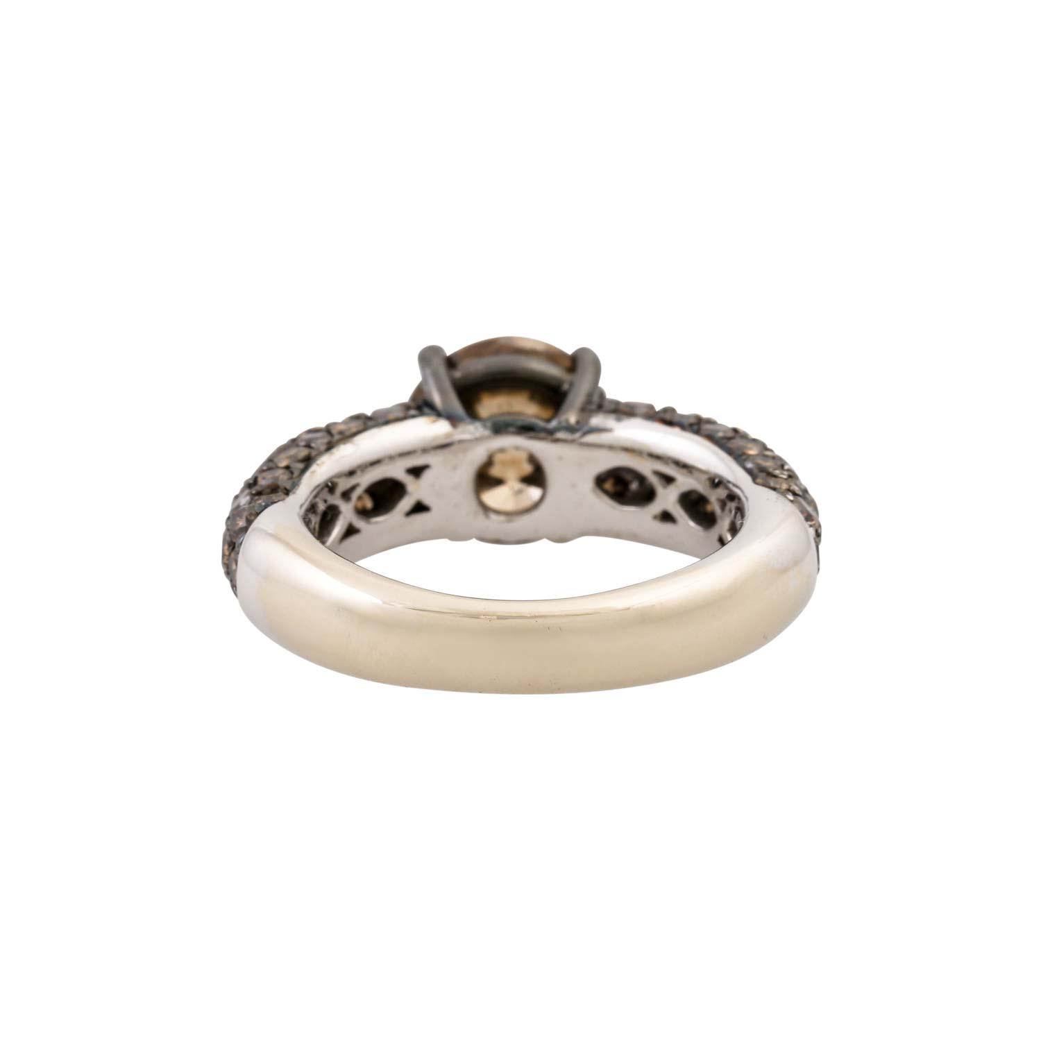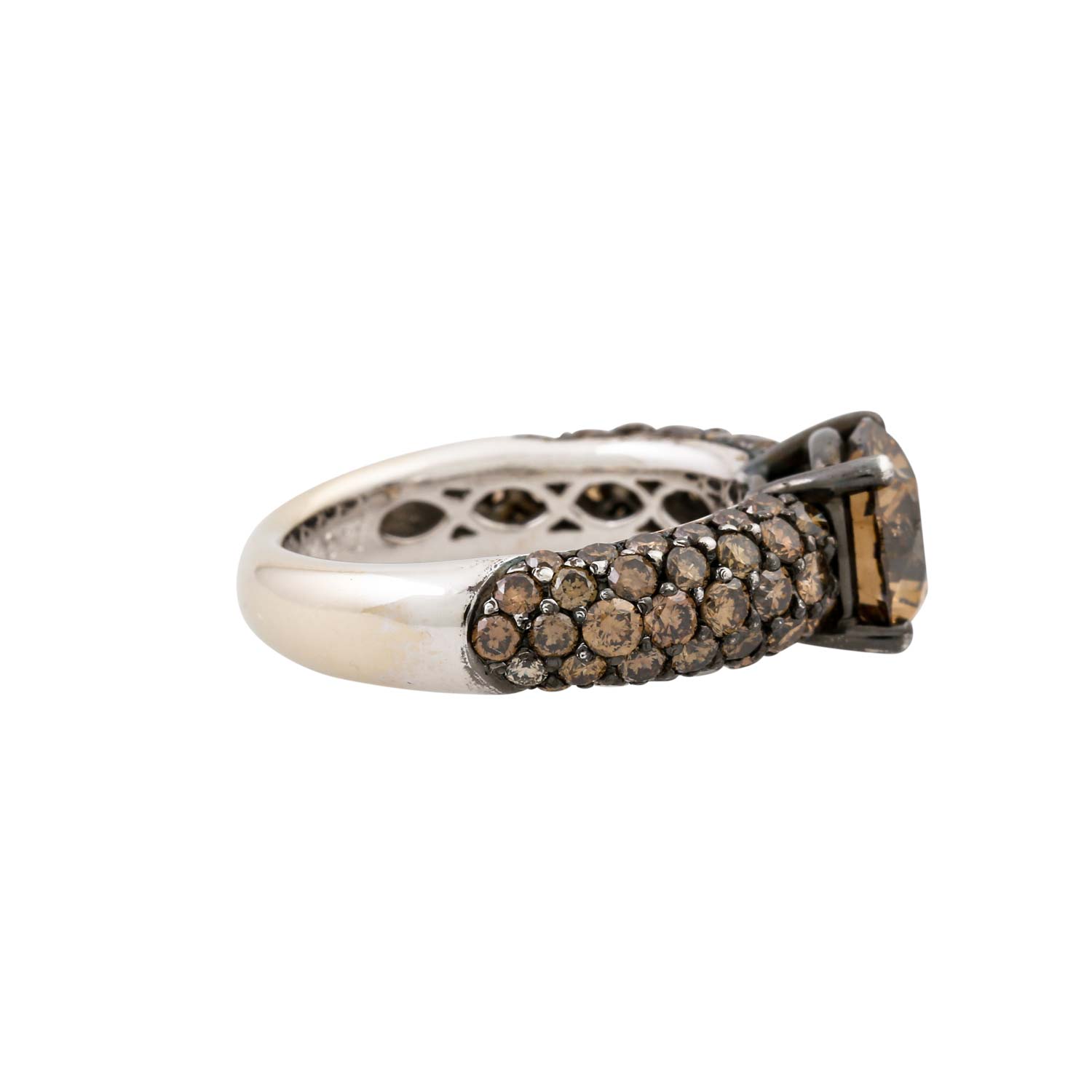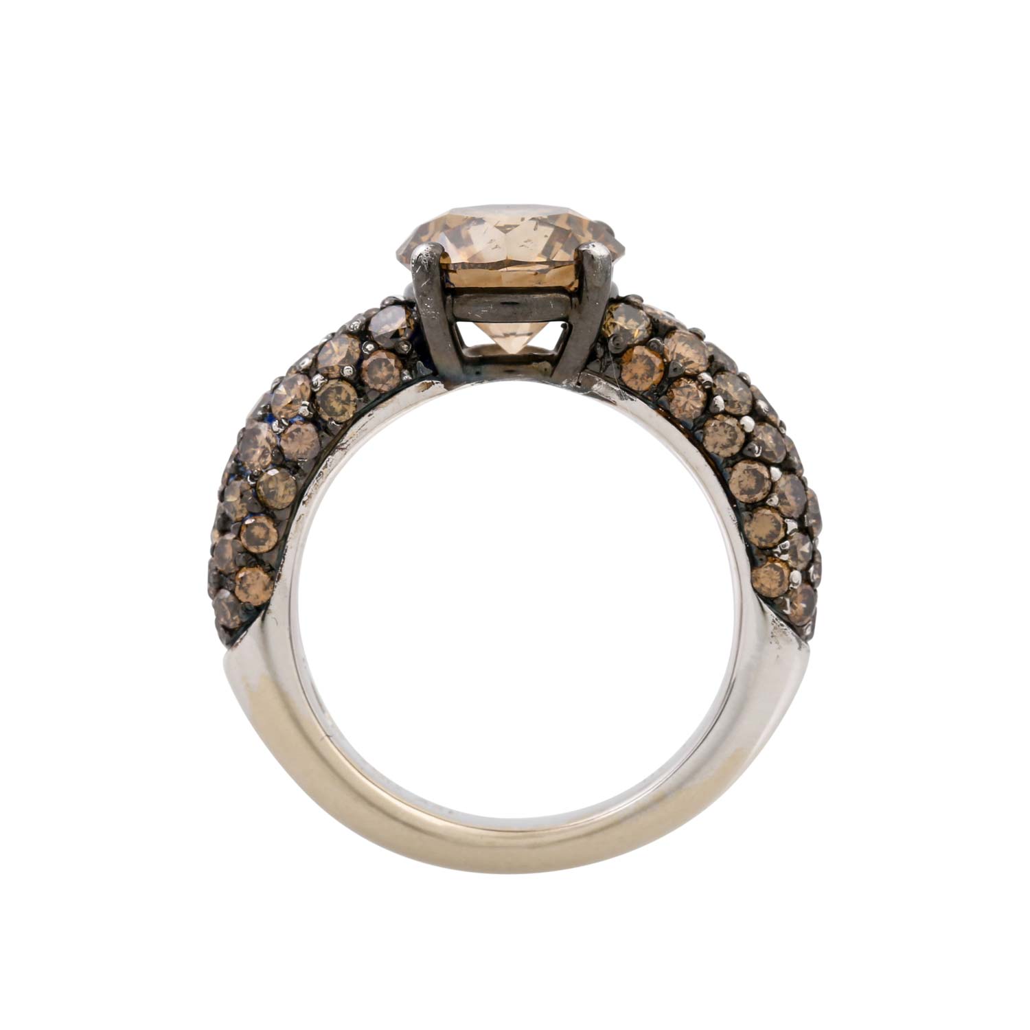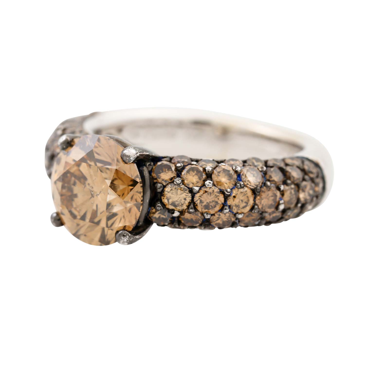 Classic ring with brilliant-cut diamond from approx 3,2 ct fancy brown / VS1, 66 brilliant-cut diamonds approx 2,6 ct approx fancy brown / VS1, WG 18K, 9,8 g, ring size: 56, NP: ca. 13.750 € (2011), 21th century, slight signs of wear, certificate enclosed.