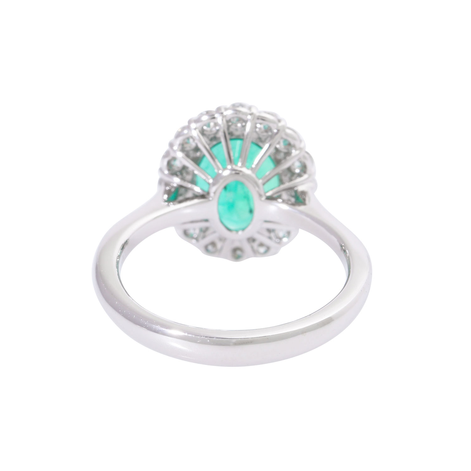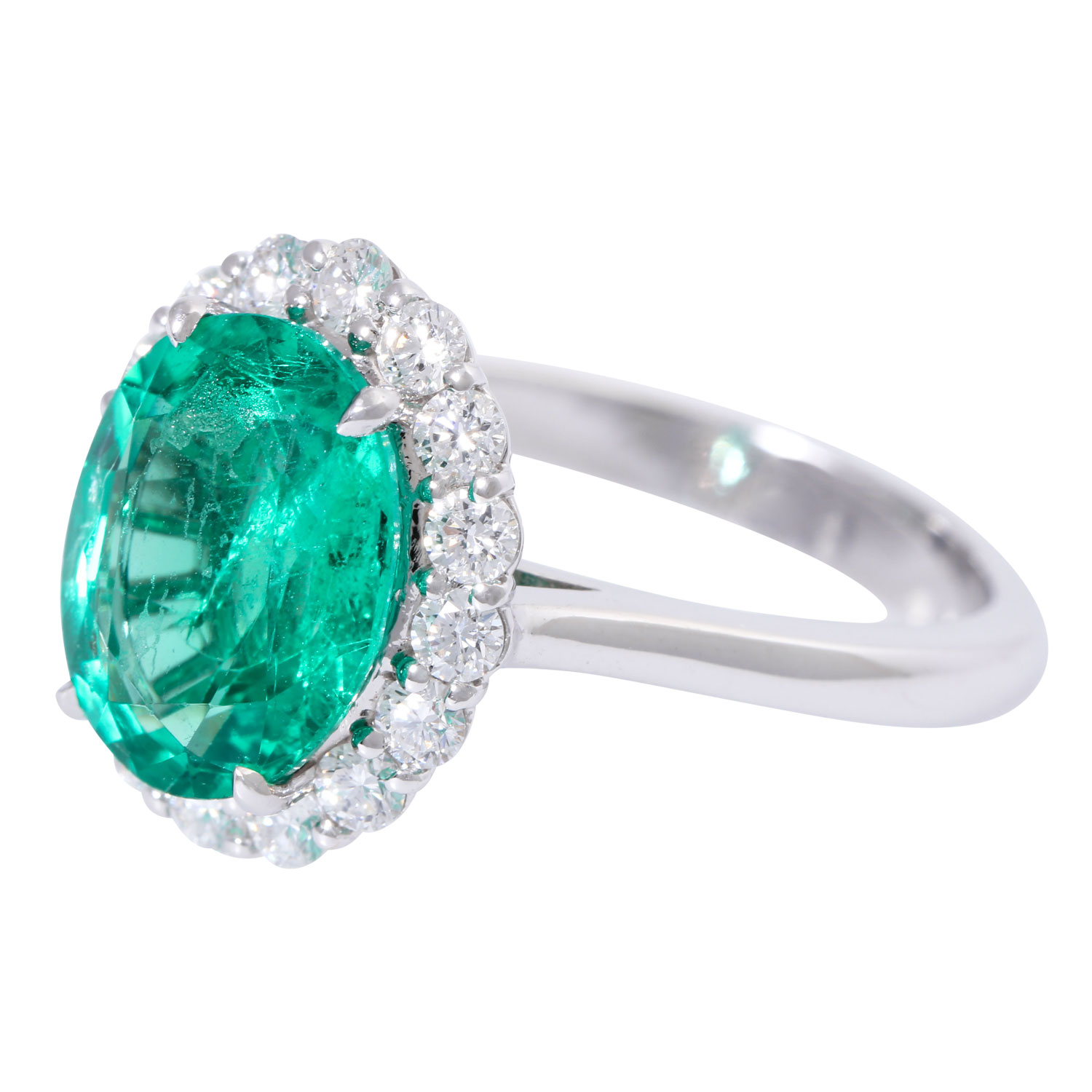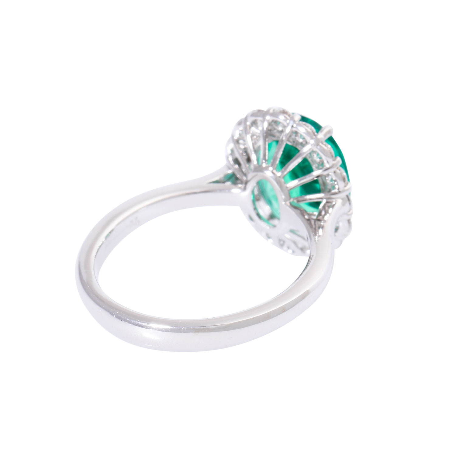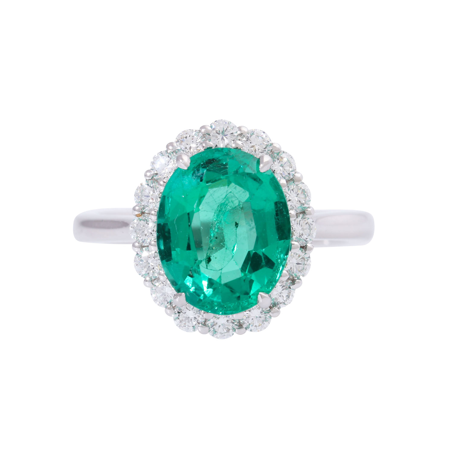 Ring with fine emerald 2.60ct and 16 brilliant-cut diamonds totalling ca. 0.54ct, RW-WHITE (G-H)/VSI-SI. WG 18K, 4.4g, ring size 51, 21st century, mint condition.