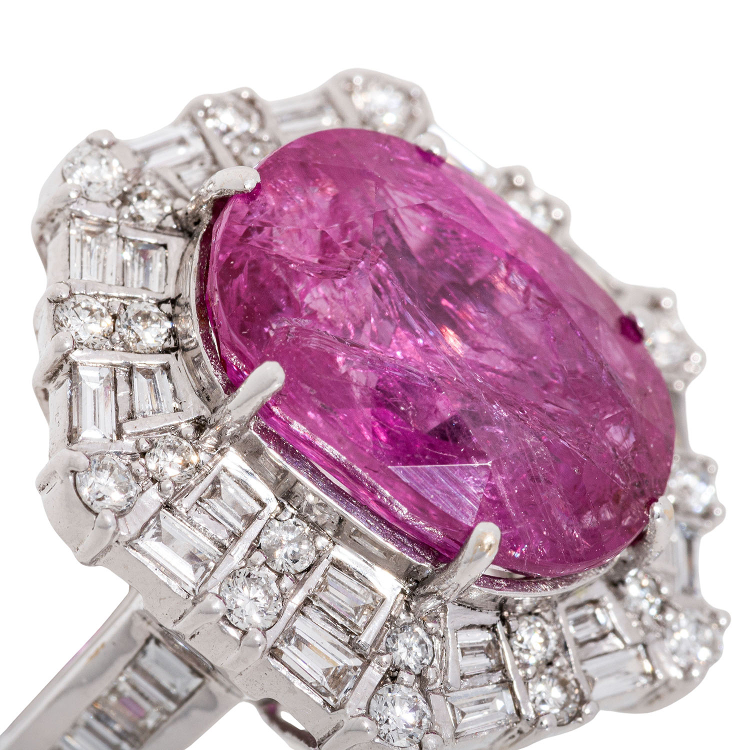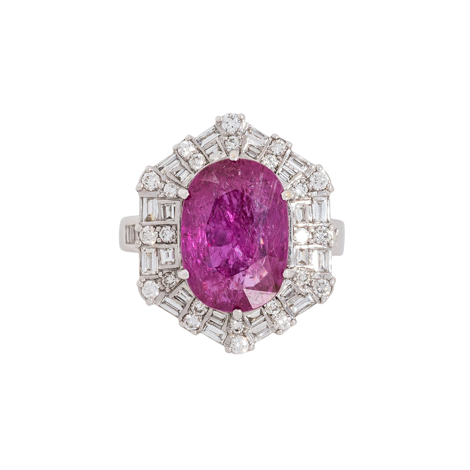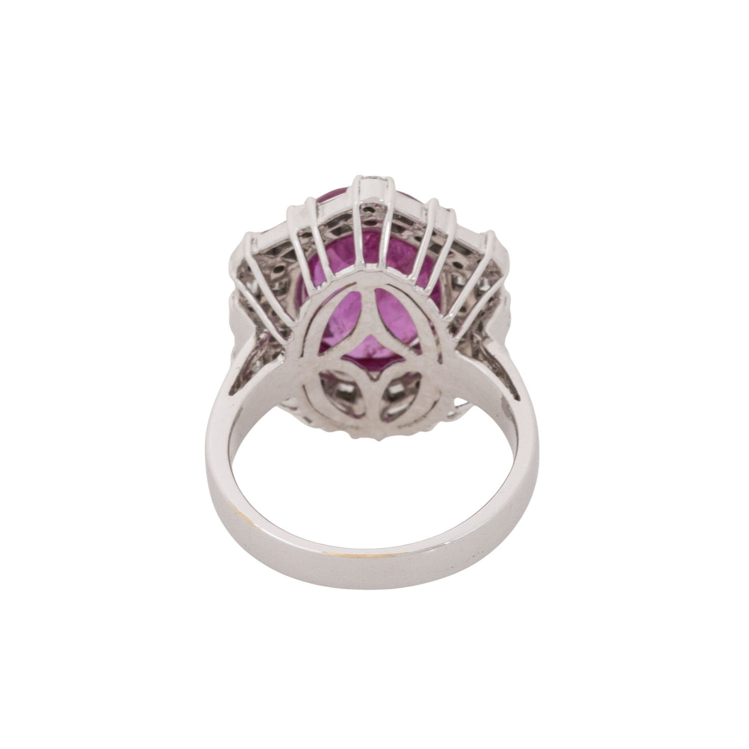 Classic Ring with fine ruby, 48 diamonds, 24 brilliant-cut diamonds and 24 baguette-cut diamonds, totalling ca. 2.40 ct, RW- WHITE (G-H)/VS-SI, WG 18K, 8.9 g, ring size 53, 20th century, good condition. Jeweller quality.