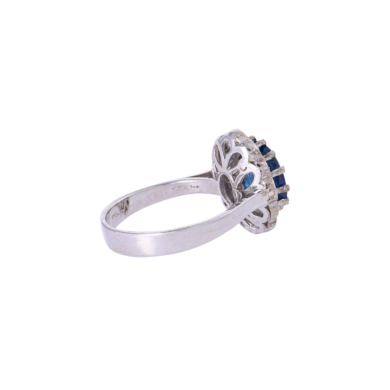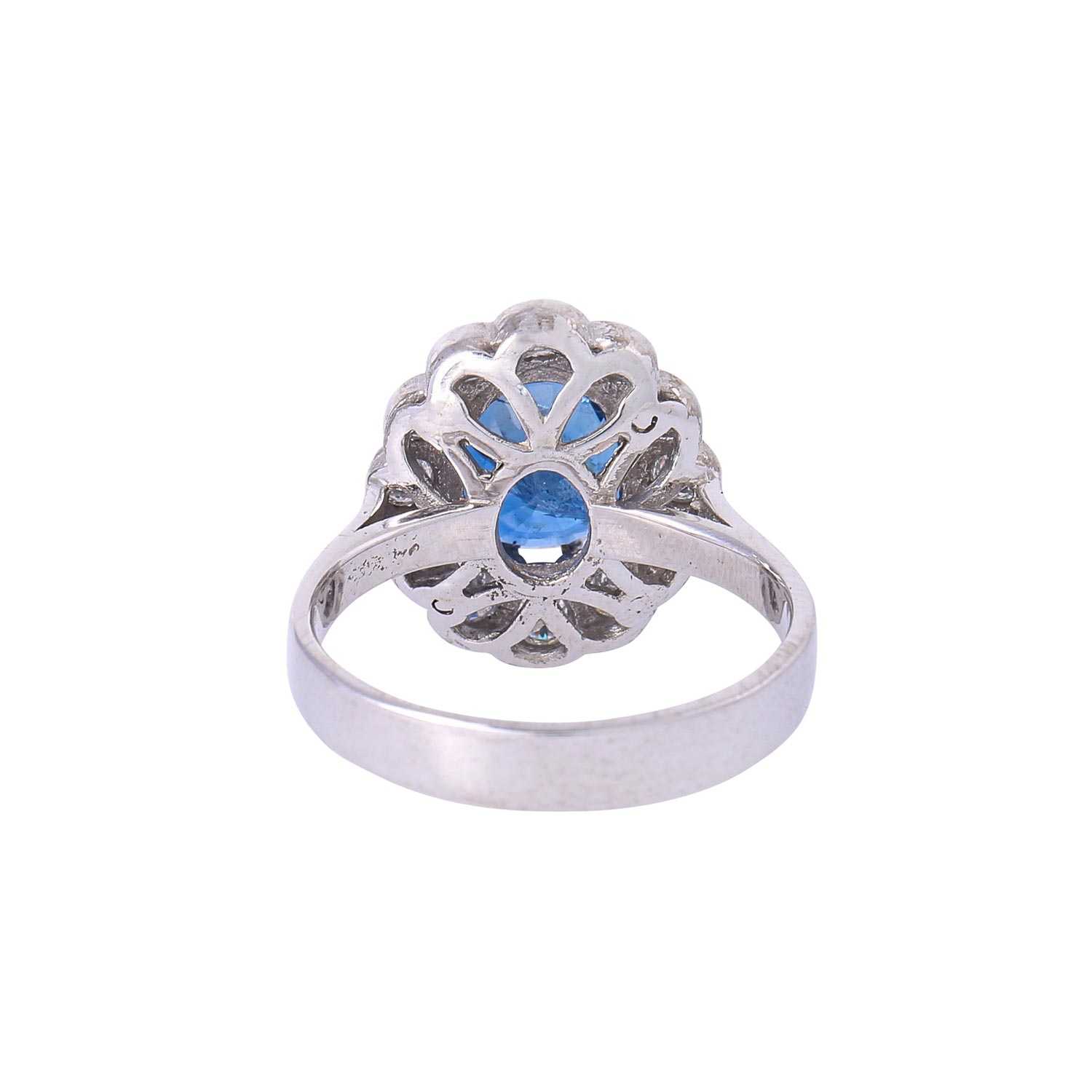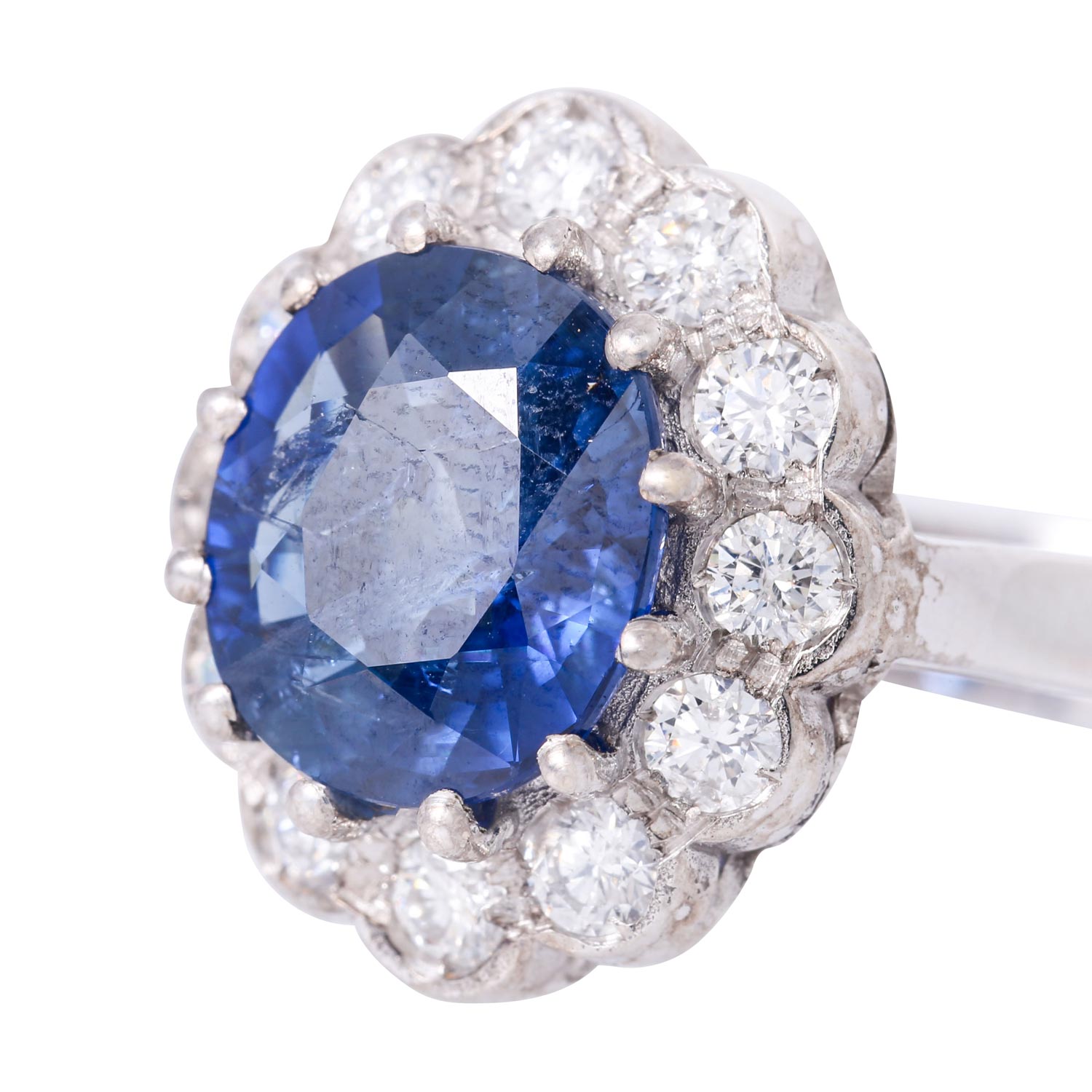 Classical Ring with sapphire ca. 3.3ct and 12 brilliant-cut diamonds totalling ca. 0.70ct, WG 18K, 5.8g, 20th century.