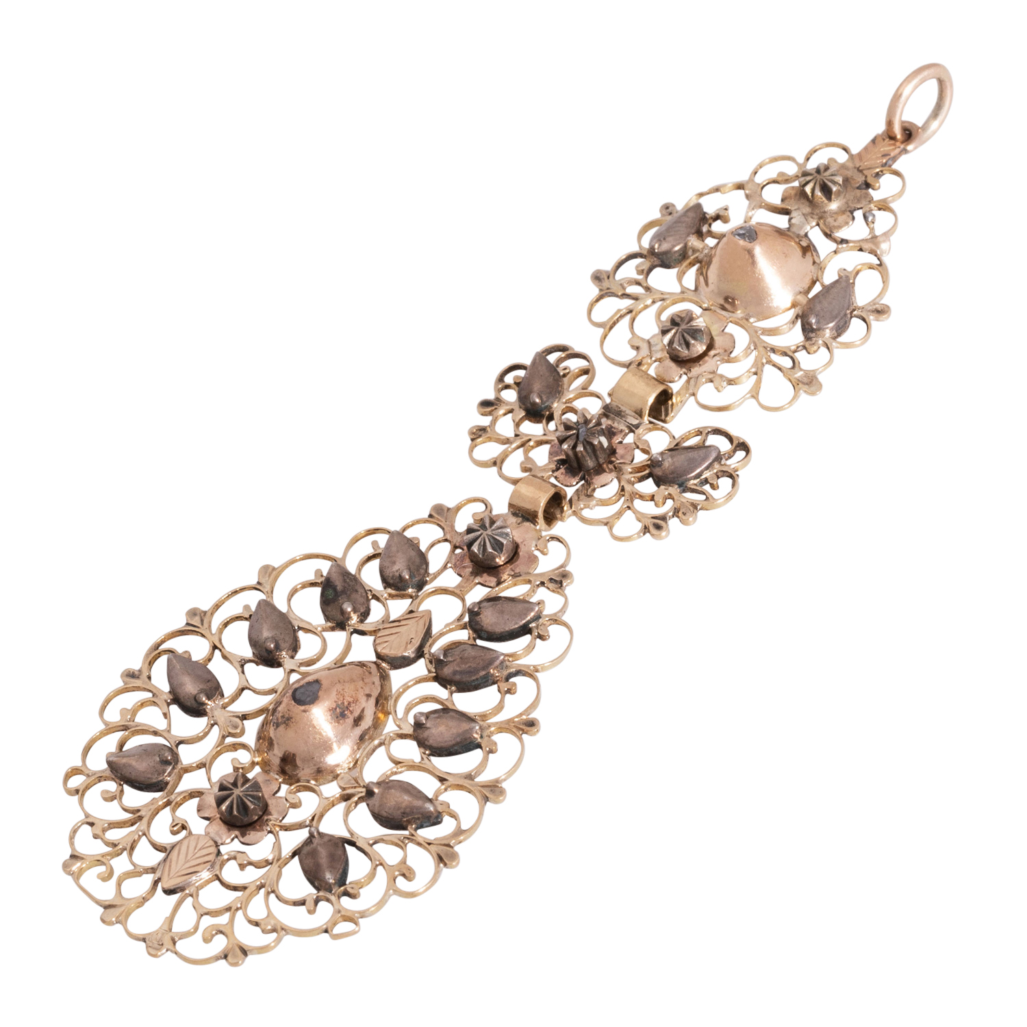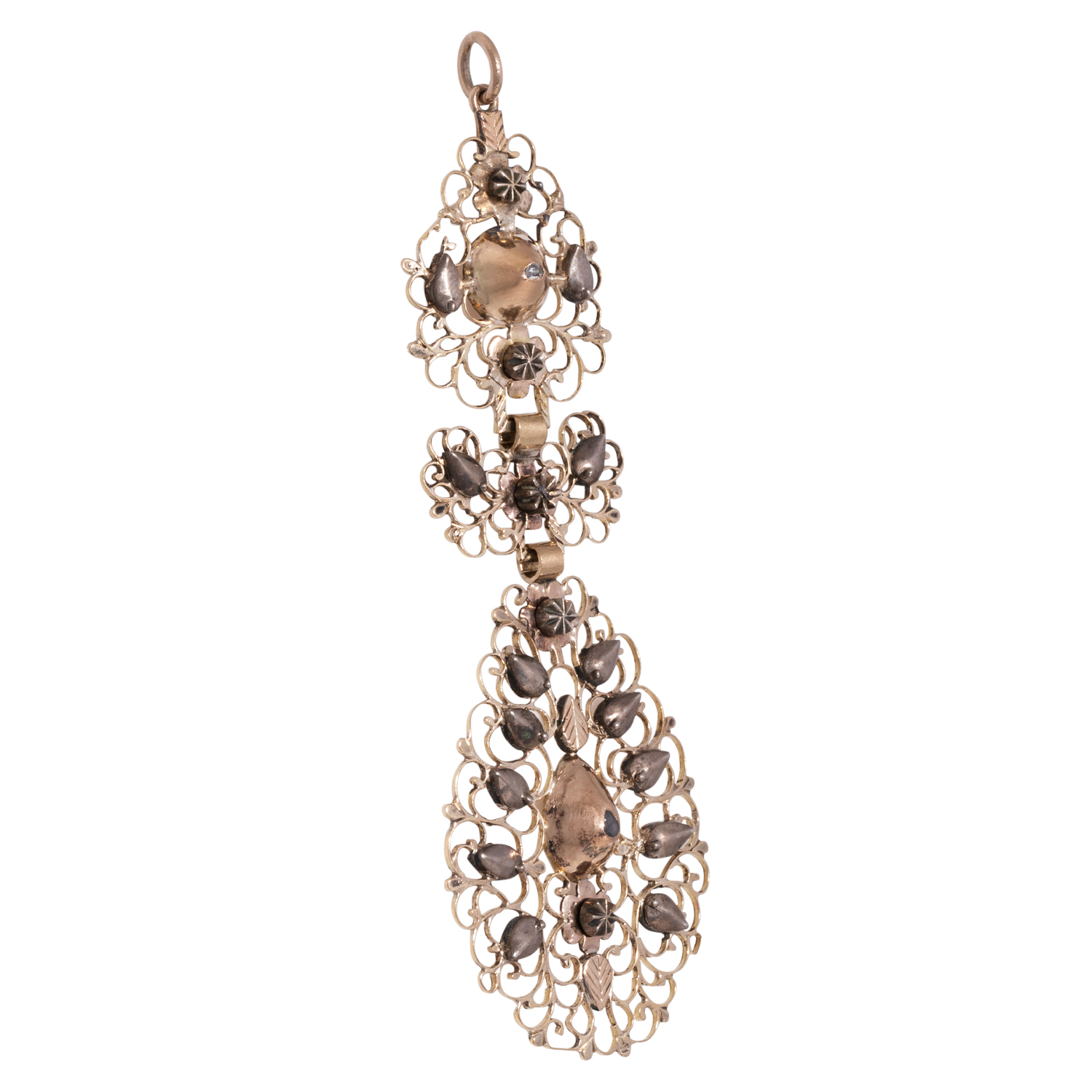 Classicism pendant with small rose-cut diamonds, 8K YG, onlays silver, 6.3 gr, L: ca. 7.5 dm, around 1800, pendant loop later, good condition consistent with age.