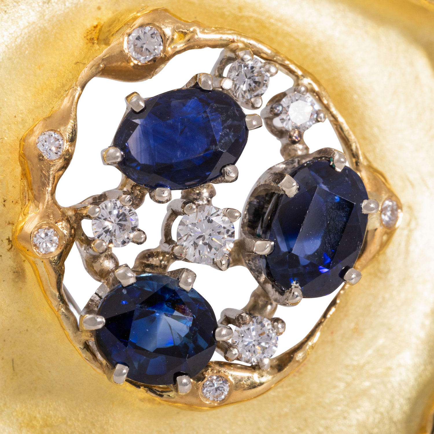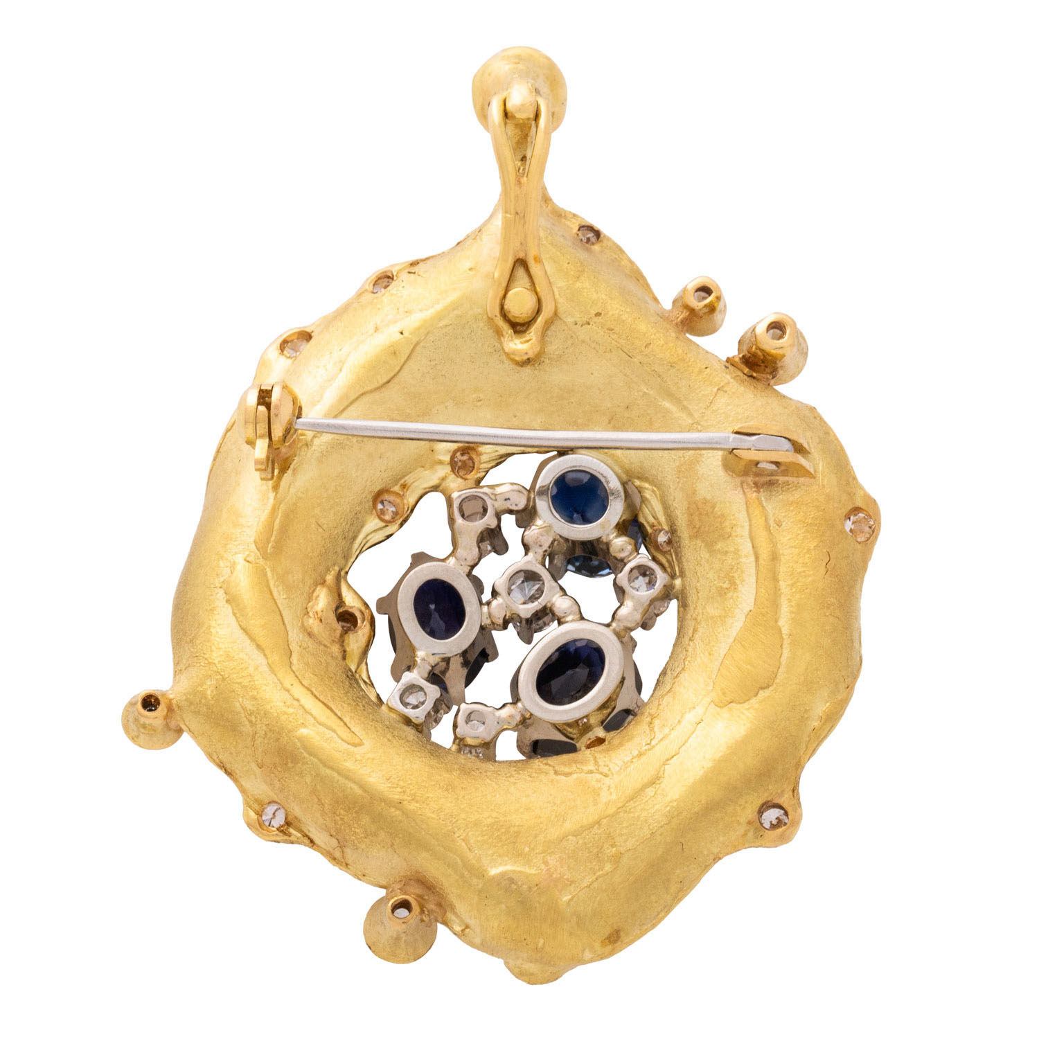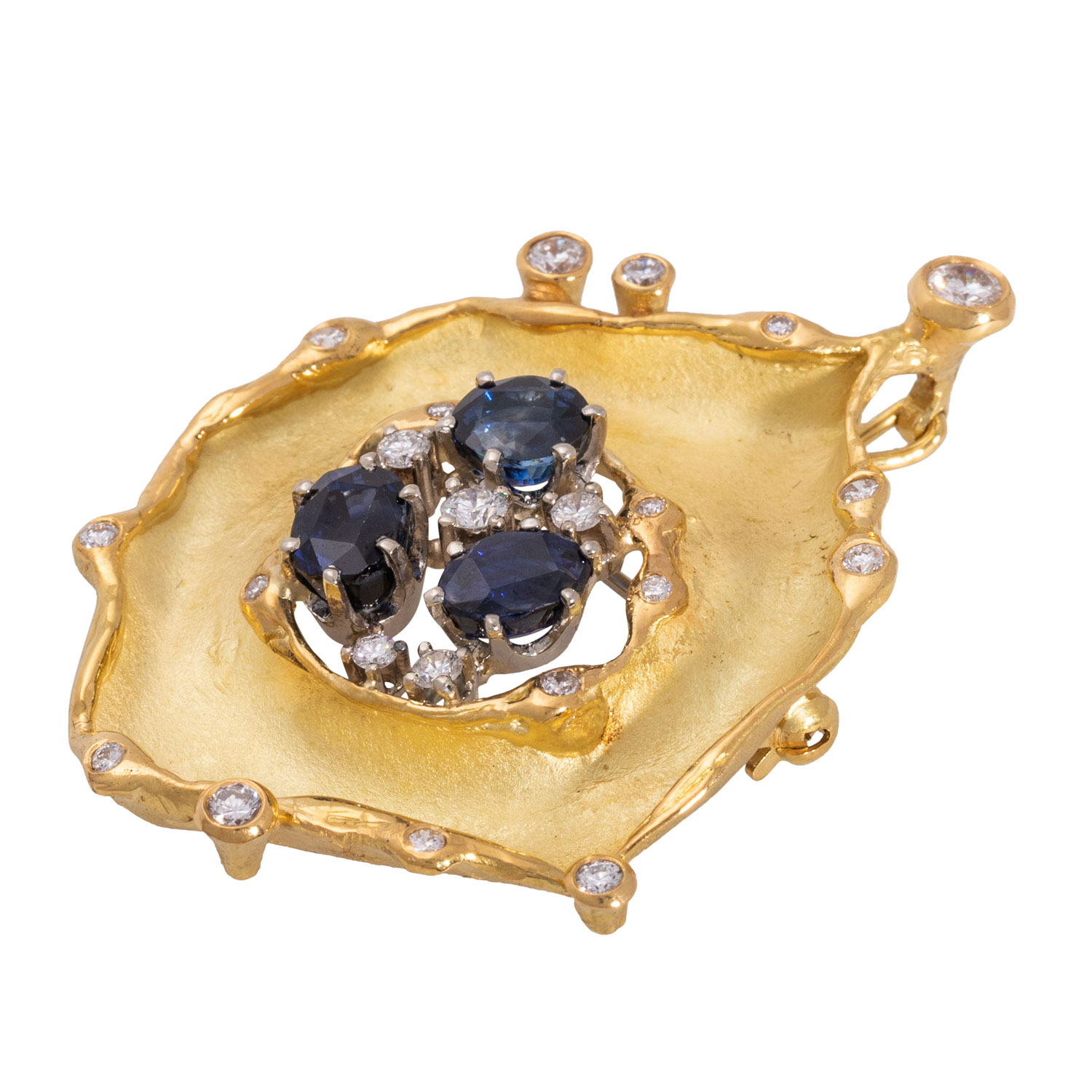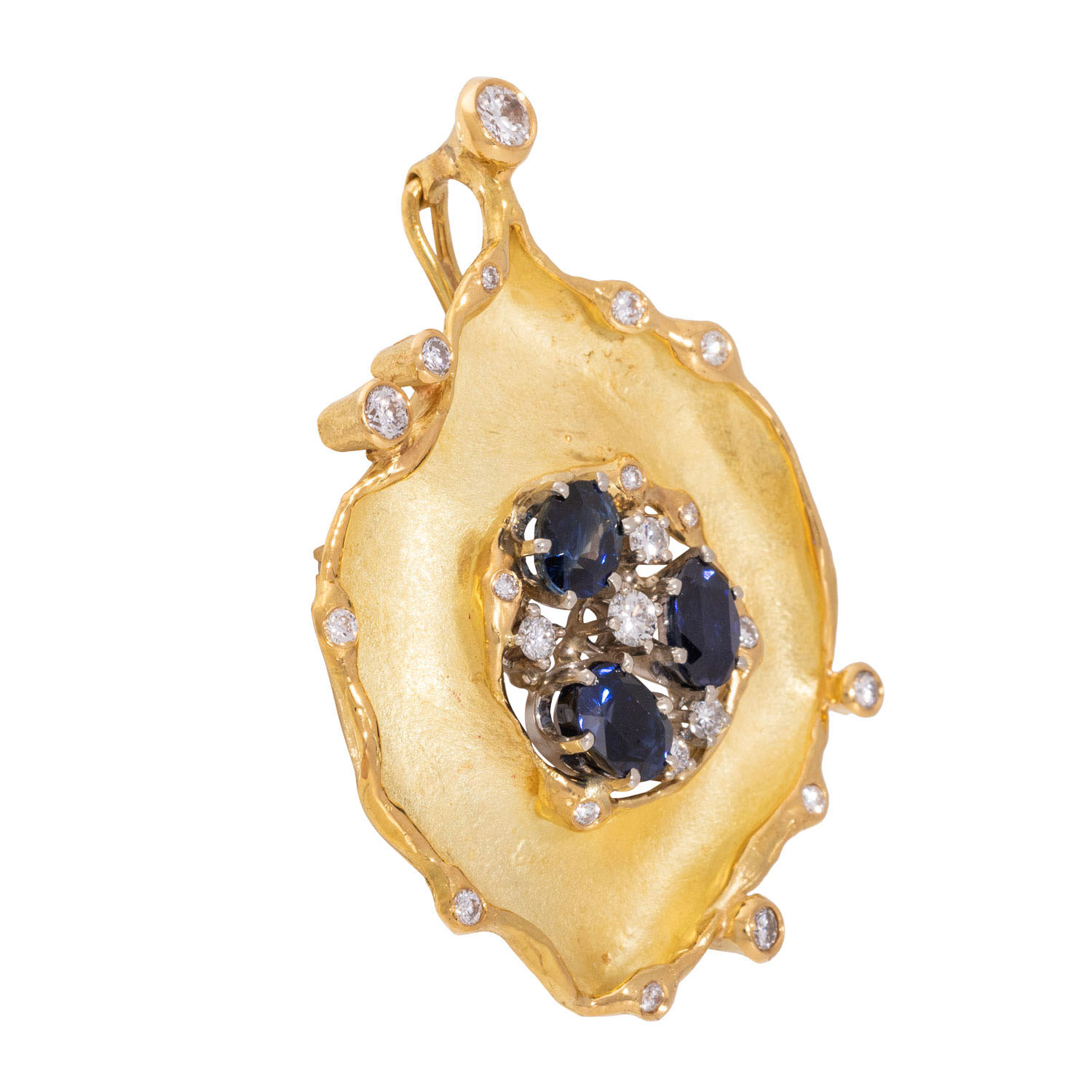 Clip pendant/brooch with 3 faceted sapphires and 22 brilliant-cut diamonds, totalling ca. 0.88 ct, central brilliant-cut diamond ca. 0.15 ct, ca. RW (F-G)/VS, oval-cut sapphires, totalling ca. 2.30 ct, fine hue, 18K yellow gold/white gold, 18.3 g, L: ca. 5.1 cm, W: ca. 4 cm, eyelet D: ca. 0.4 cm, 20th/21st century, minimal signs of wear, craftsmenship.