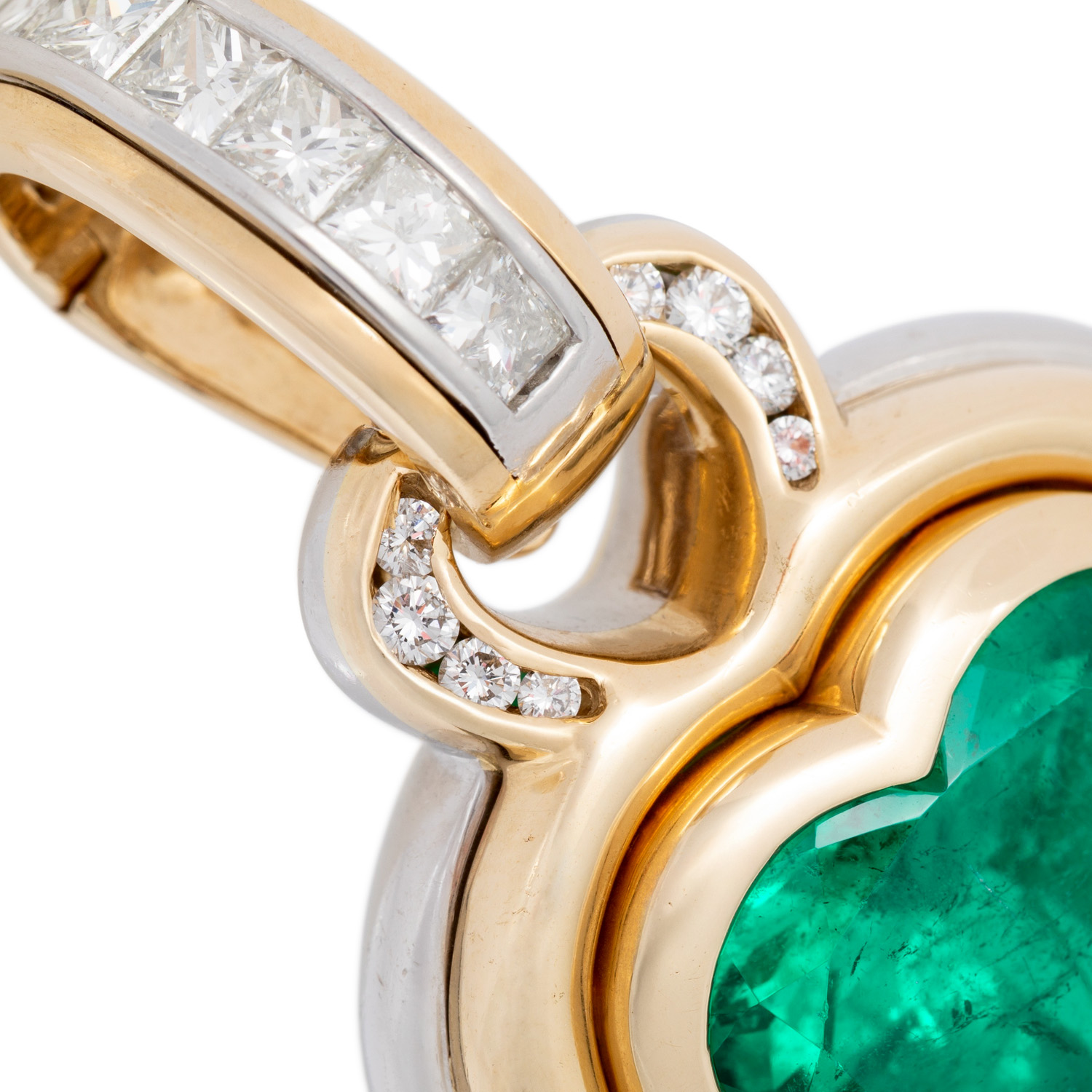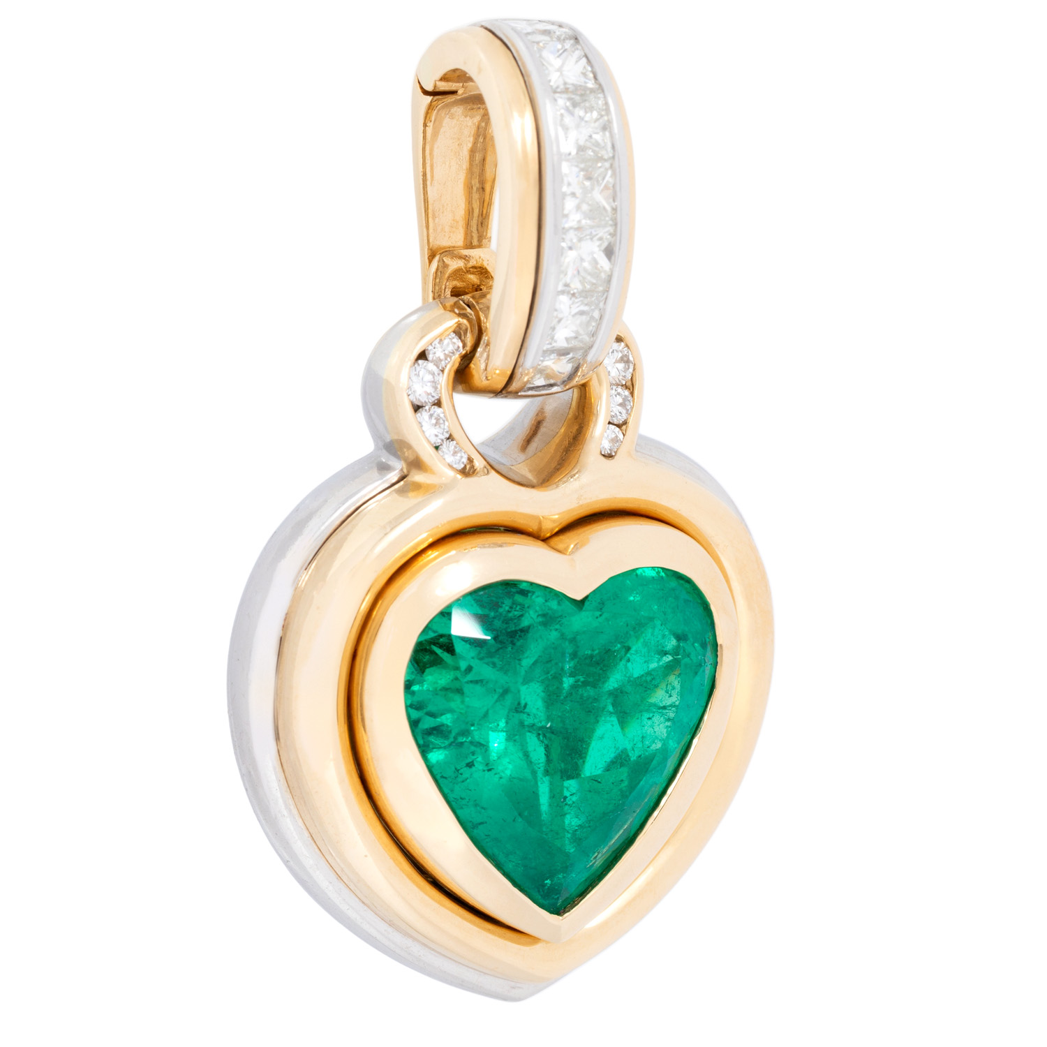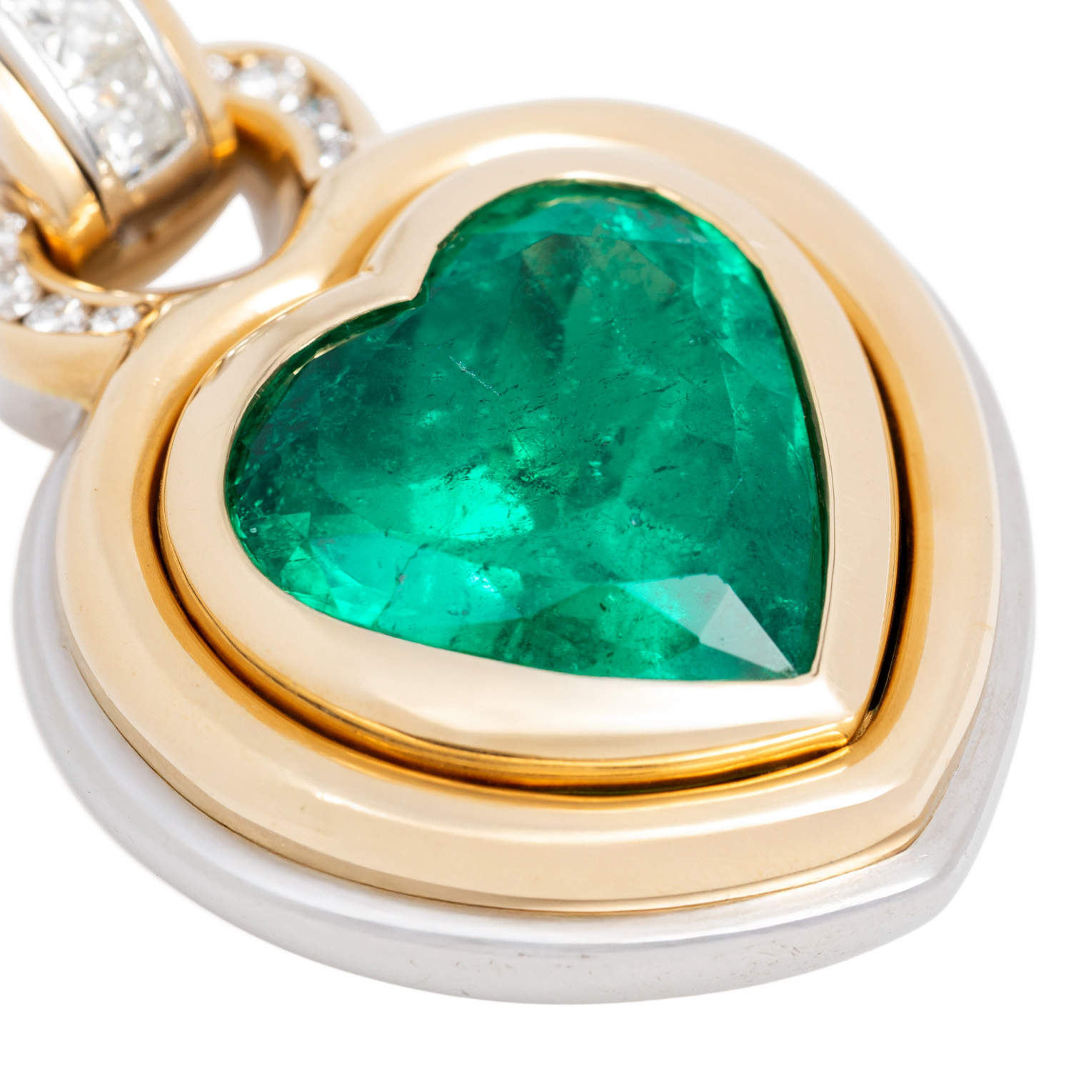 Clippendant set with heart-cut emerald, approx. 16.5 x 17 x 10.5 mm, approx. 13.17 ct (stamped), and 8 brilliant-cut diamonds totalling approx. 0.15 ct and 7 princess-cut diamonds totalling approx. 1.2 ct, good colour and clarity, YG/WG 18K, 28.4 g, 20th/21st century, signs of wear, emerald scratched, facet edges abraded and minimal chipped.