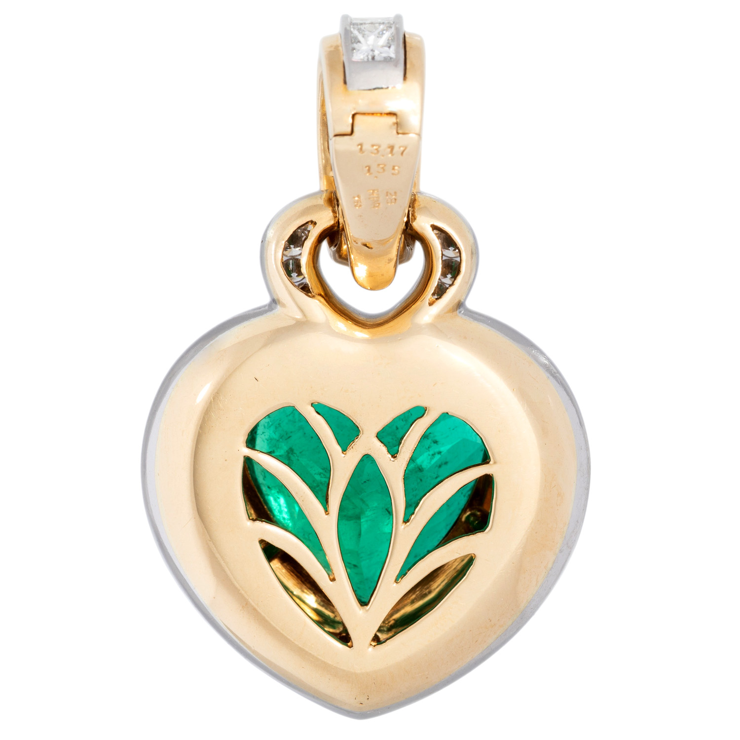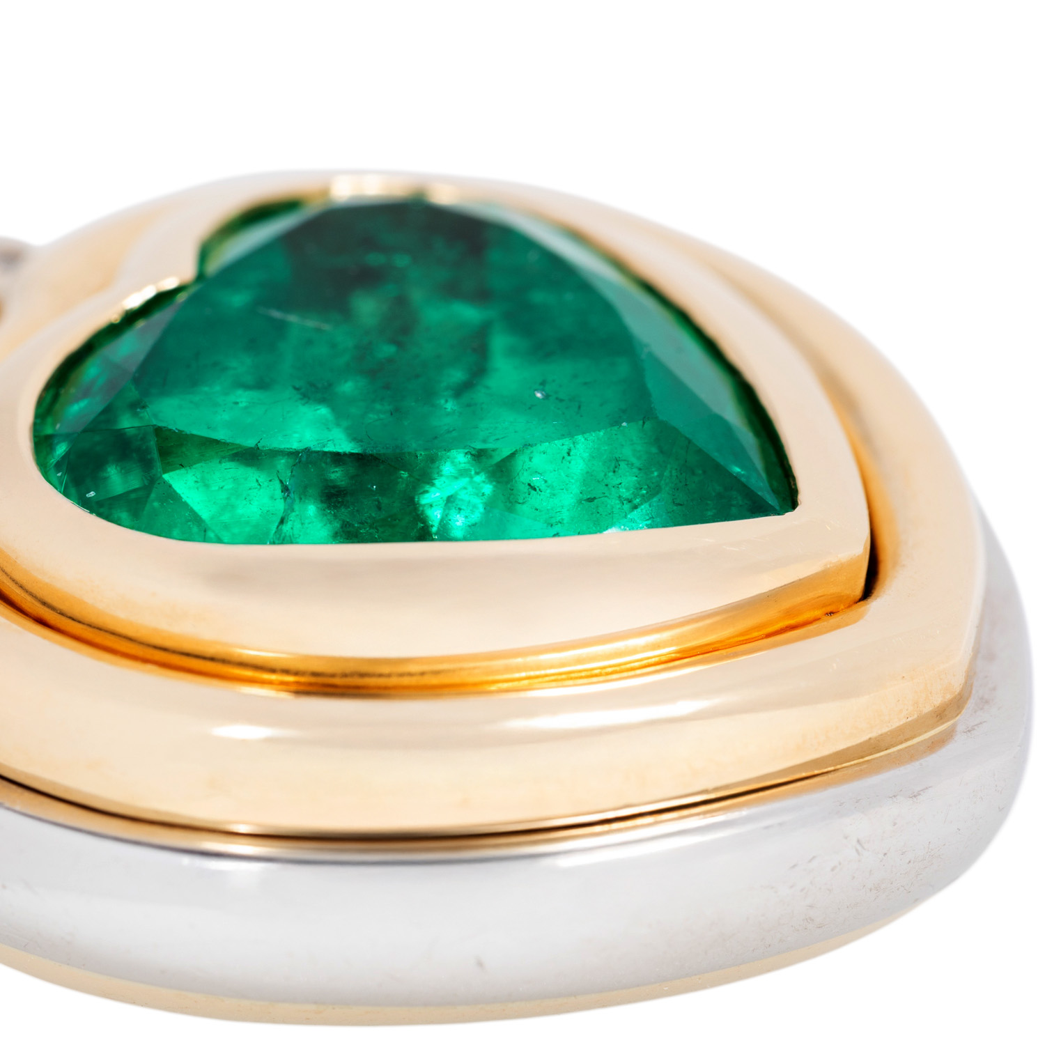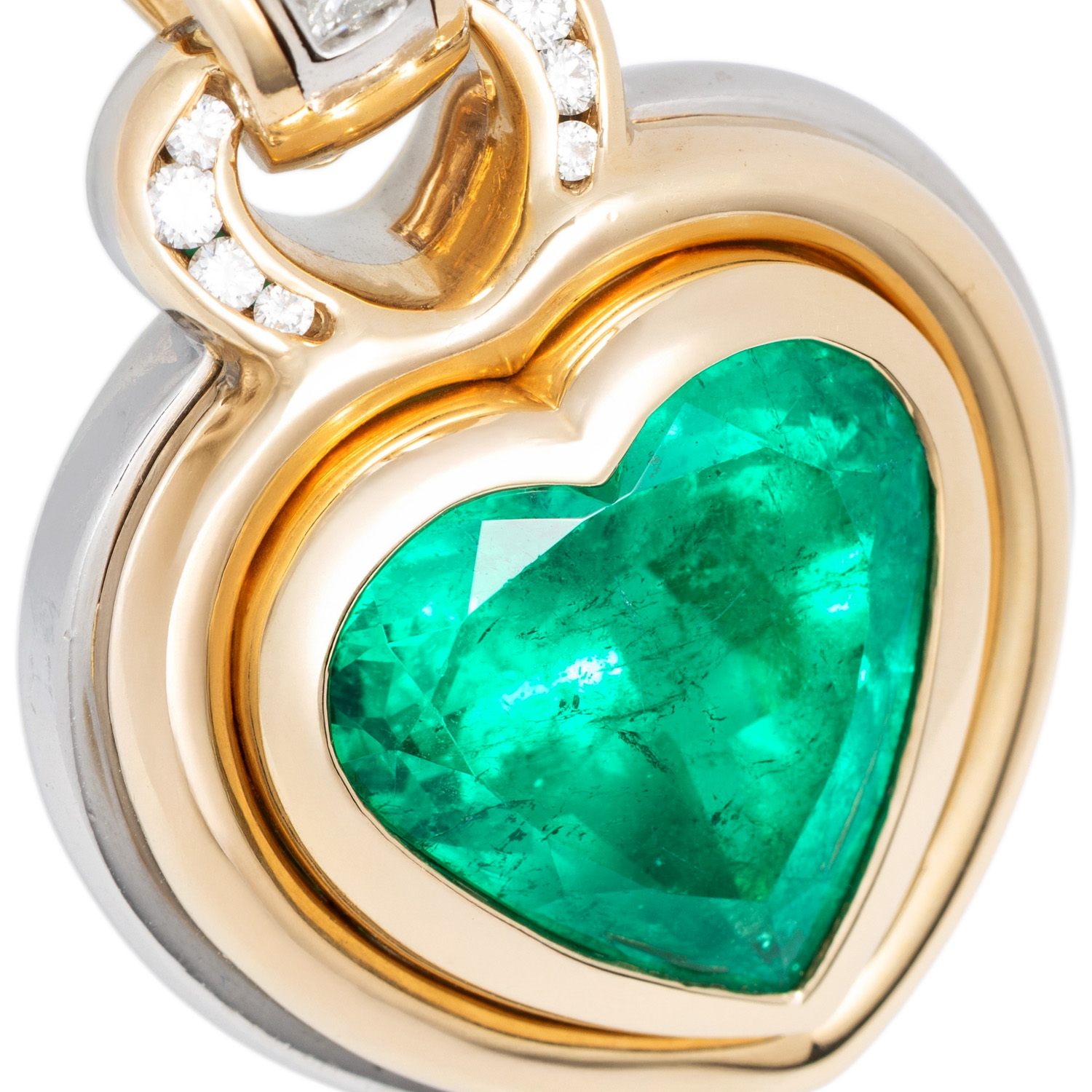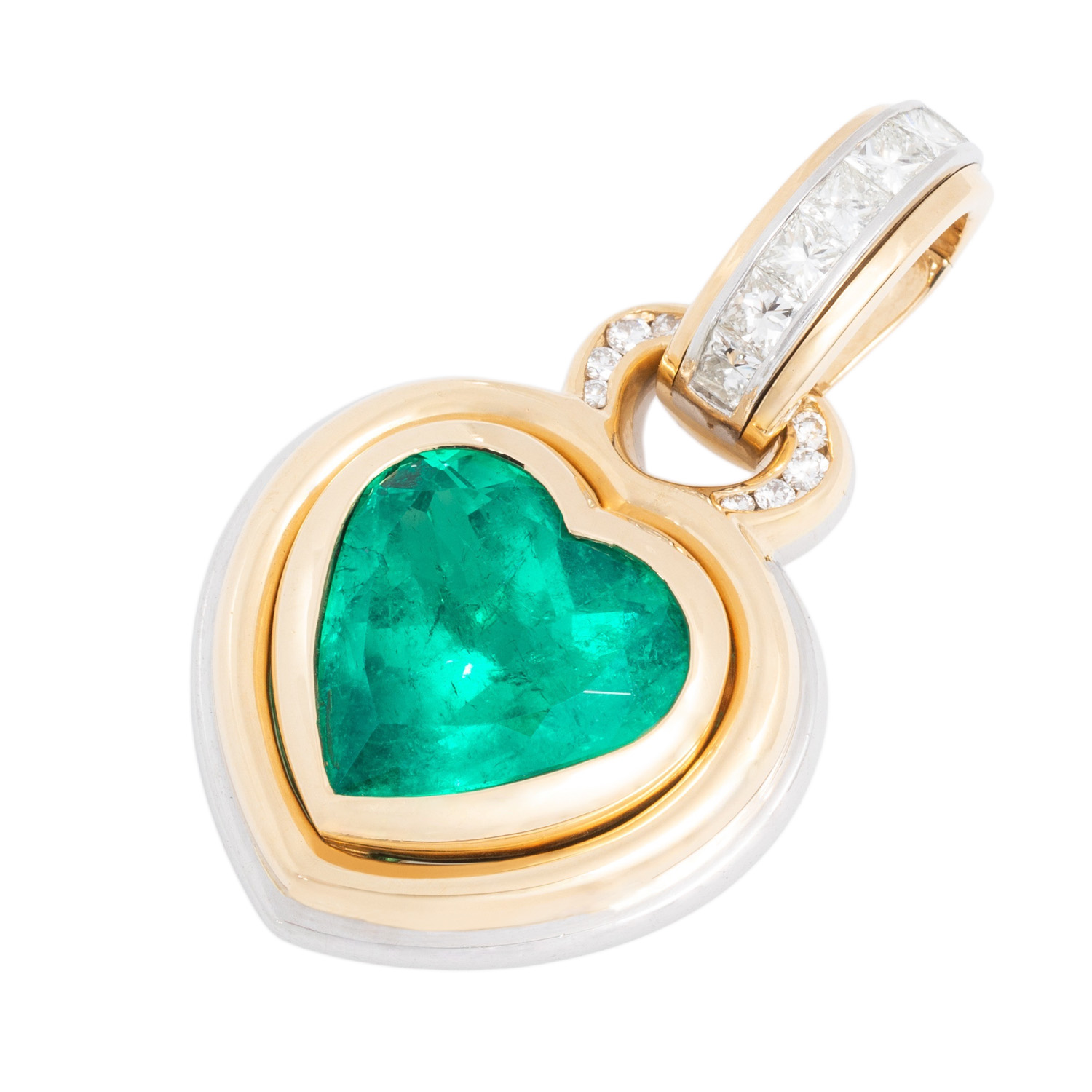 Clippendant set with heart-cut emerald, approx. 16.5 x 17 x 10.5 mm, approx. 13.17 ct (stamped), and 8 brilliant-cut diamonds totalling approx. 0.15 ct and 7 princess-cut diamonds totalling approx. 1.2 ct, good colour and clarity, YG/WG 18K, 28.4 g, 20th/21st century, signs of wear, emerald scratched, facet edges abraded and minimal chipped.