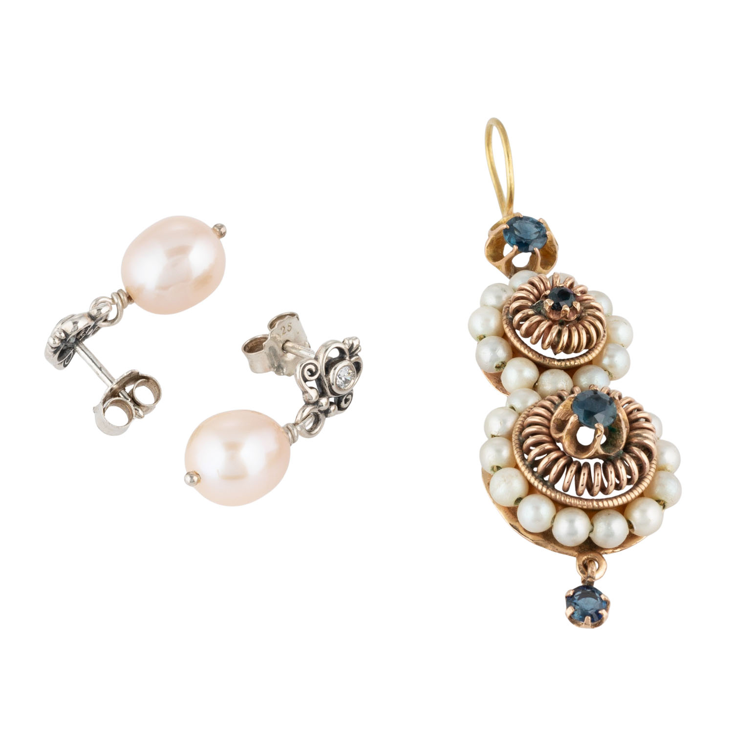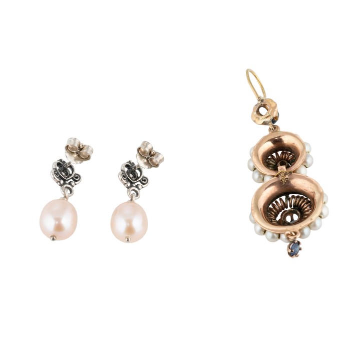 Bundle of pendant and earrings with sapphires, plastic pearls, cultured pearls and zirkonia, 12K yellow gold, 6.4 g, L: 5 cm and silver, 3.2 g, L: 2.2 cm, 20th century, signs of wear.