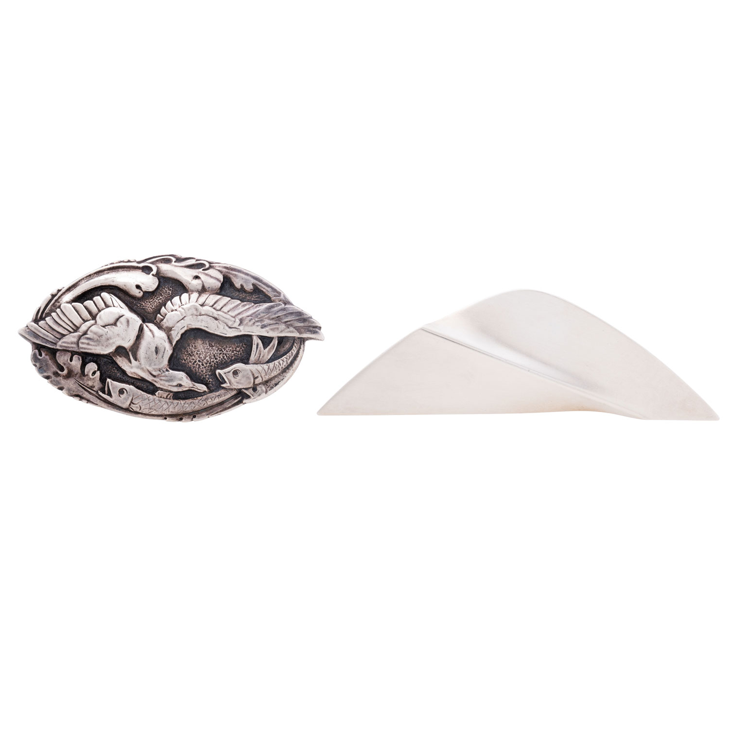Set silver jewelry composed of ring and two brooches, silver, 60 gr, ring size 59, 20th century, partly signed, signs of wear.
