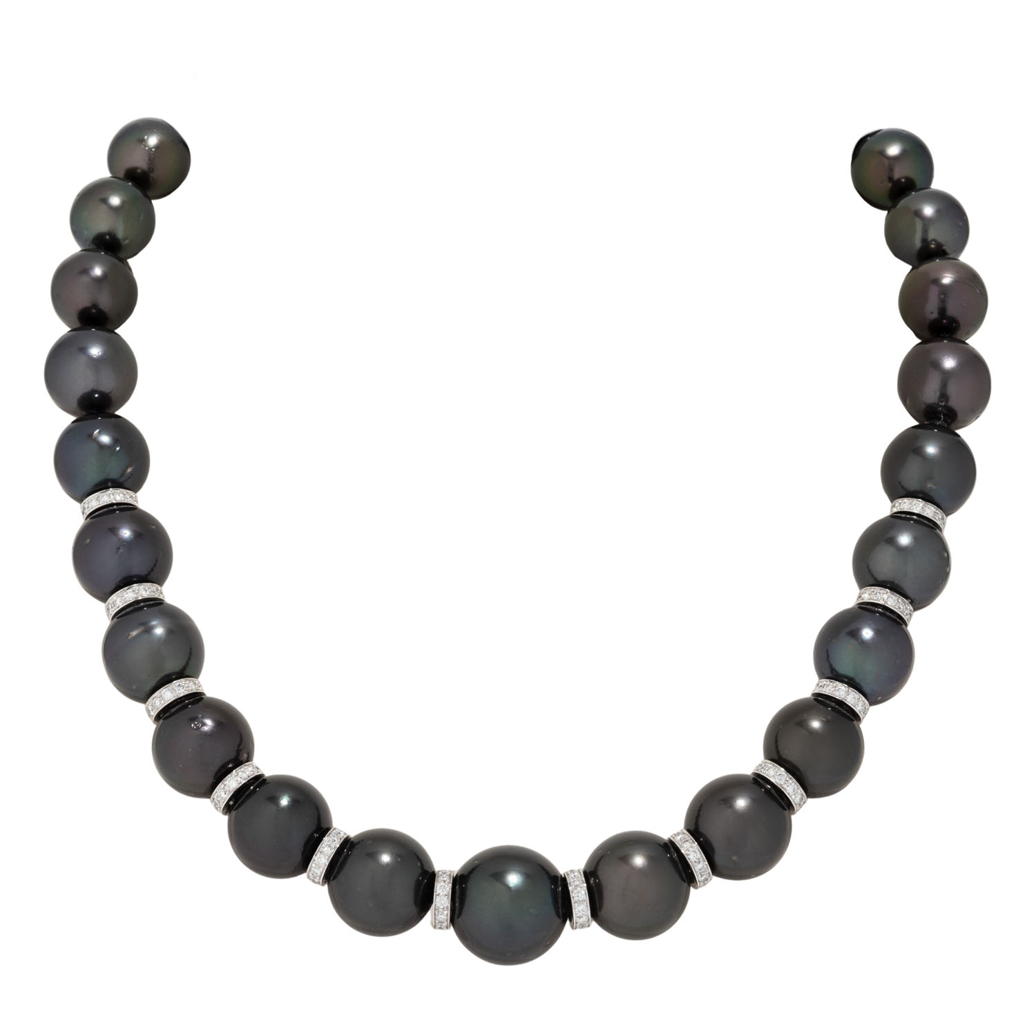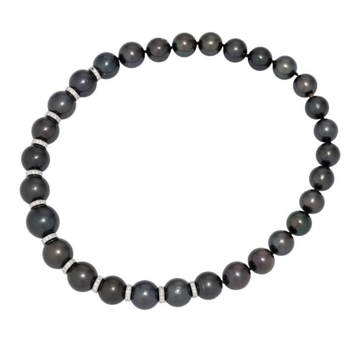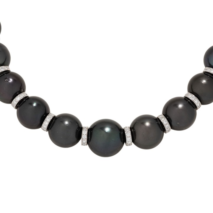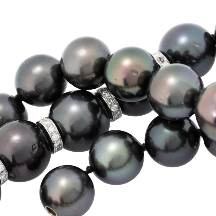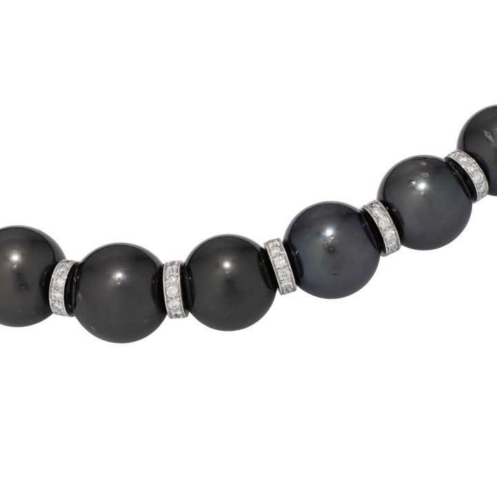Necklace with 30 Tahitian pearls and 12 spacer elements with brilliant-cut diamonds totalling ca. 3.40 ct, RW (G)/VS, black Tahitian cultured pearls with growth marks, D: 12–16.5 mm, elements WG 18K, with bayonet clasp integrated into the pearl. 117.5 g, L: 44 cm, 21st century, good condition, jeweller's certificate and jewellery case enclosed.
