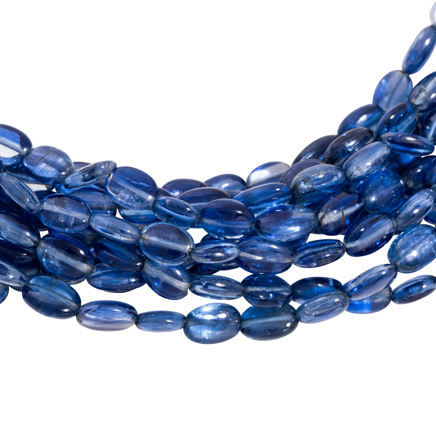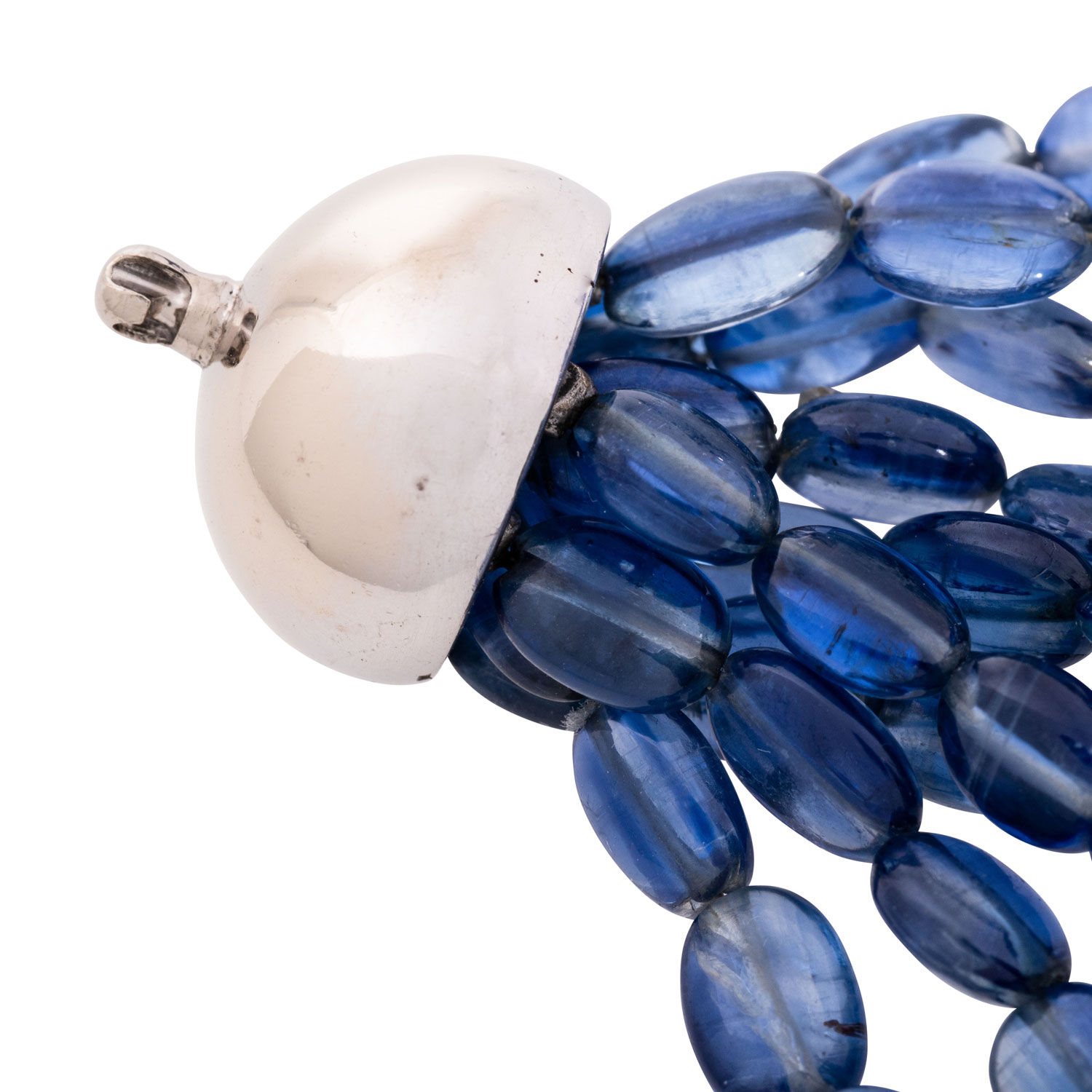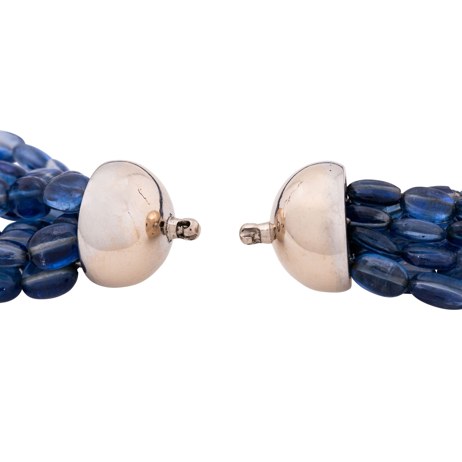 Necklace, 9 rows of sapphire beads, oval, ap. 6 - 7 mm, nice colour, caps in 18K white gold with bayonet fitting, 118,0 g, L: 42,5 cm, 20th/21st Jh., minimal signs of wear, fitting clasp part number 788204.