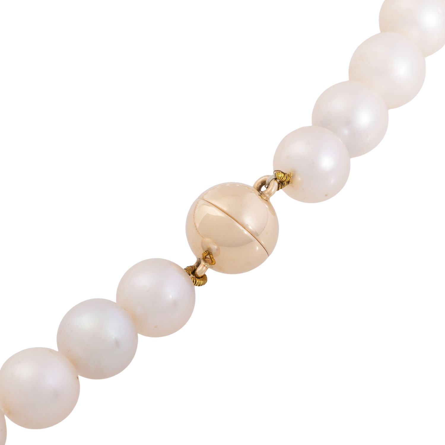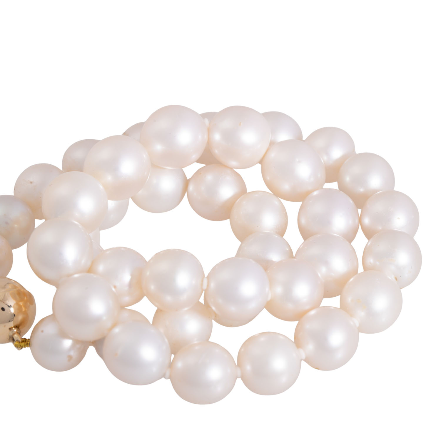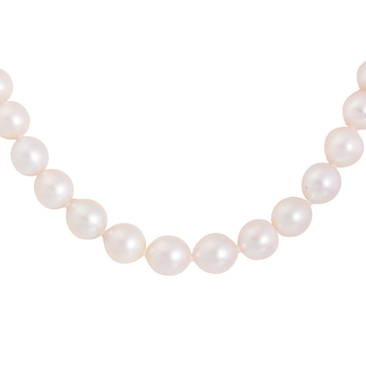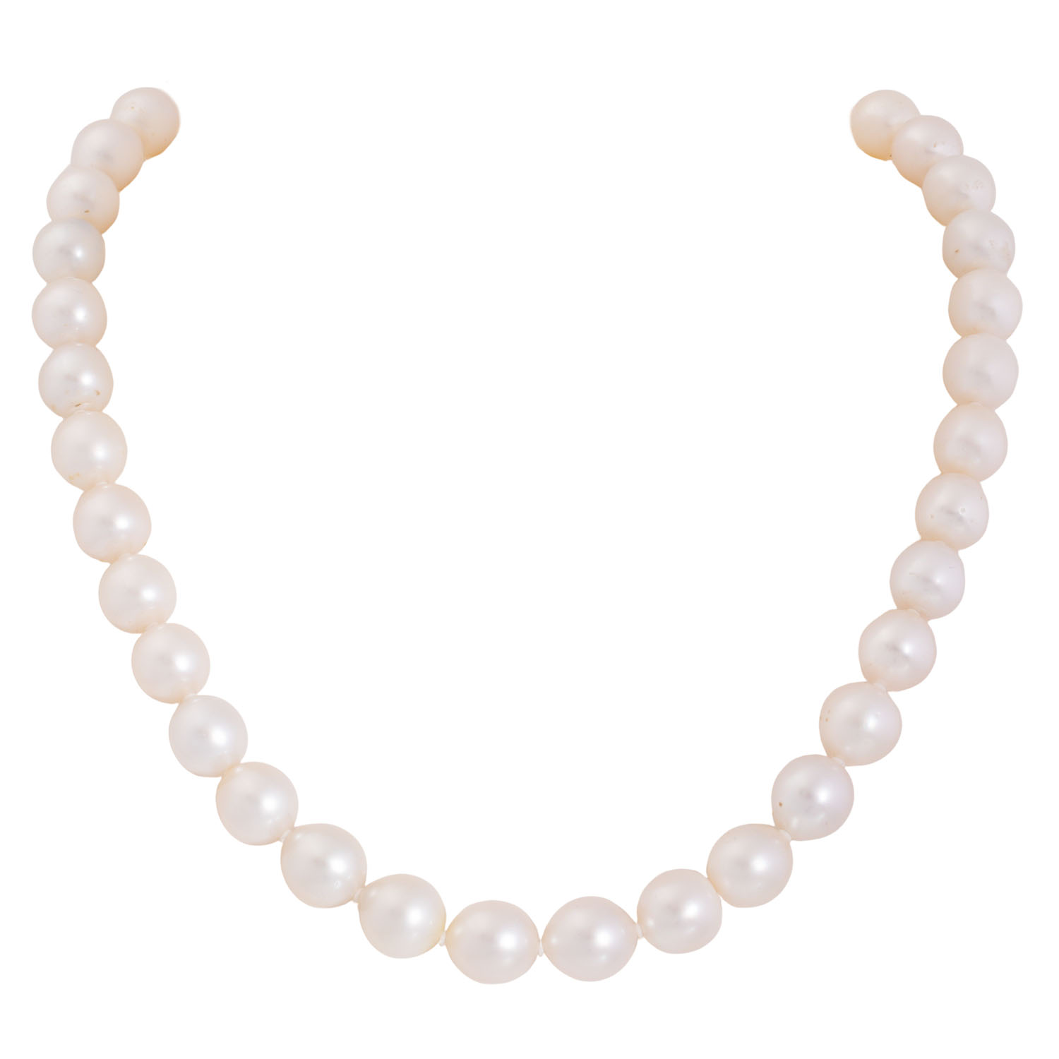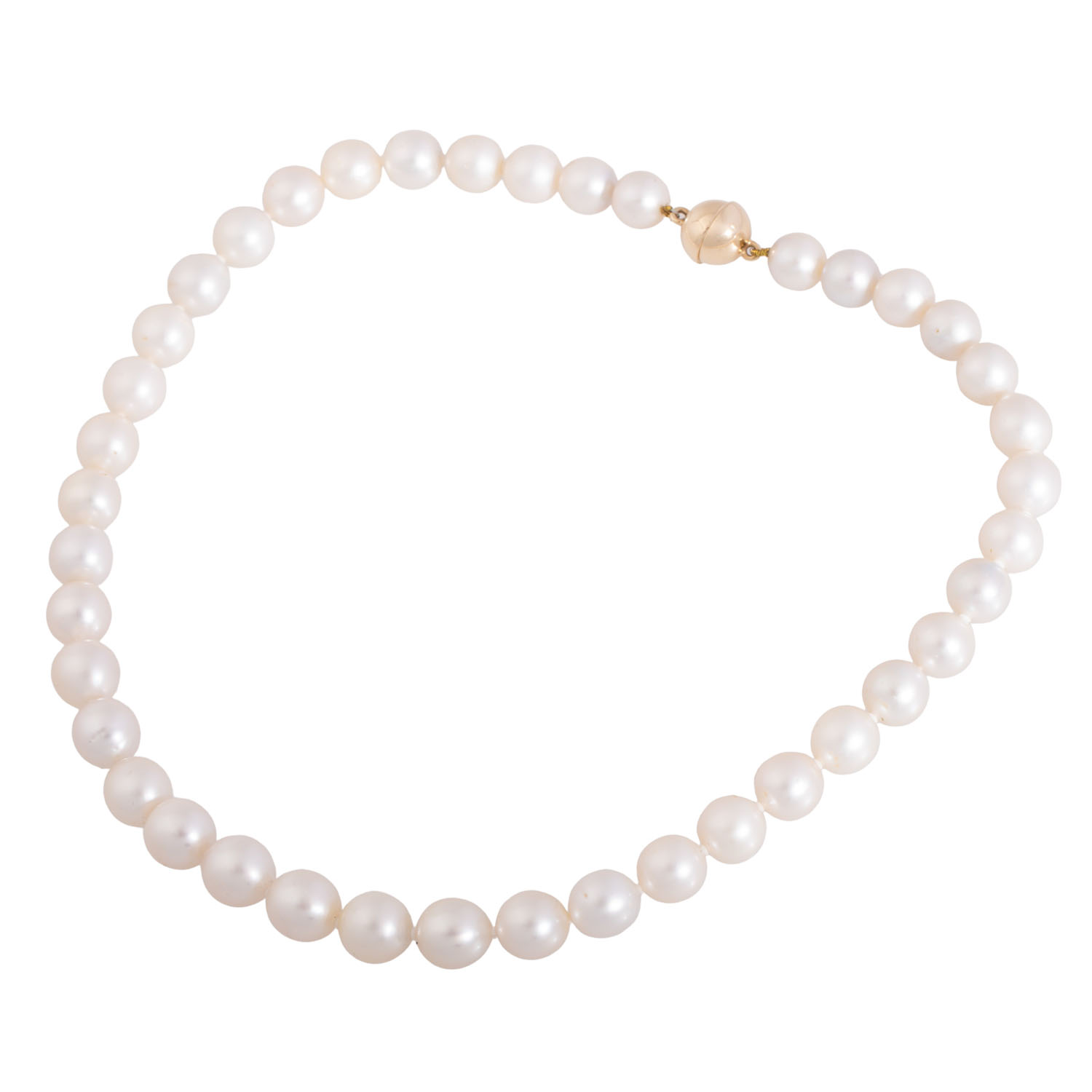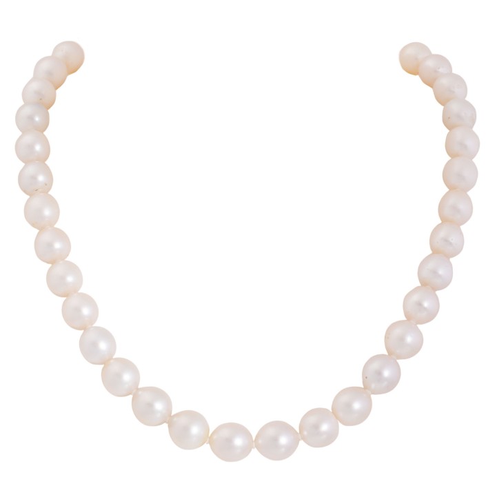 Necklace of South Sea cultured pearls slightly graduating from 10 to 11.5 mm, slightly not round and with signs of growth, magnetic clasp of 14K yellow gold, 11 mm, 21st century, minor signs of wear, jewellers certificate and sales receipt (5,500 €, 2016), included.