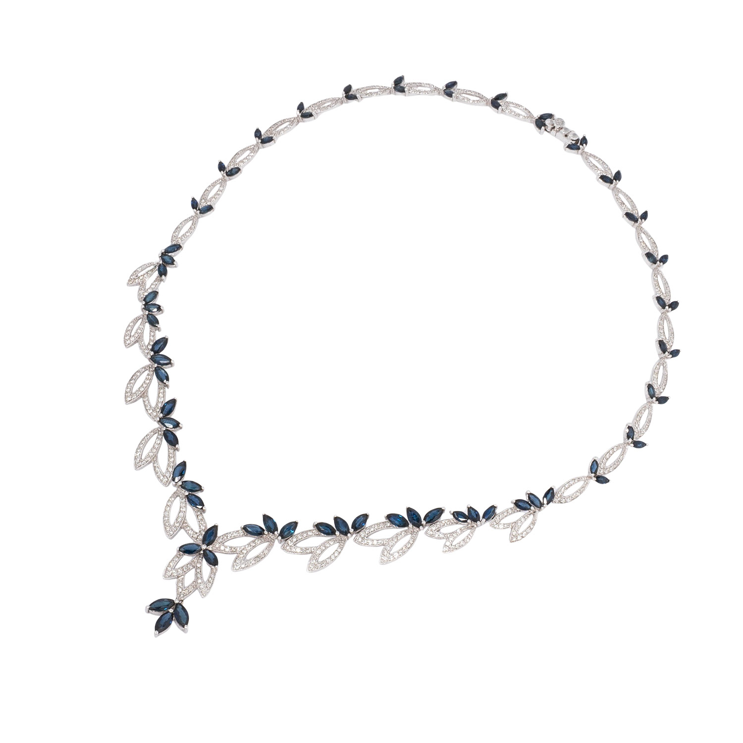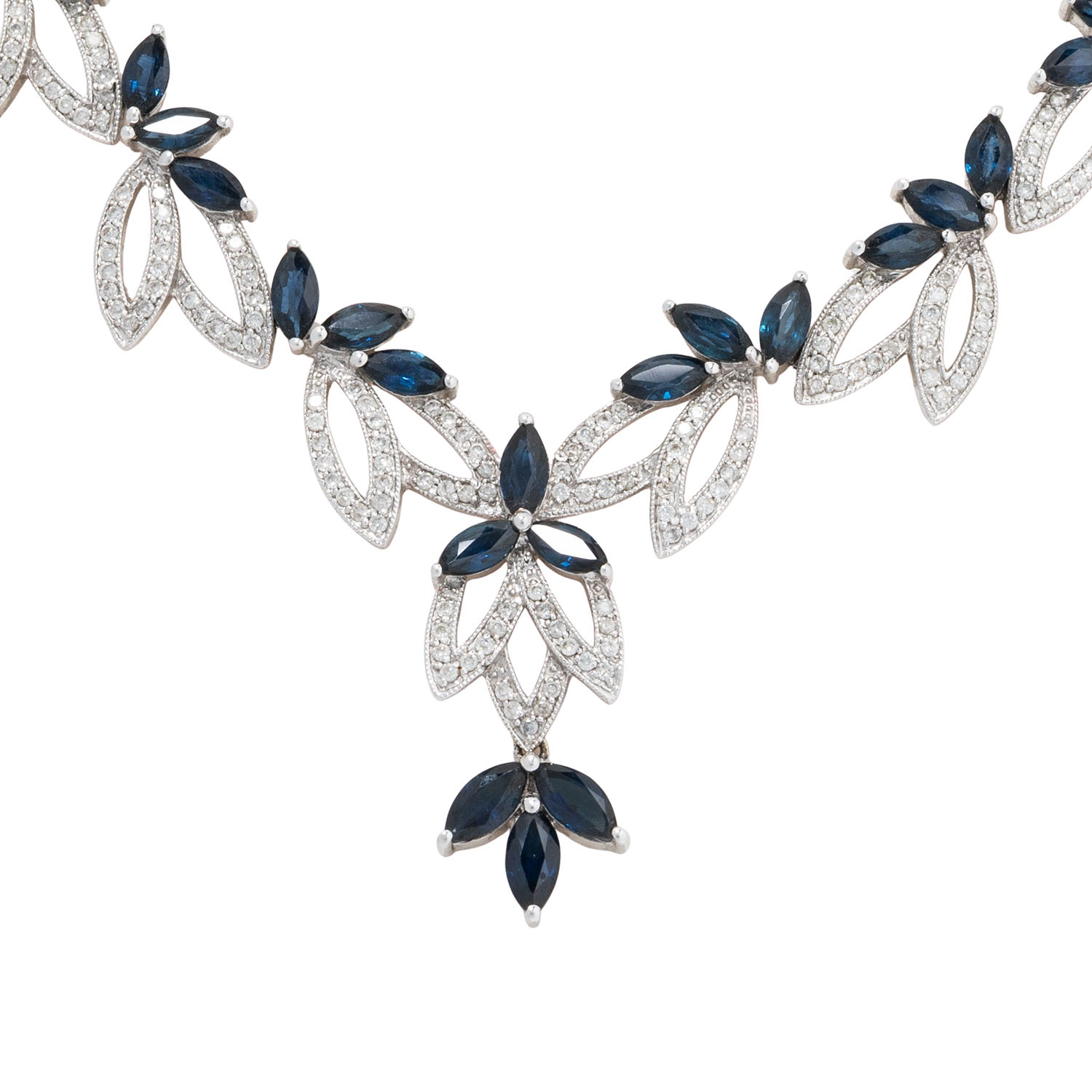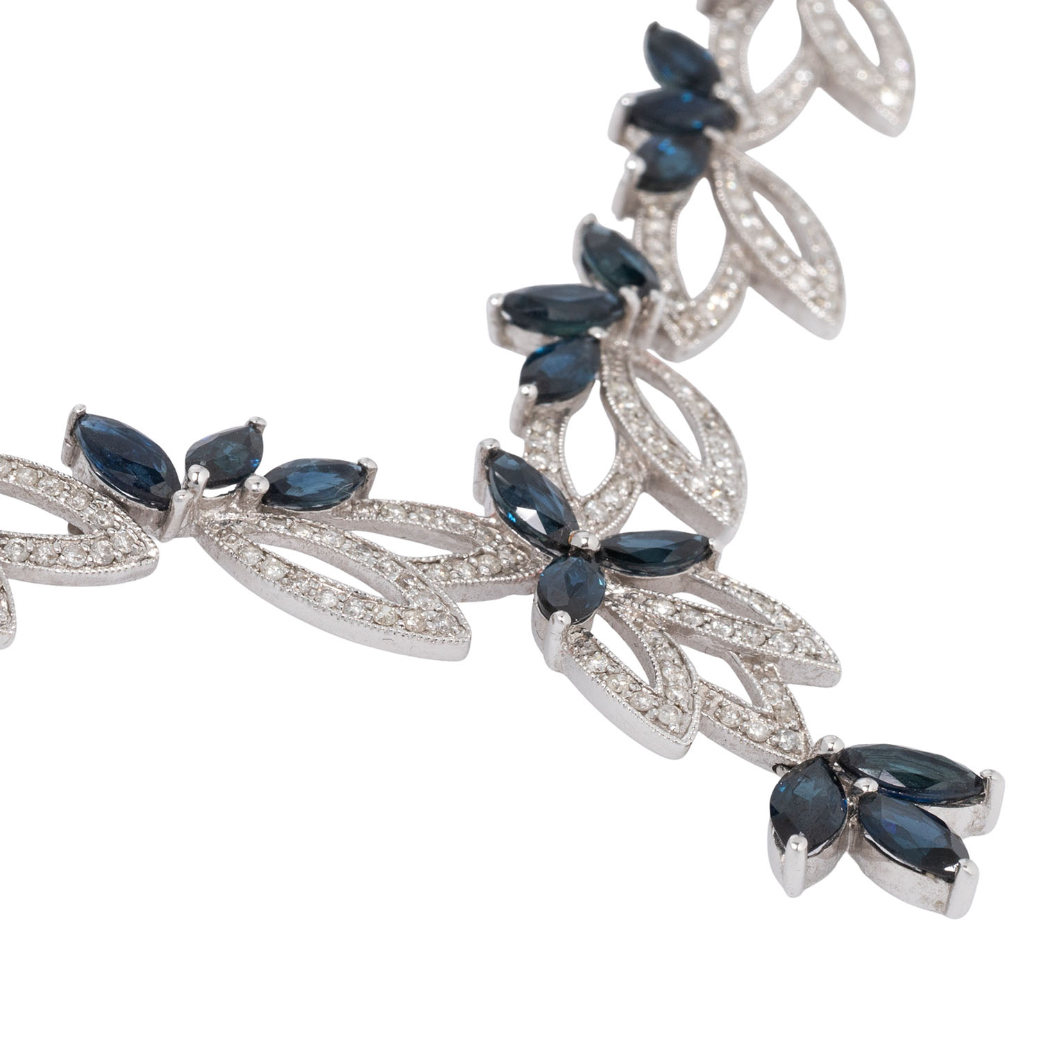 Necklace with diamonds and sapphires, brilliant-cut diamonds totaling 2.4 ct and sapphires, navette, faceted, totaling 14.3 ct, 18K white gold, 31.8 g, length: approx. 37 cm, 20th/21st century, stone weights engraved. Case included. Very good condition.