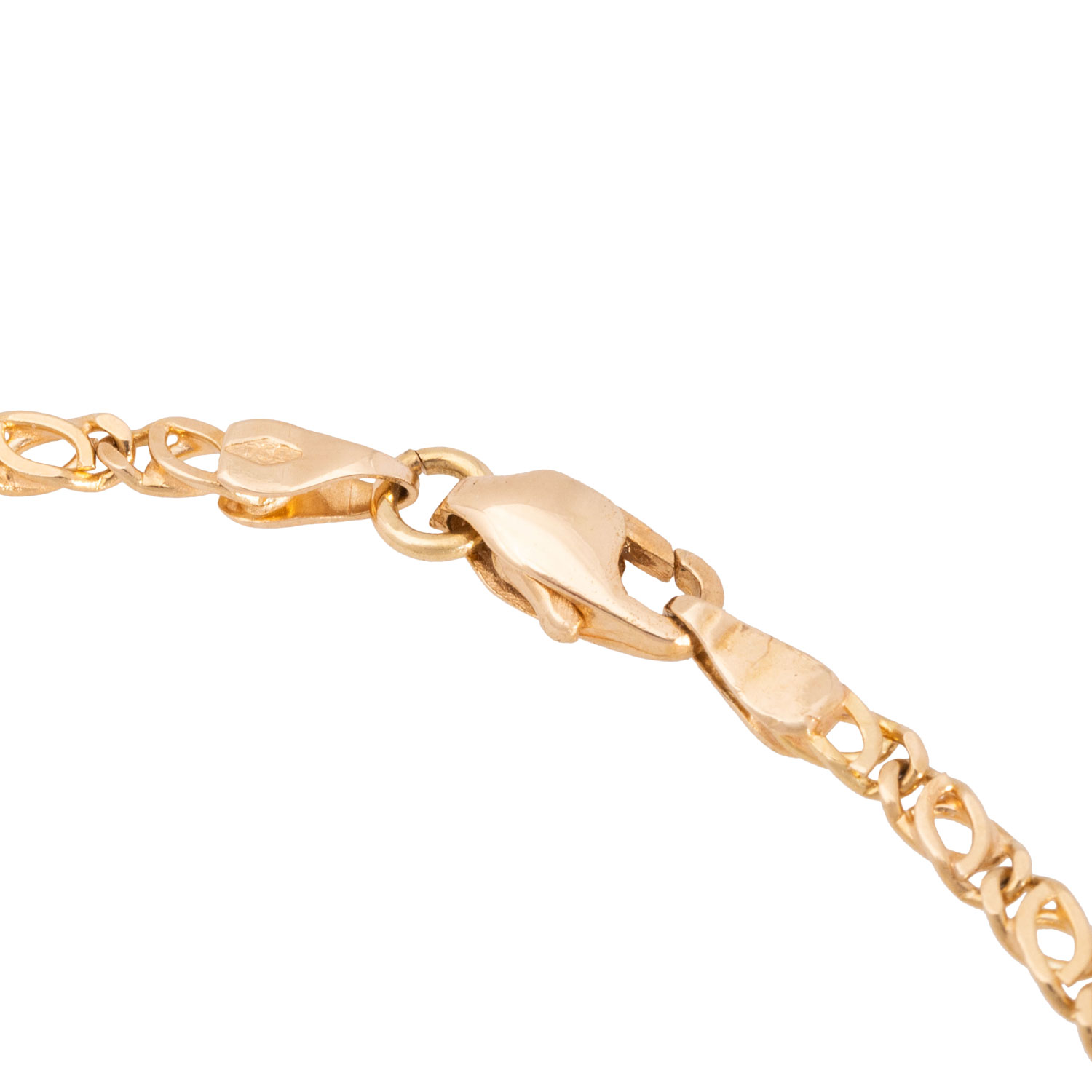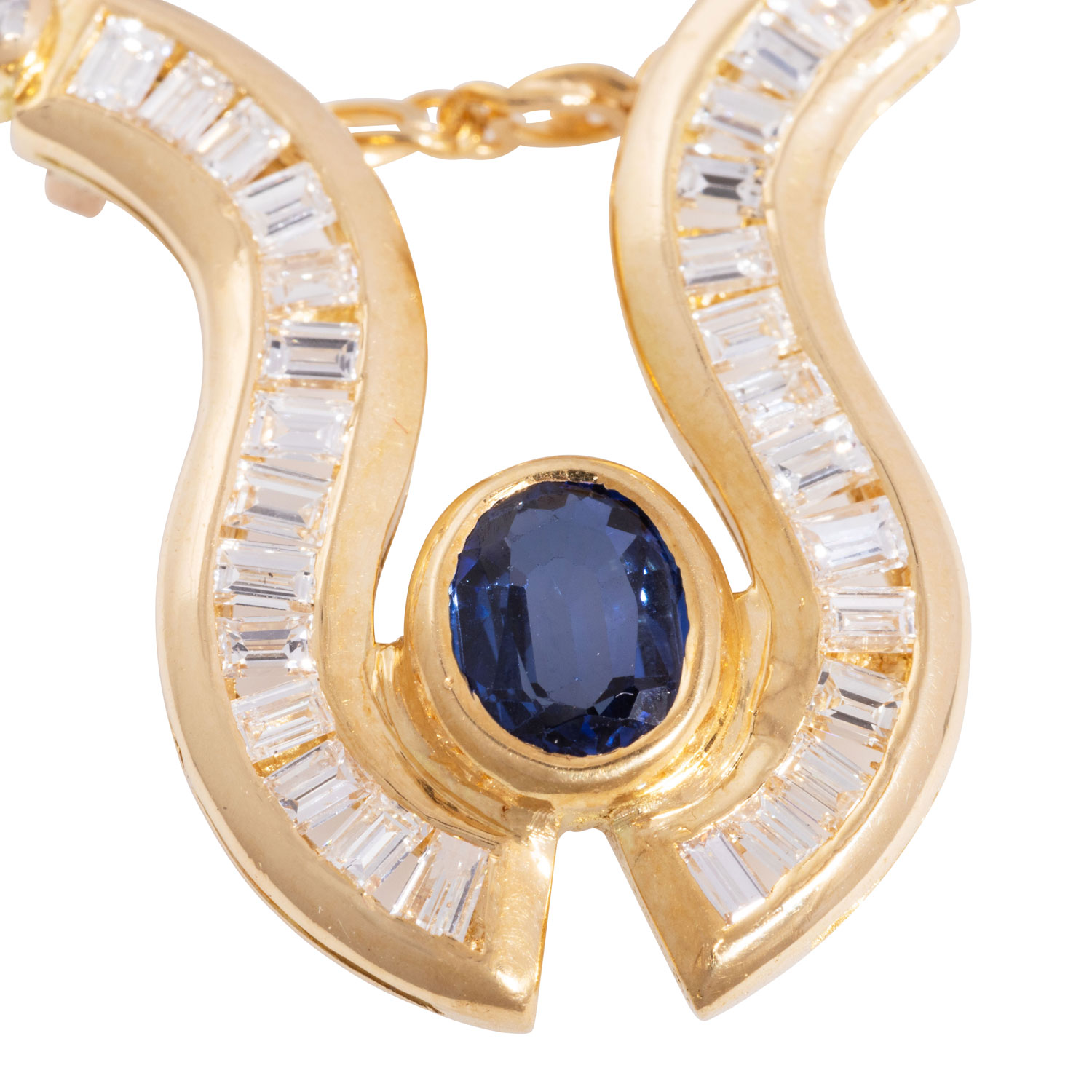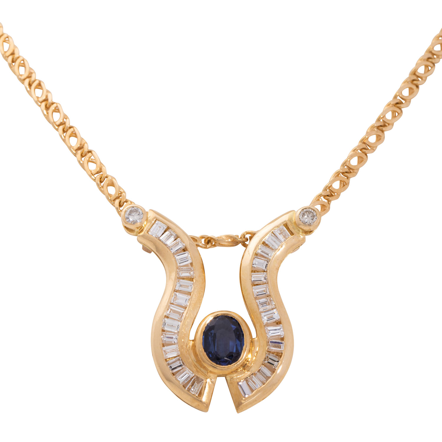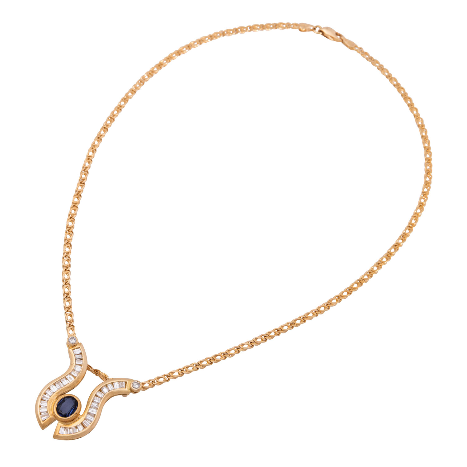 Necklace with oval faceted sapphire and baguette- and brilliant-cut diamonds totalling ca. 1.5 ct, medium colour and clarity, pendant 2.7x2.5 cm, backwards with 2 loops, sewed on a fantasy-pattern necklace L: 40 cm, W: 2.5 mm, 18K yellow gold, 14.7 g, late 20th century, signs of wear, sapphire slightly abraded.