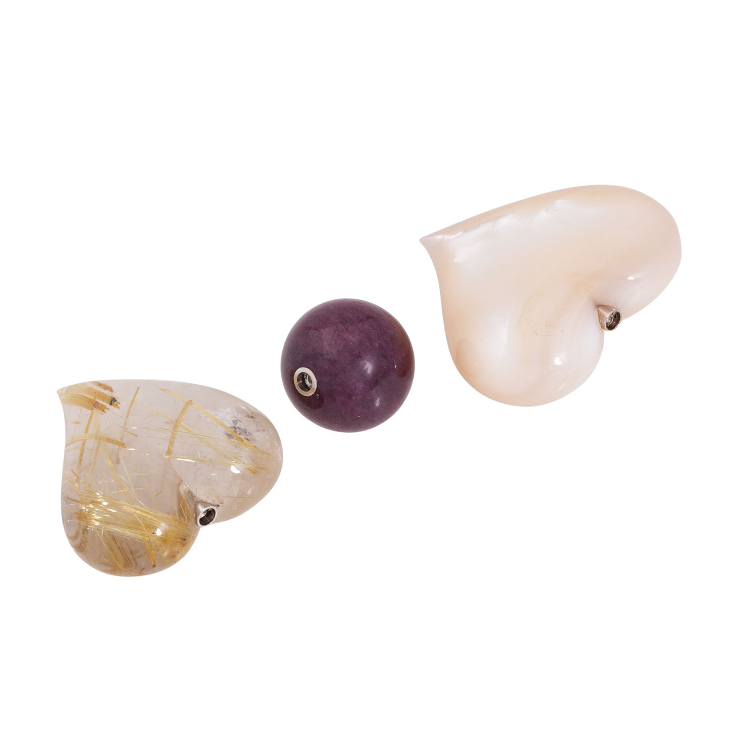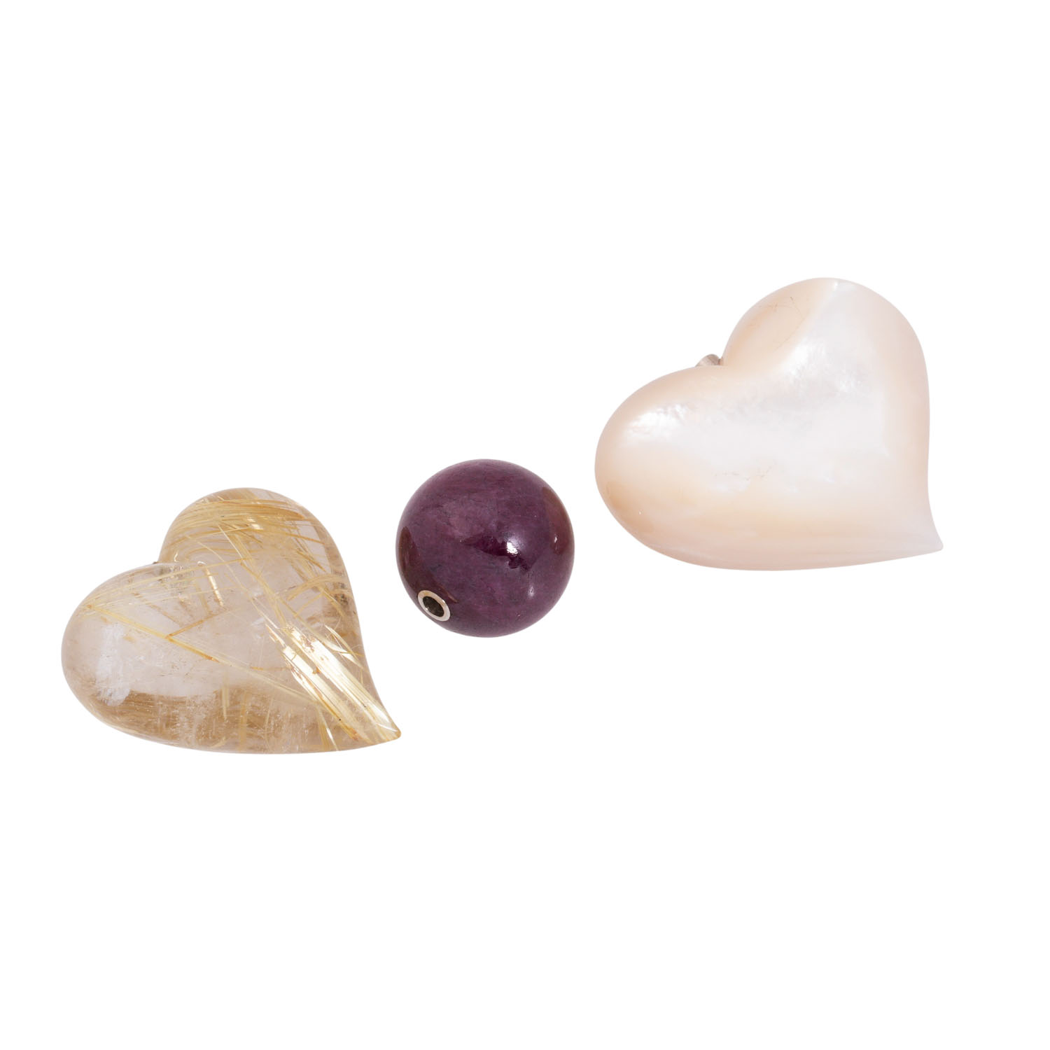 Bundle of 2 heart pendants and 1 clasp with bayonet catches of 18K white gold, clasp of ruby D: 1.8 cm, 1 heart of mother of pearl 3.8 cm, 1 heart og rutile quartz 3.3x3.6 cm, 20th/21st century, minor signs of wear.