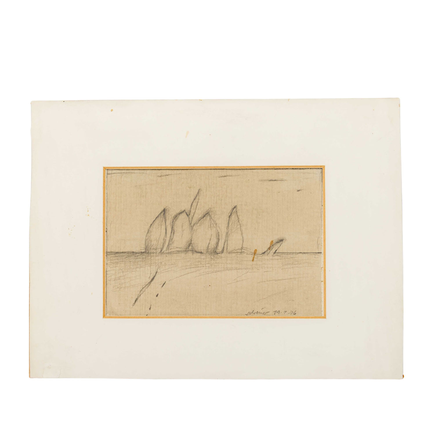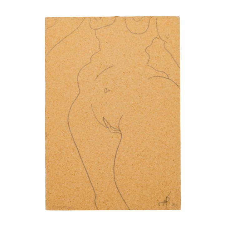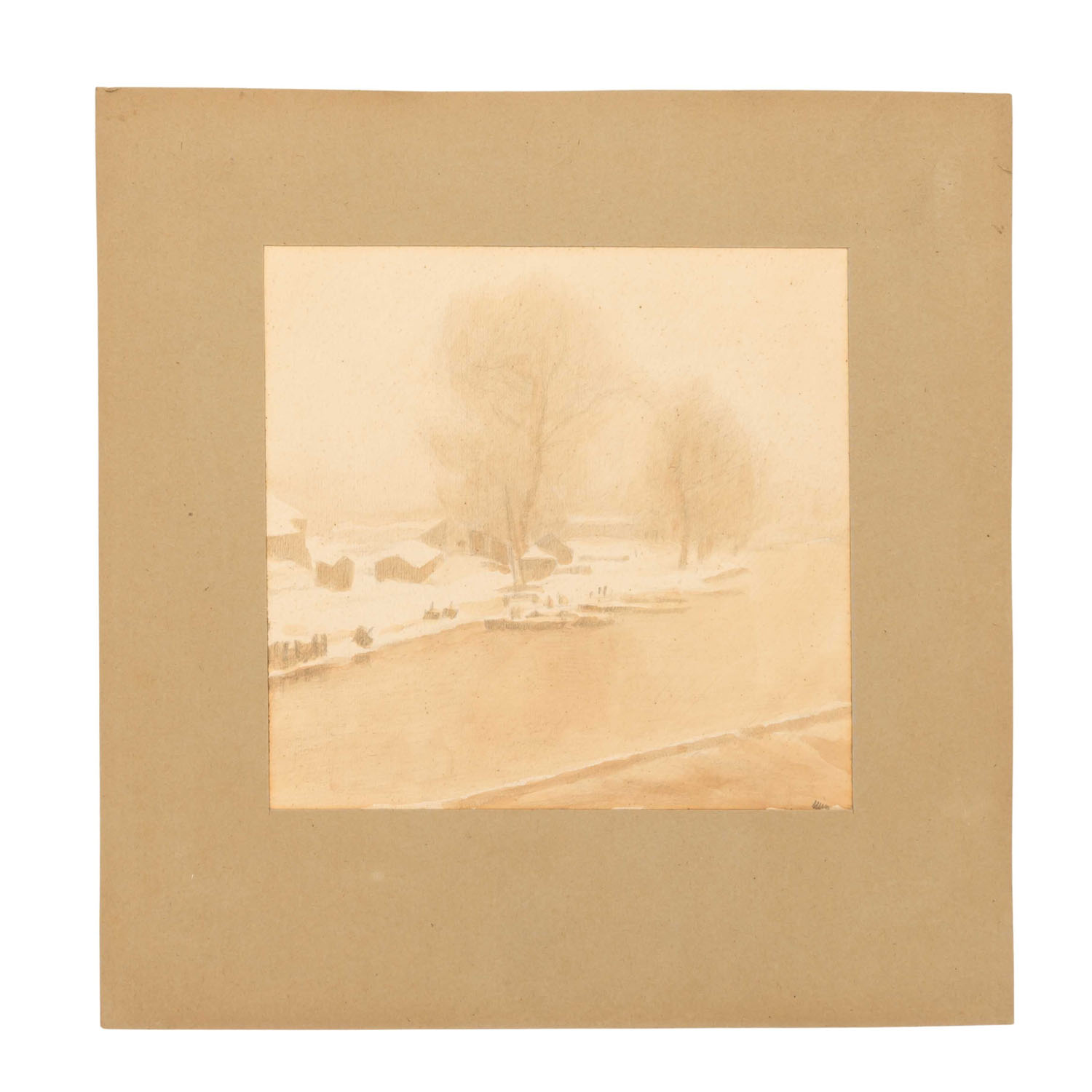 COLLECTION OF 5 DRAWINGS FROM THE 20TH CENTURY, 1.) LÉON VOGUET (1879-?), ‘Seated Female Nude’, inscribed in sepia at the top left to Dr. Grougé and labelled, 2.) ALBERT HEIM (1890-?), ‘Esslingen am Neckar, view of the Entress boat rental from the water’ in winter, probably 1914-18, signed, washed sepia over pencil, glued in passe-partout, outer dimensions approx. 26.5x25.5 cm; 3.) HANS SCHREINER (1930-2023), 2 landscapes, each signed and dated 1976, each pencil/paper, HxW: approx. 11x15 cm each, each in passe-partout; 4.) Monogrammist MP (?), ‘Female Nude’, pencil/cardboard, monogrammed and dated 1990, HxW: approx. 15x11 cm. Each with signs of age, browned, some slight staining.