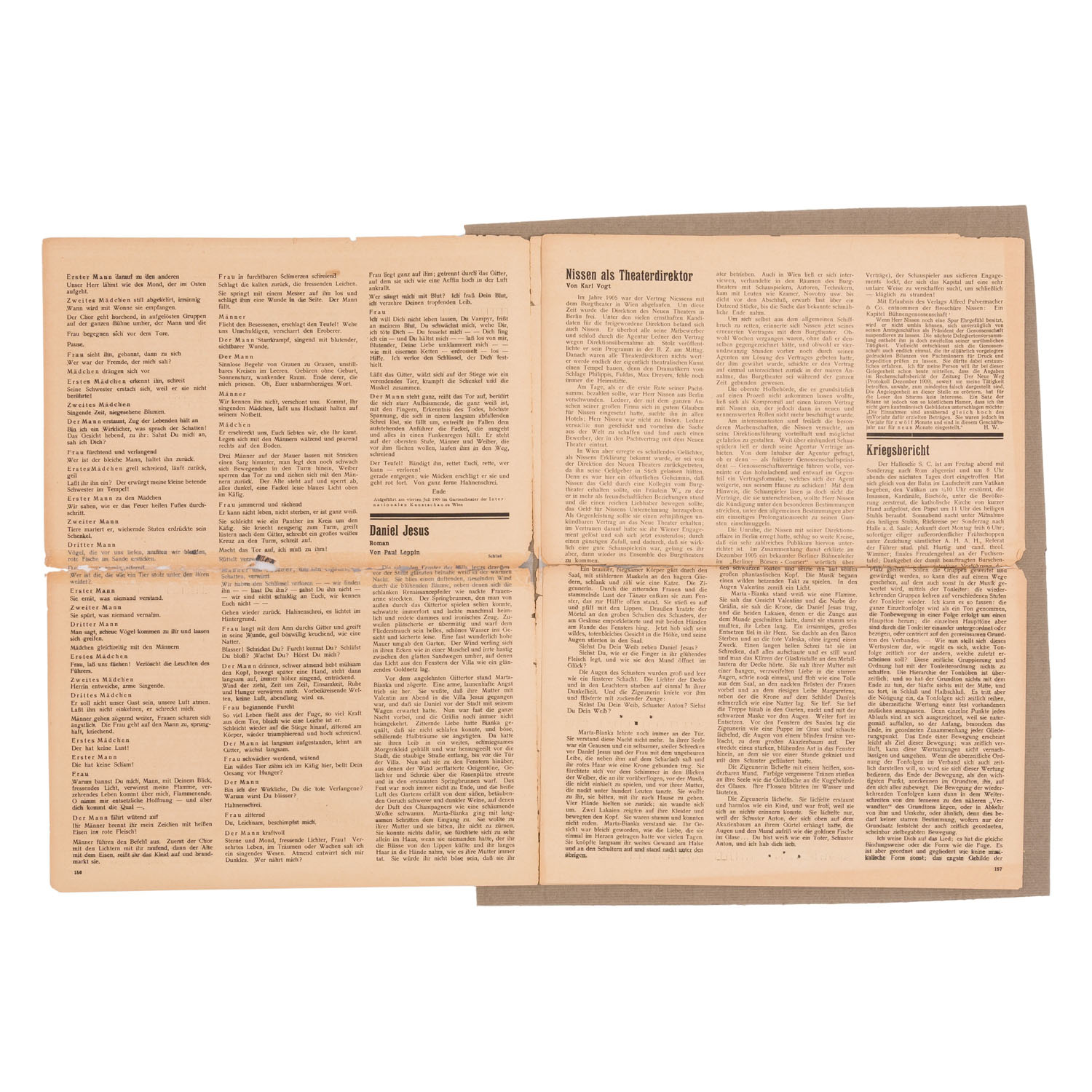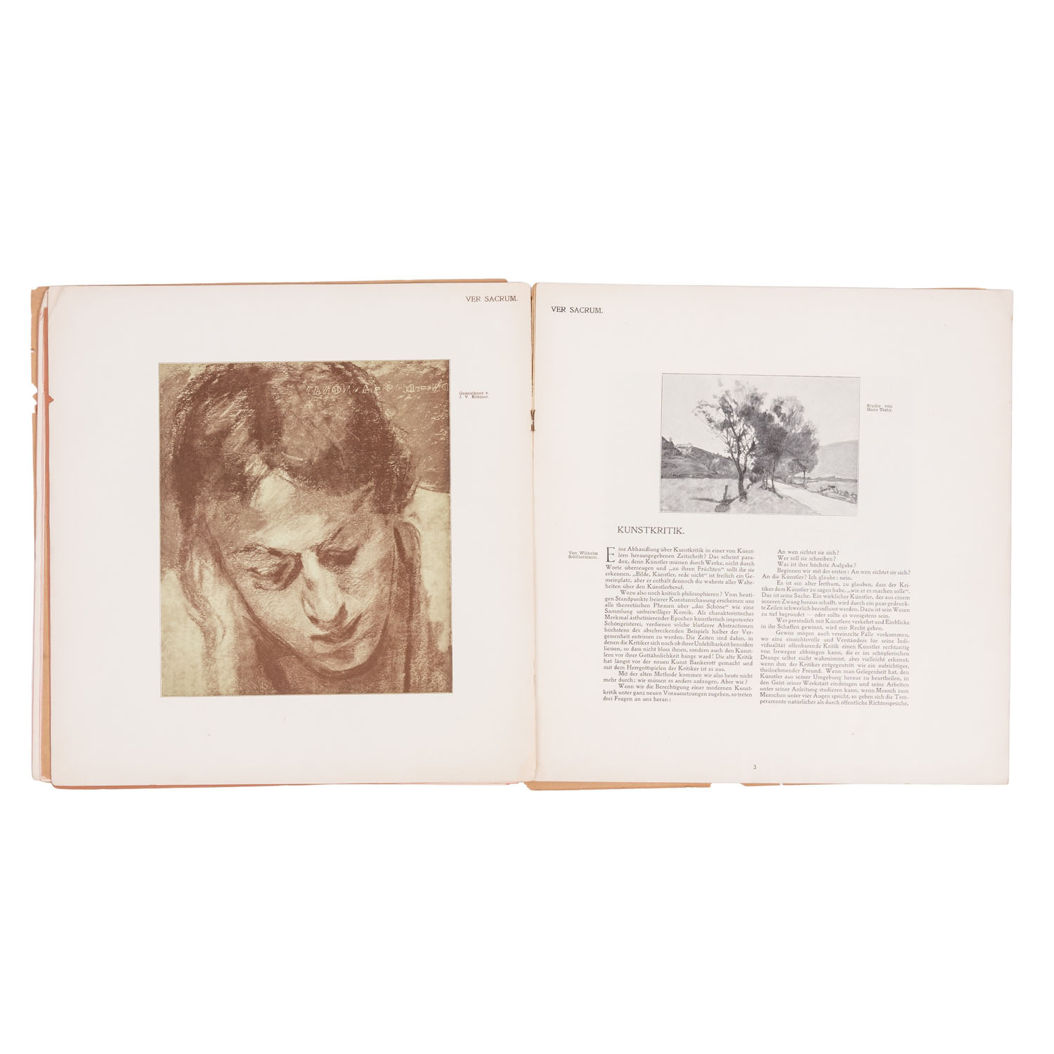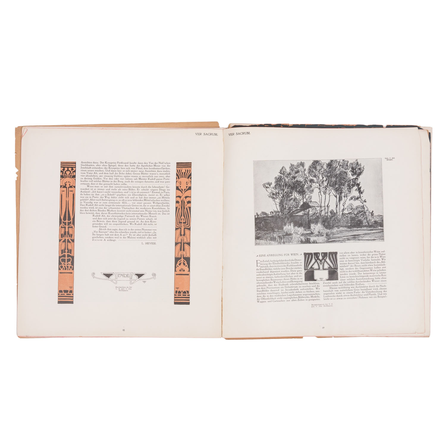 First issue of the magazine 'Ver Sacrum', January 1898. Pages 11 and 12 missing. Issue no. 2 of the magazine 'Ver Sacrum', February 1898. pages 17 and 18 missing. Cover of the third issue of the magazine 'Ver Sacrum', April 1898. Issue no. 48 of the magazine 'Jugend' from 1906, with the well-known portrait of a woman by Paul Hoecker on the title page, issue no. 20 of the first volume (1910) of the magazine 'Der Sturm' with the title page (and other works) by Oskar Kokoschka on his play: 'Mörder, Hoffnung der Frauen'. All magazines and sheets are in very poor condition with some repairs such as adhesive tape or staples.