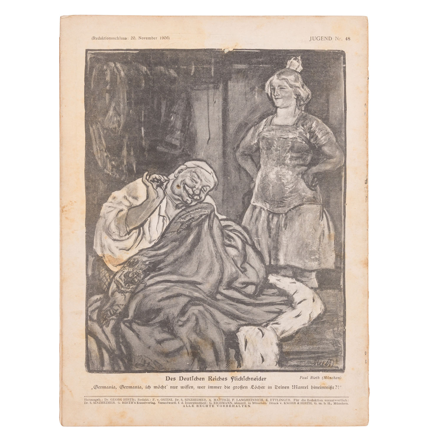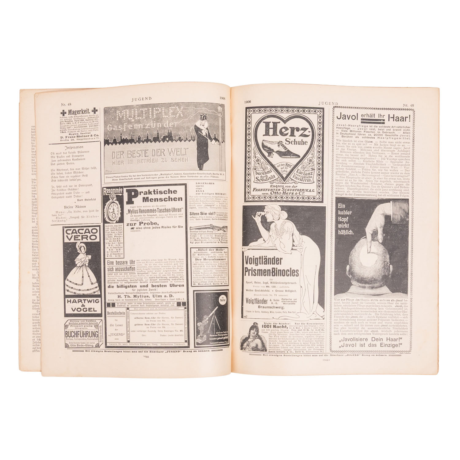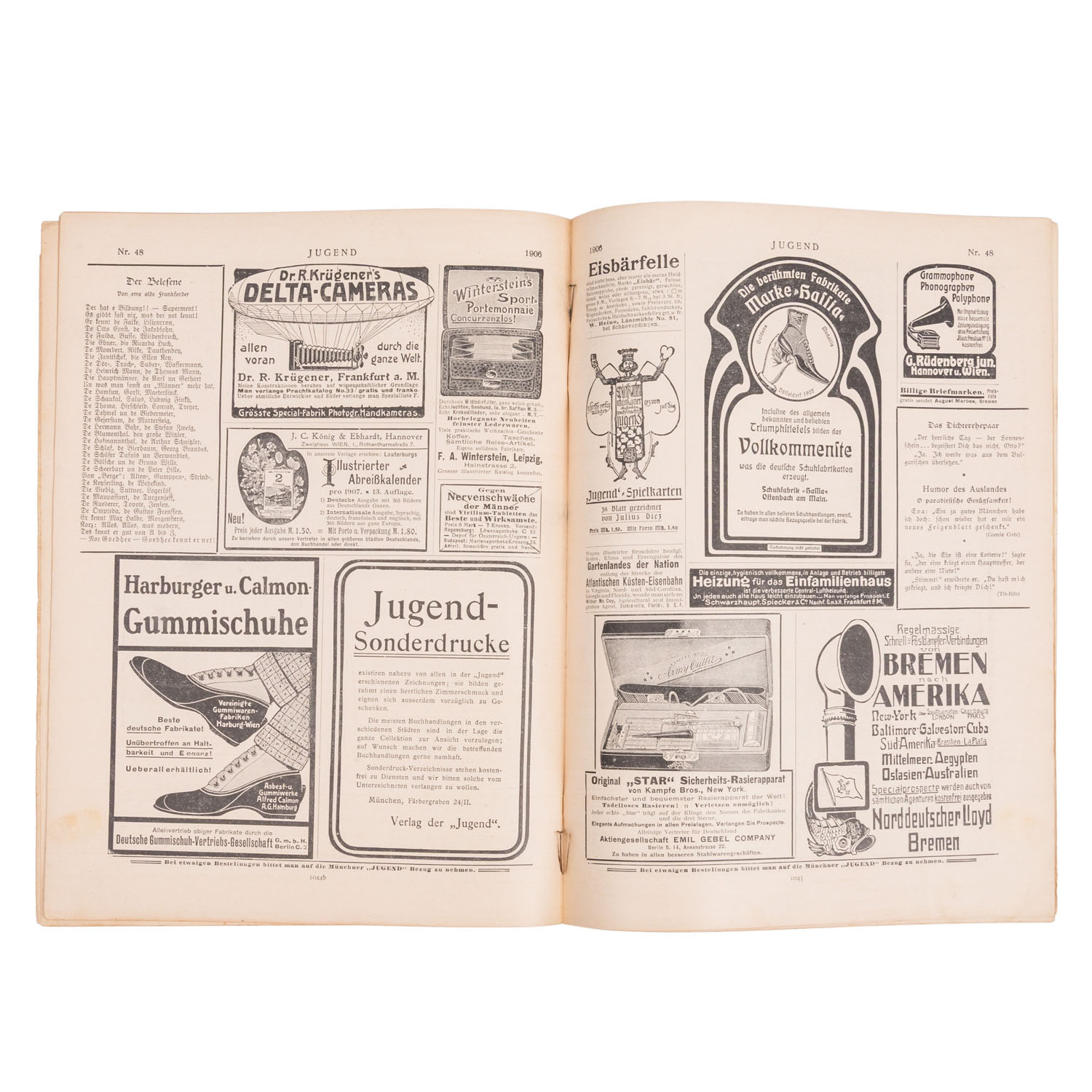 First issue of the magazine 'Ver Sacrum', January 1898. Pages 11 and 12 missing. Issue no. 2 of the magazine 'Ver Sacrum', February 1898. pages 17 and 18 missing. Cover of the third issue of the magazine 'Ver Sacrum', April 1898. Issue no. 48 of the magazine 'Jugend' from 1906, with the well-known portrait of a woman by Paul Hoecker on the title page, issue no. 20 of the first volume (1910) of the magazine 'Der Sturm' with the title page (and other works) by Oskar Kokoschka on his play: 'Mörder, Hoffnung der Frauen'. All magazines and sheets are in very poor condition with some repairs such as adhesive tape or staples.