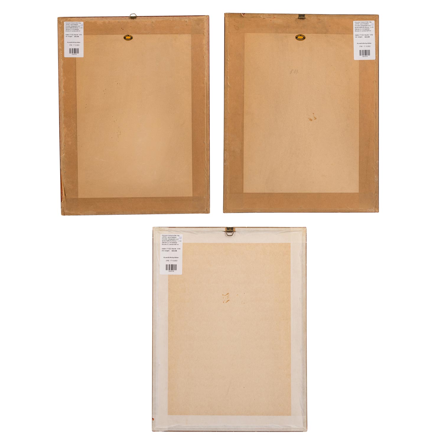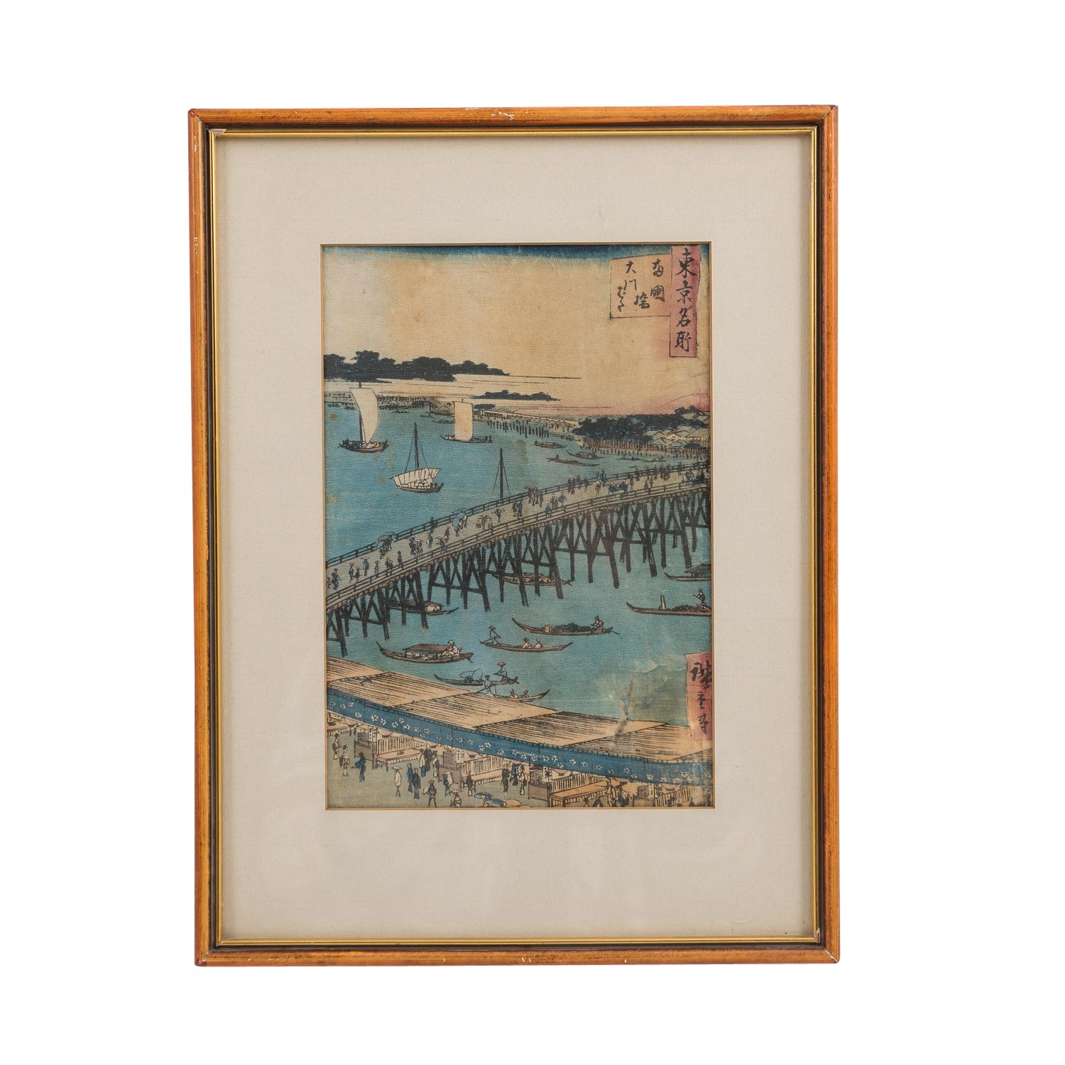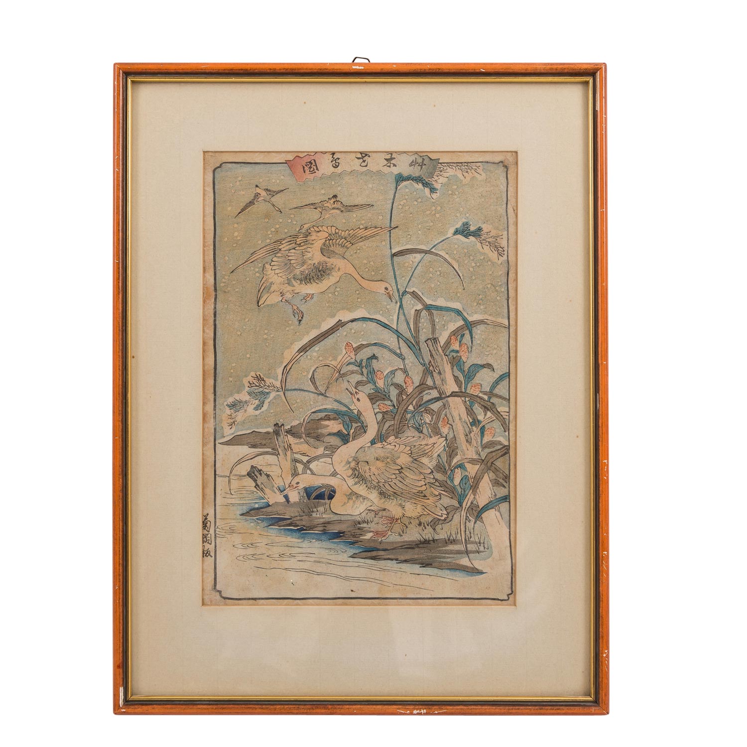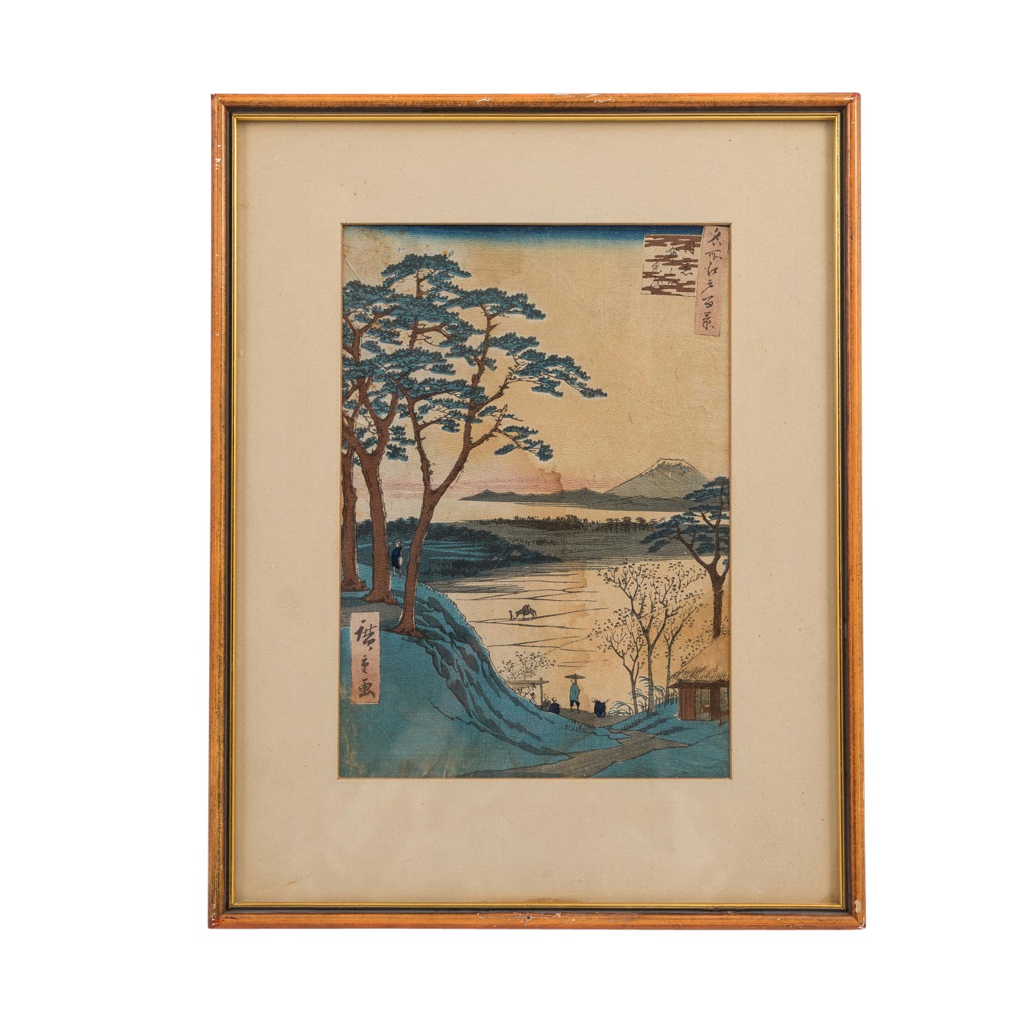 Convolute woodblock prints 3-pcs, JAPAN: different artists (depicted are landscape motifs: 1.) with geese 2.) with animated bridge 3.) landscape with Fuji jama, pine and figural staffage) uniform rear glass framing 40x30 cm/40,5x31,5 cm/45x34,5 cm. damaged.