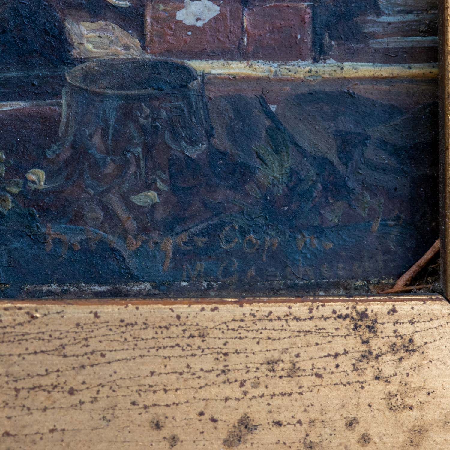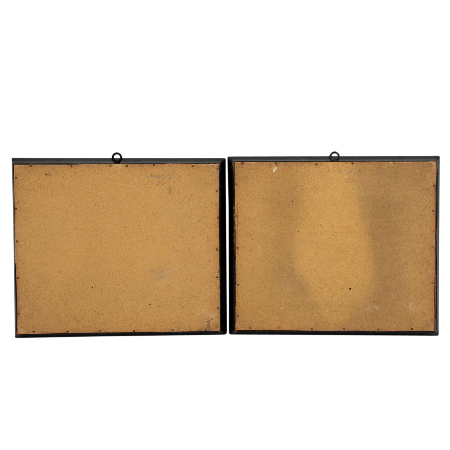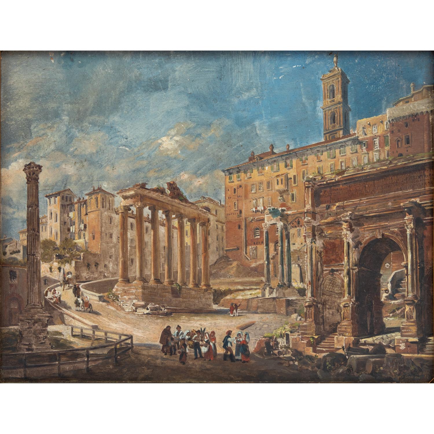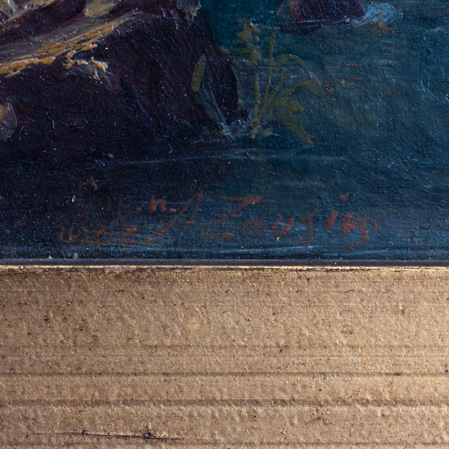 COPISTS around 1900, Pair of Italian landscapes, 1x 'Italian town with temple ruins', in the foreground people in traditional costume from the Alban Hills, copy after M. Gescheidt(?), indistinctly signed and inscribed, oil/cardboard, HxW: approx. 17.5x22 cm; 1x 'Arched bridge with defense tower in a river landscape', in the foreground washerwomen, copy after Armand G. Zausig (1804-1847), inscribed and dated 1902, oil/cardboard, HxW: approx. 17.5x22 cm. Each with signs of age and rubbing. Each with frame (external dimensions 30x35 cm each).