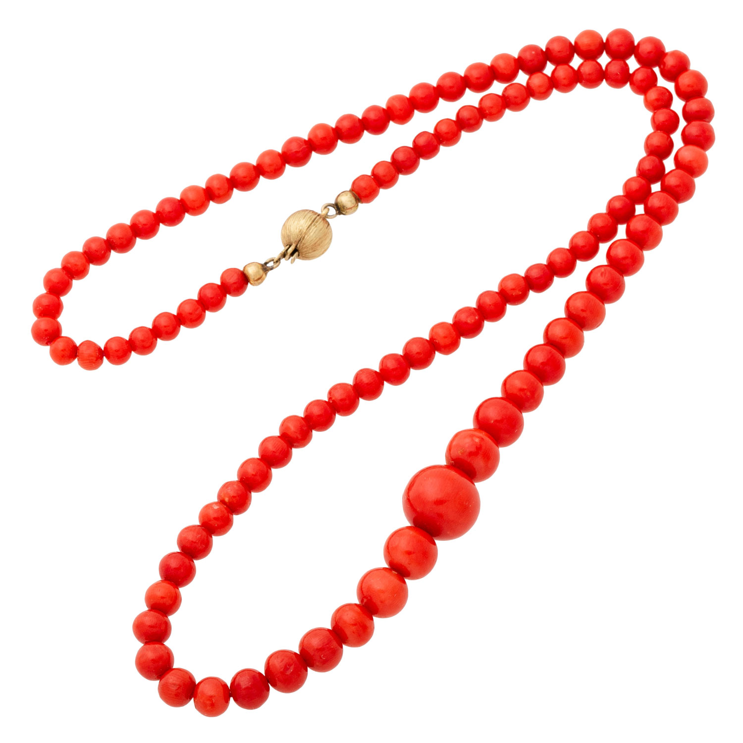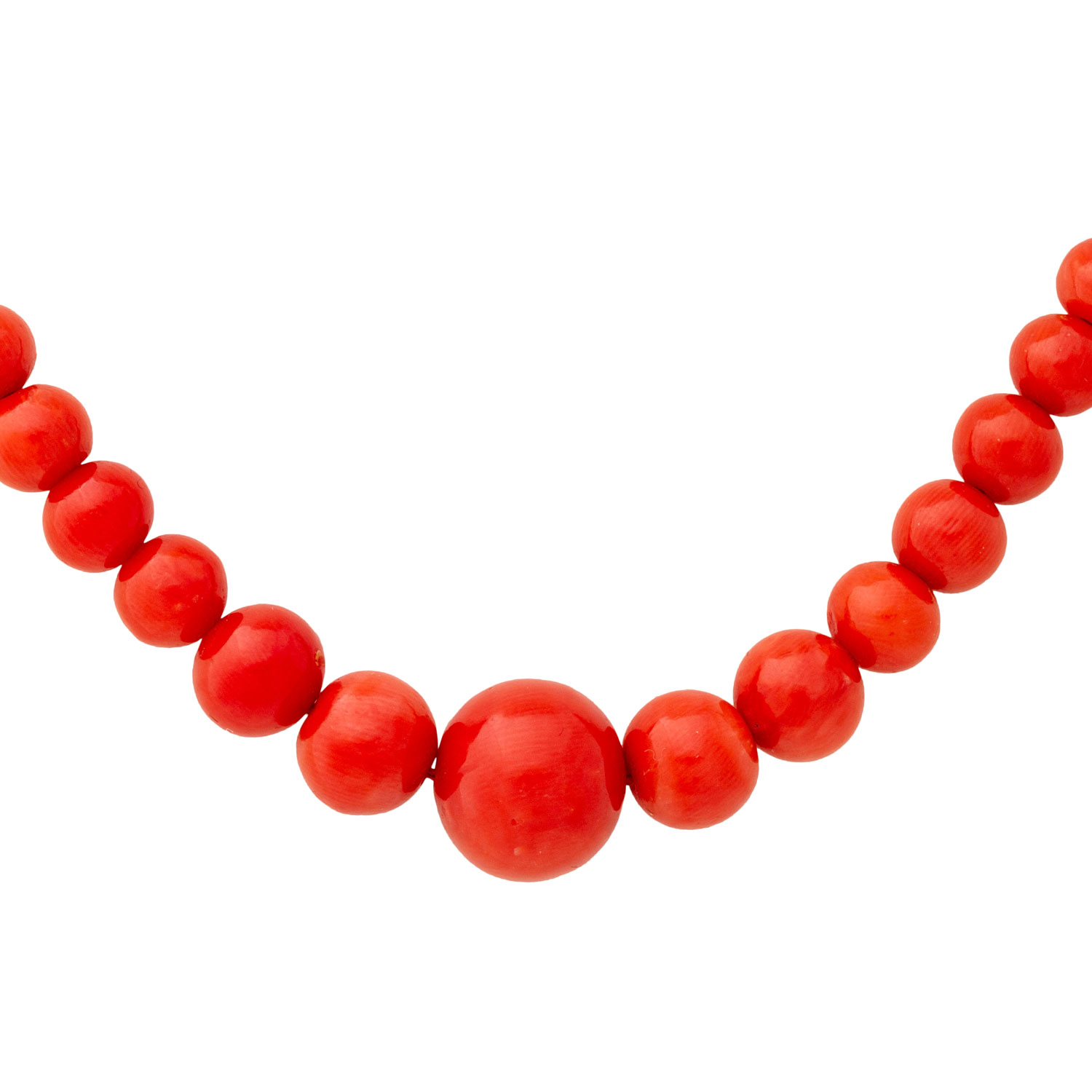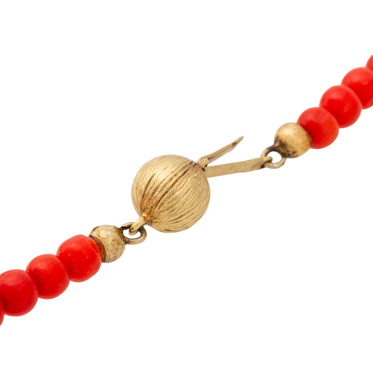 Necklace made of coral beads graduating from 4.5 to 12 mm, clasp made of 14K yellow gold, L: 54 cm, 2nd half of 20th century, minor signs of wear. IMPORT/EXPORT RESTRICTIONS OUTSIDE THE EU!
