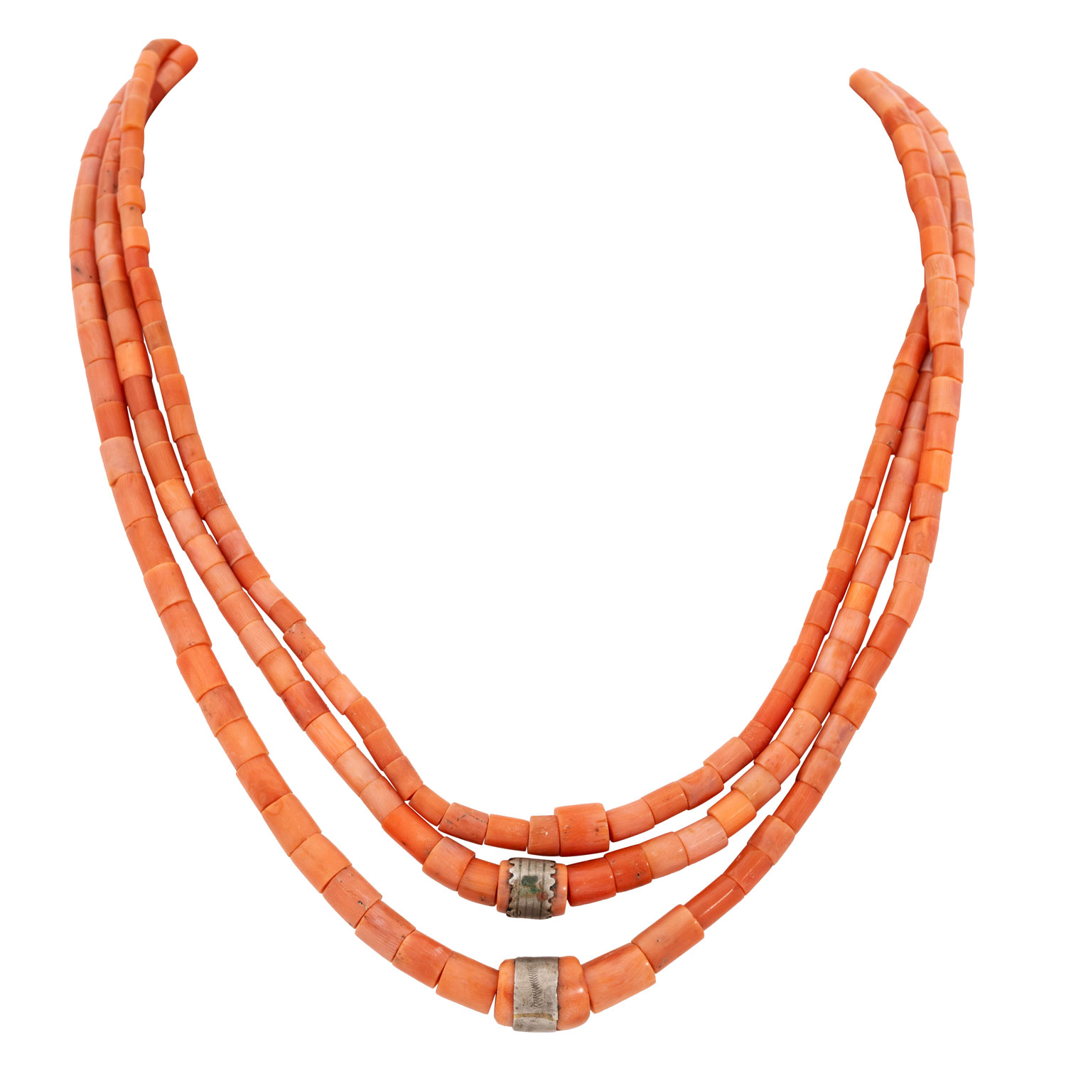 3-row necklace of corals with silver fittings, further 2 additional rows, 77 g, rolls 3 to 10 mm, L: 33-42 cm, 20th century, signs of wear. NO SHIPPING OUTSIDE THE EU!