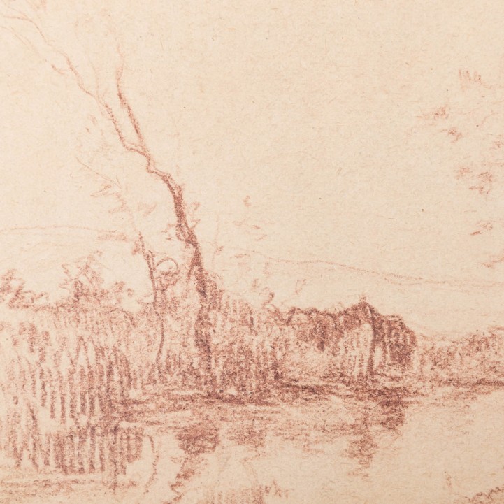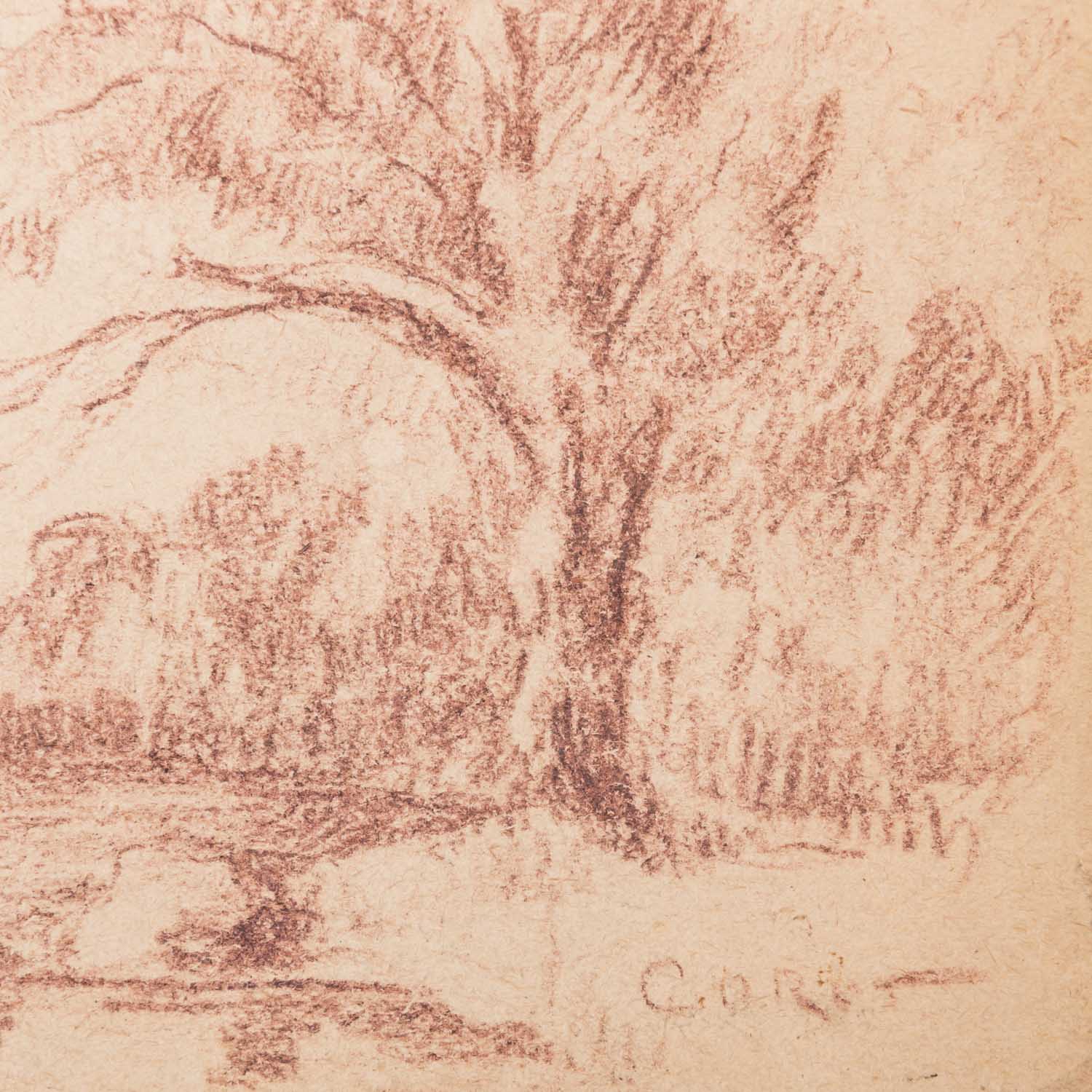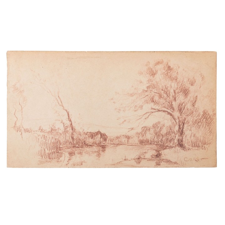 COROT, CAMILLE (1796-1875), ‘River Landscape’, with trees and bushes on the banks, inscribed “COROT” lower right, red chalk drawing/paper, HxW: approx. 13x24 cm. Signs of age, browned, edges of sheet minimally damaged in places; verso probably restored.
