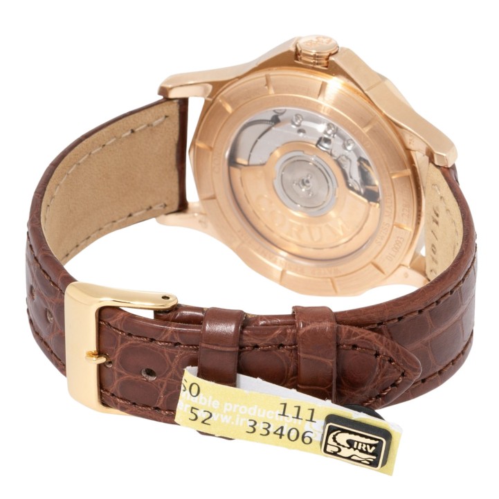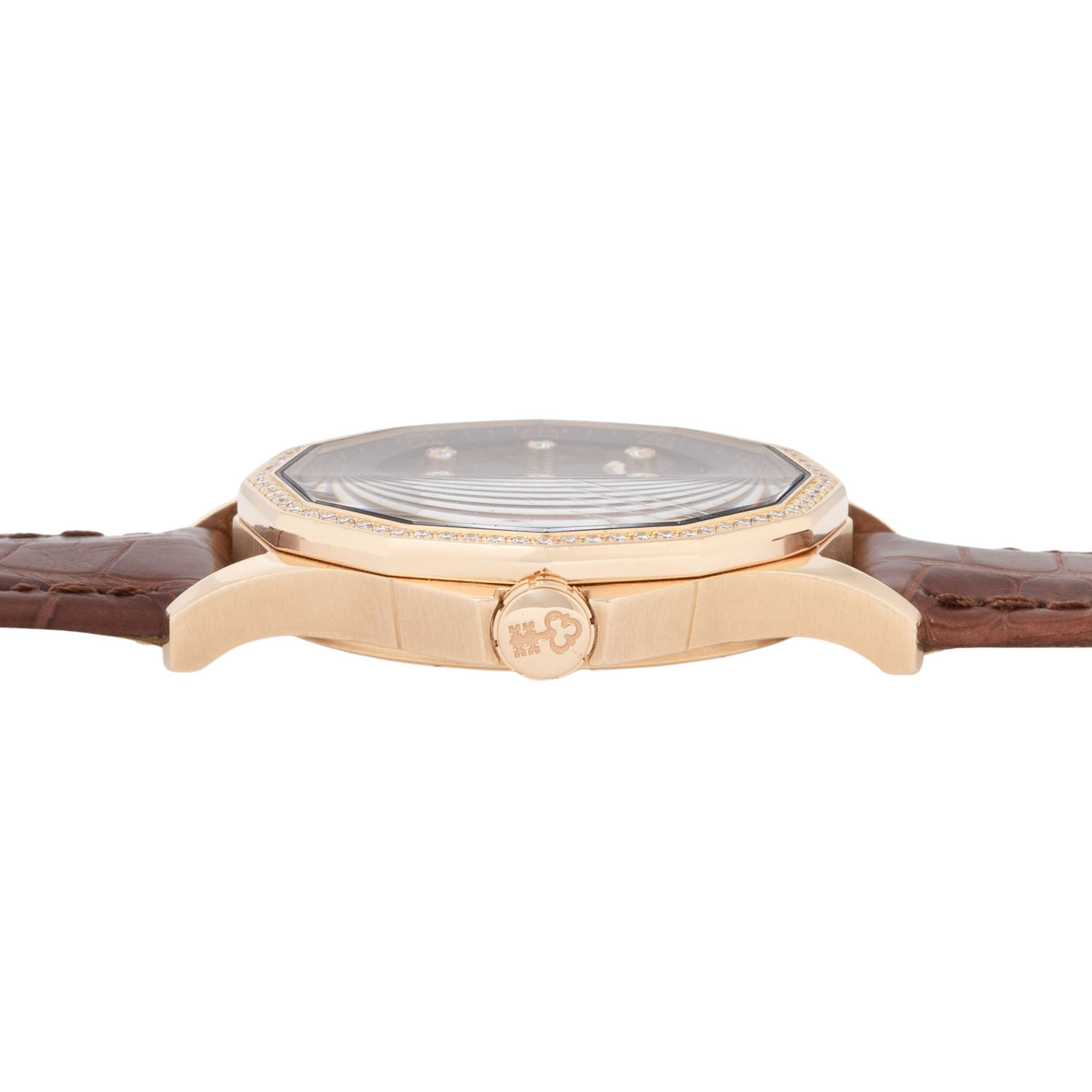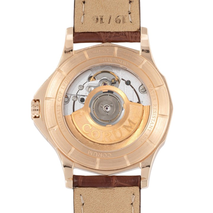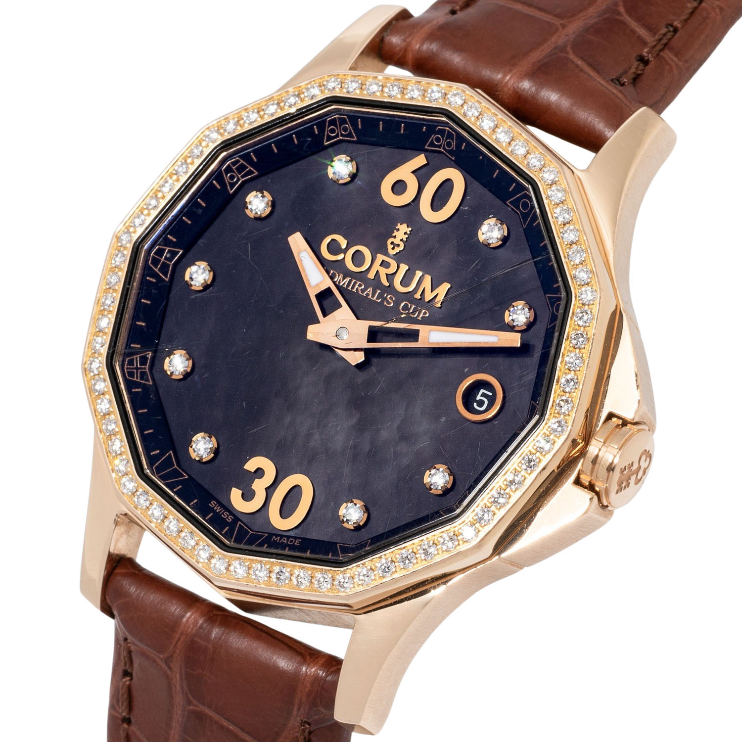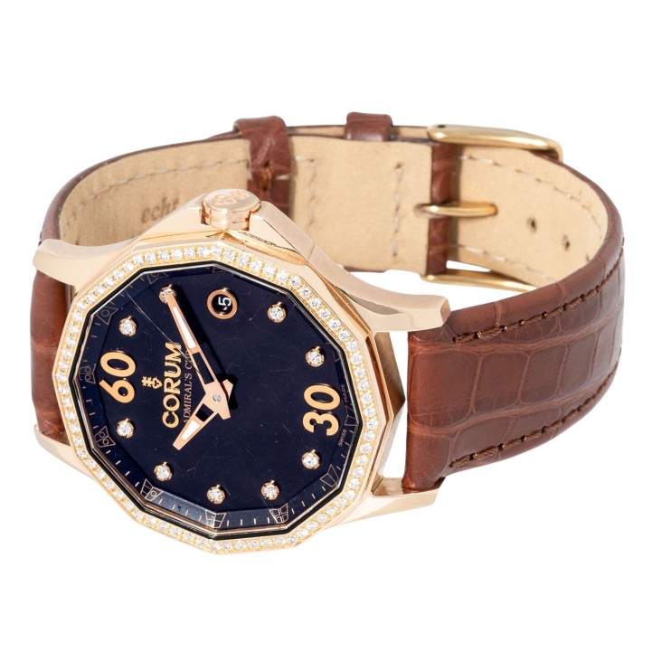 CORUM Admiral's Cup Legend ref. 082.101.85/0041 ladies' wristwatch with papers from 2012. 18K rose gold, bezel set with 72 brilliant-cut diamonds (total 0.58 ct). ETA Cal. 2892-A2 automatic movement with very good working order (+3.5 s/d, 317° amplitude). Black mother-of-pearl dial with 9 diamond hour markers and applied minute markers (60 & 30), regatta pennant and minute track printed on the flange, and date display. New brown leather strap with gold-plated pin buckle. Used with visible signs of wear, crystal with a crack between 8 and 2 o'clock. Warranty card from 09/2012 and purchase receipt enclosed. Originally purchased from Juwelier Leicht in Berlin. Diameter approx. 38 mm measured without crown.