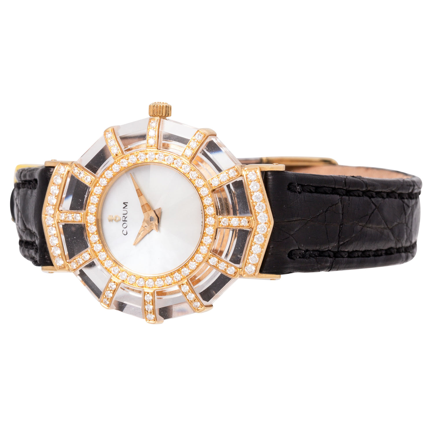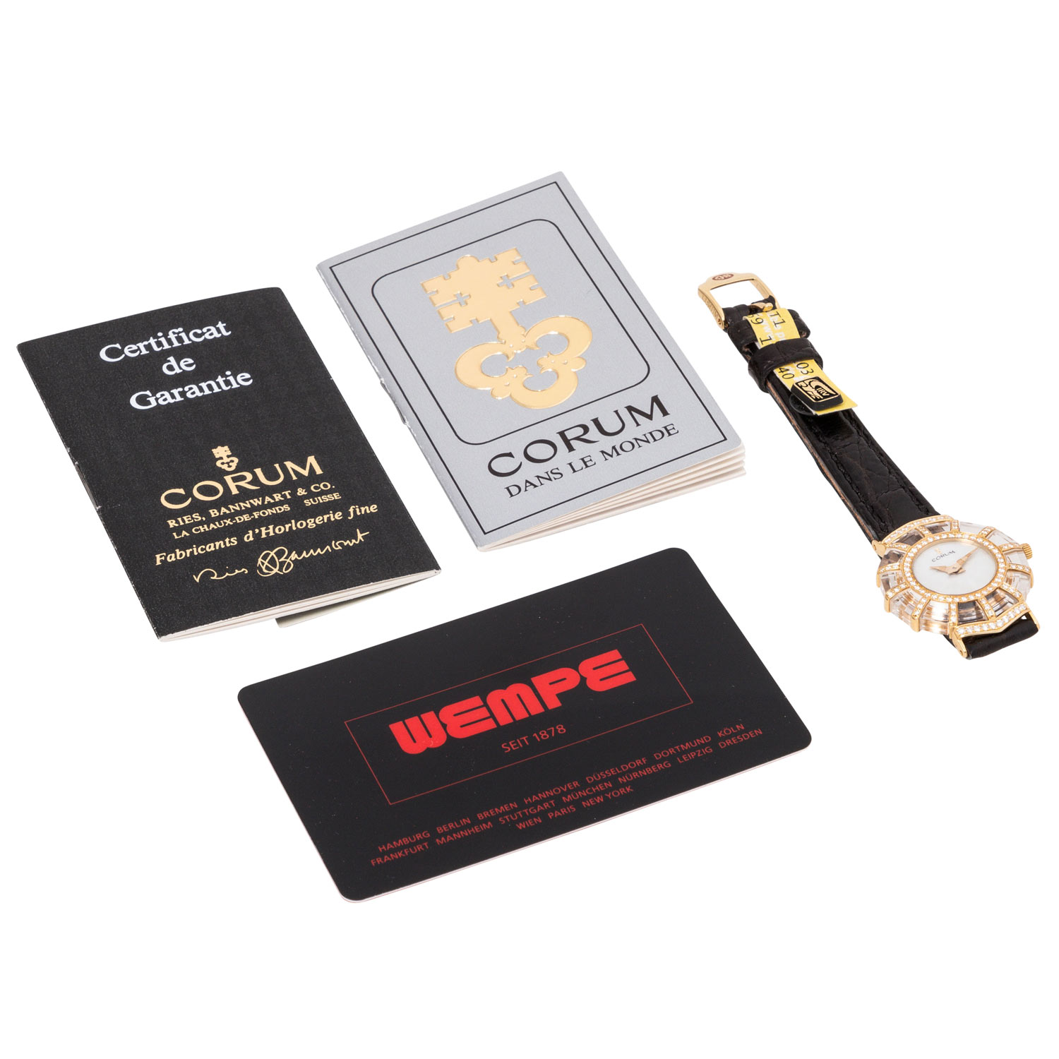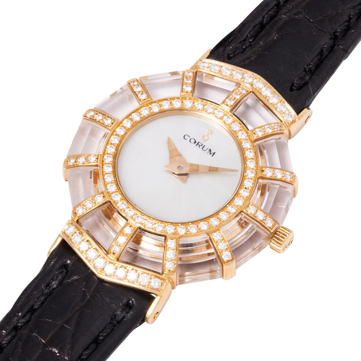 CORUM Crystal Quartz Ladies Wristwatch Ref. 24.281.65 from 1994. 18K yellow gold, bezel with 12 rock crystal elements and 96 brilliant-cut diamonds. Quartz movement with new battery in working condition. Mother of pearl dial with gold hands. New leather strap with original 18K pin buckle. Very good condition, slight signs of wear. Original warranty certificate, dealer directory, Wempe warranty card and proof of purchase from June 16, 1994 enclosed. Diameter approx. 26 mm without crown.