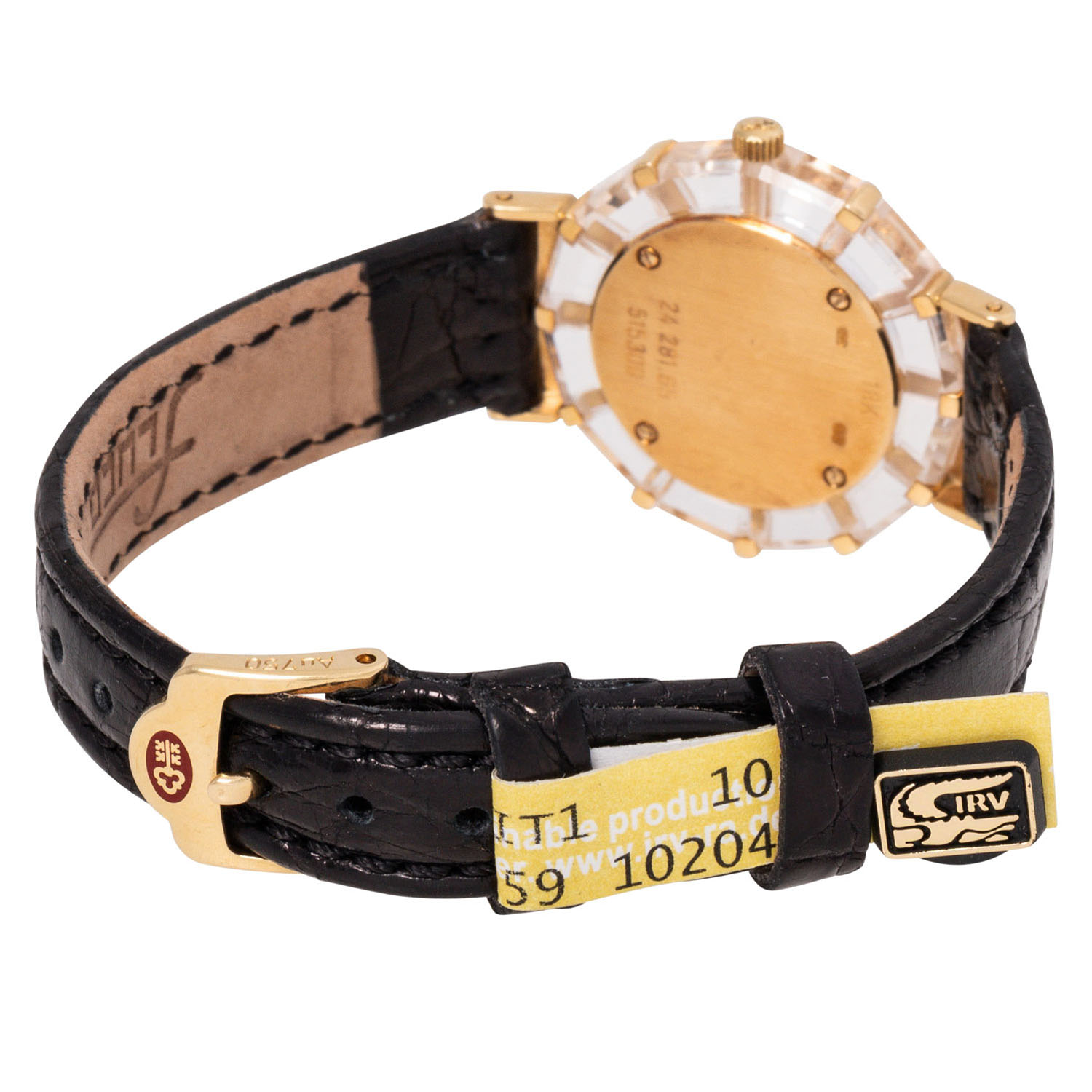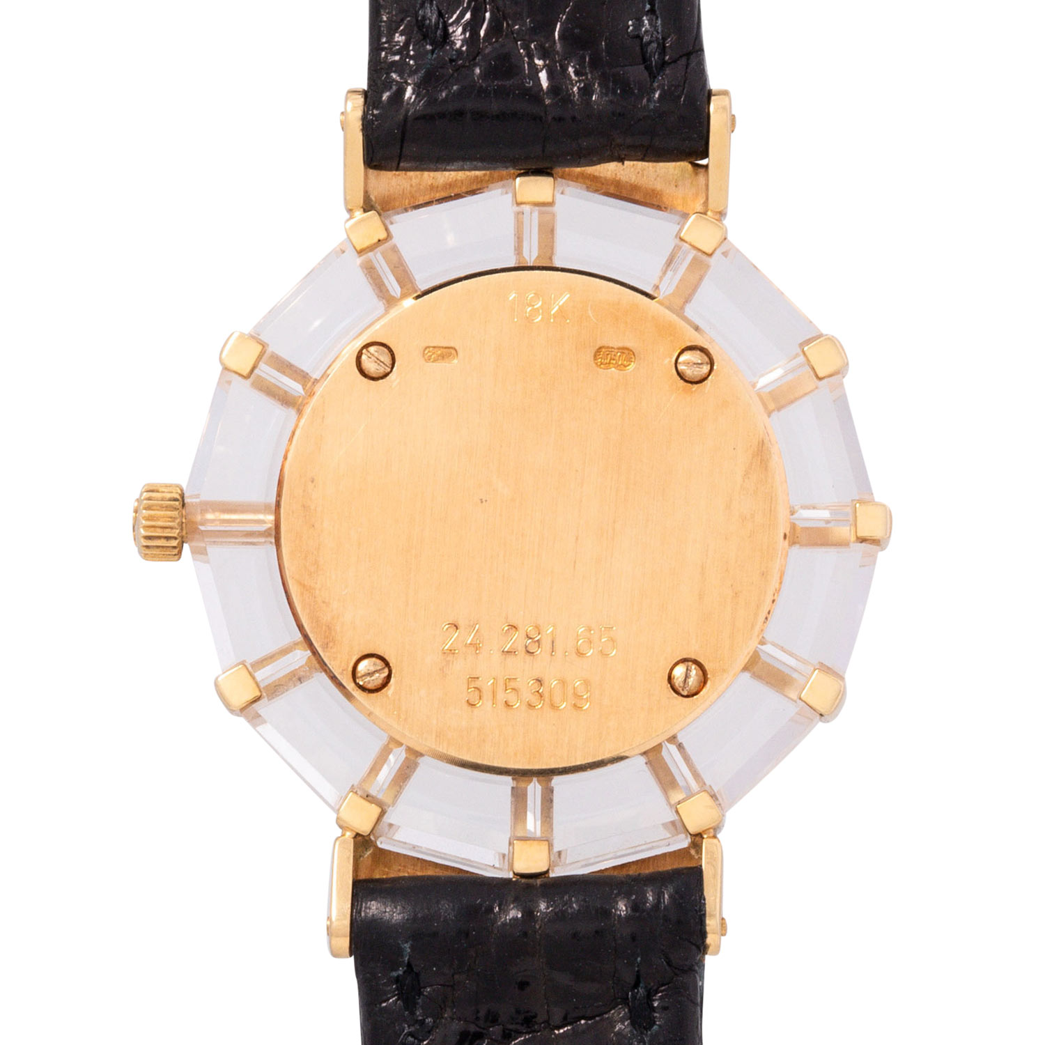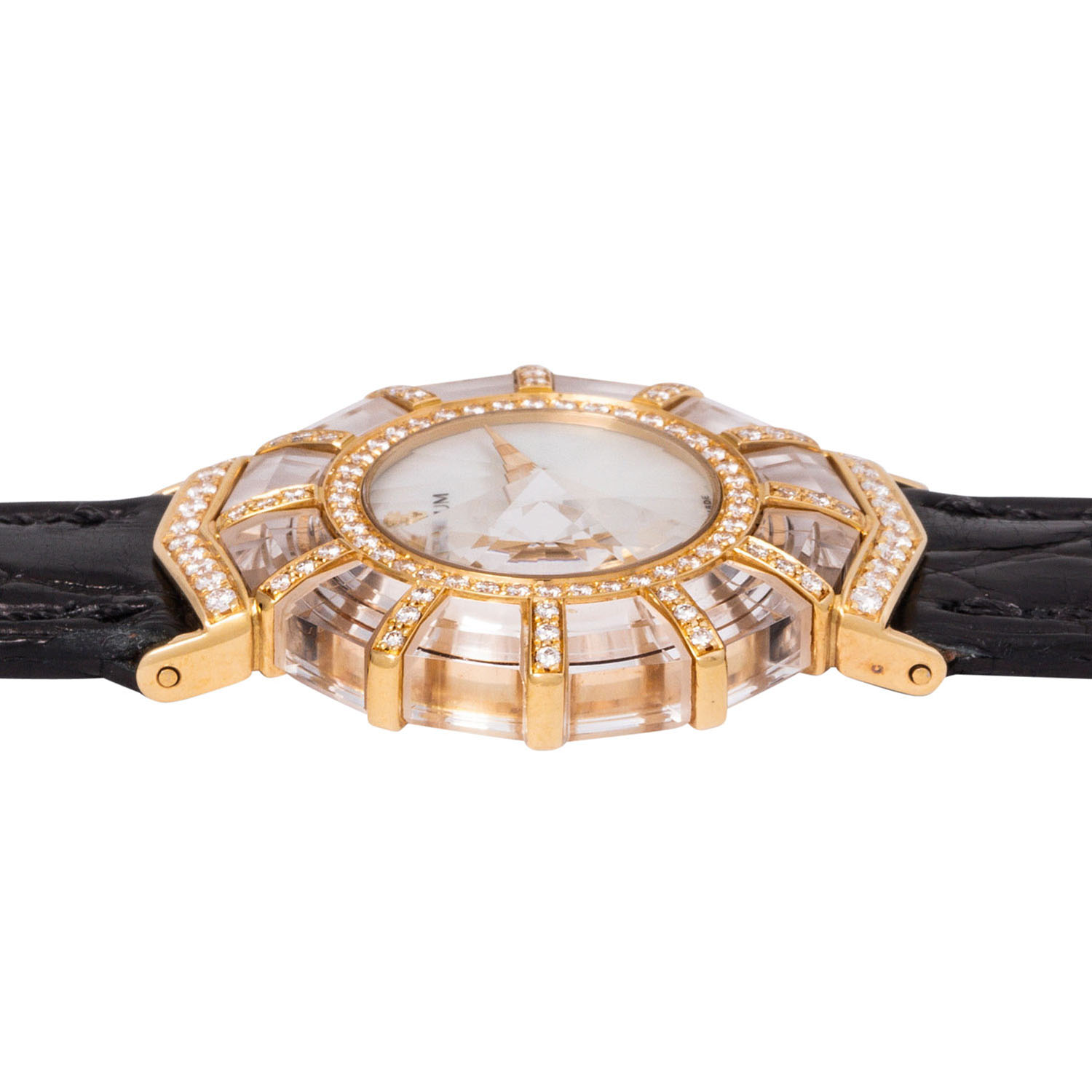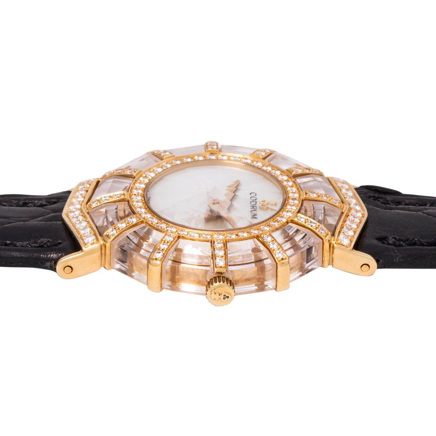CORUM Crystal Quartz Ladies Wristwatch Ref. 24.281.65 from 1994. 18K yellow gold, bezel with 12 rock crystal elements and 96 brilliant-cut diamonds. Quartz movement with new battery in working condition. Mother of pearl dial with gold hands. New leather strap with original 18K pin buckle. Very good condition, slight signs of wear. Original warranty certificate, dealer directory, Wempe warranty card and proof of purchase from June 16, 1994 enclosed. Diameter approx. 26 mm without crown.
