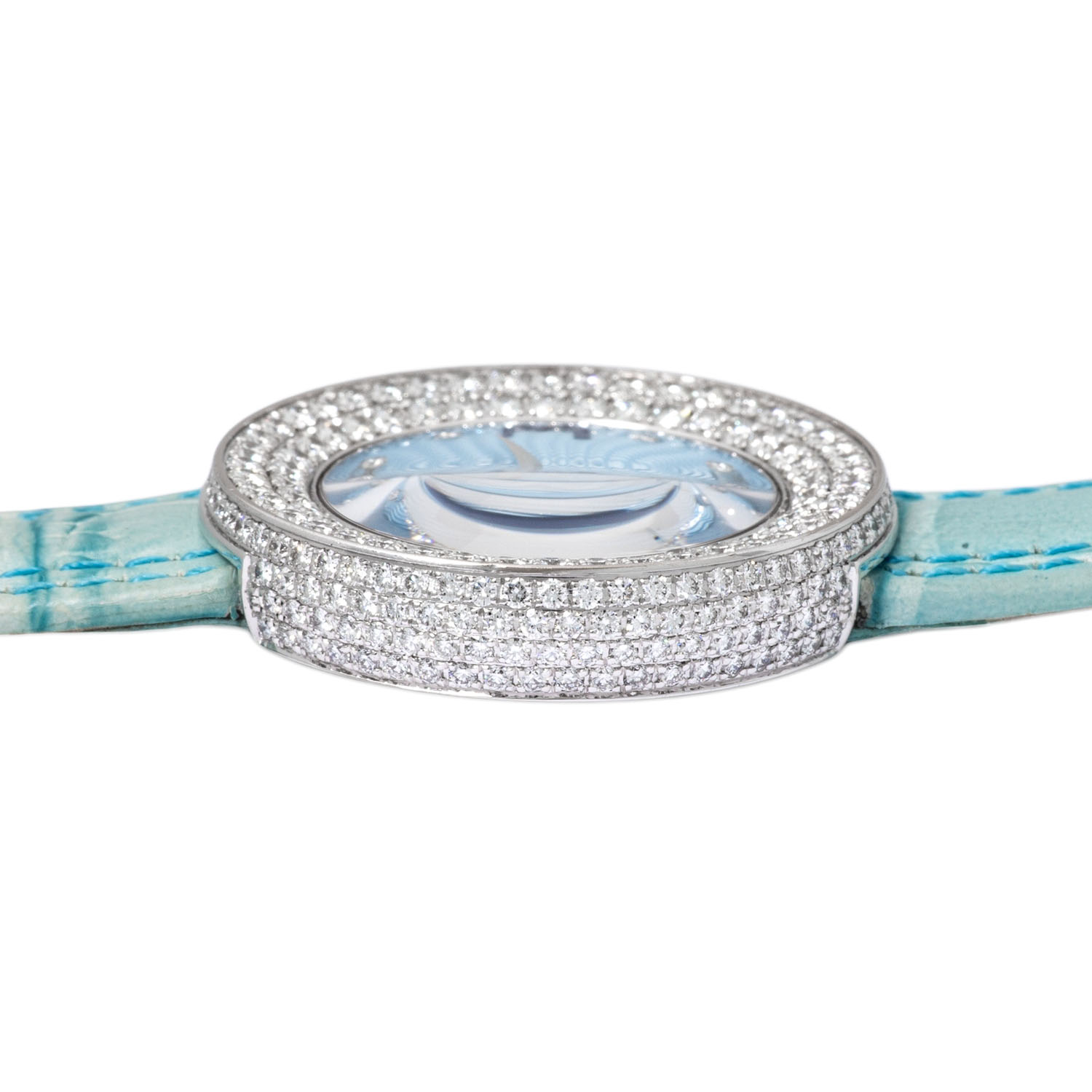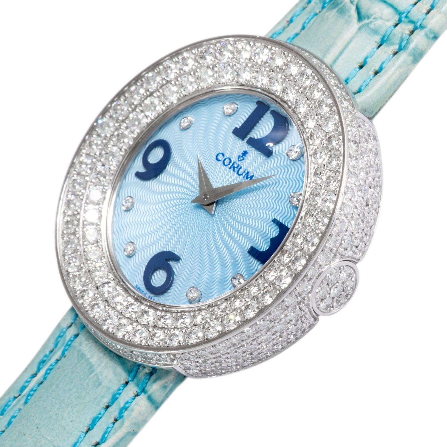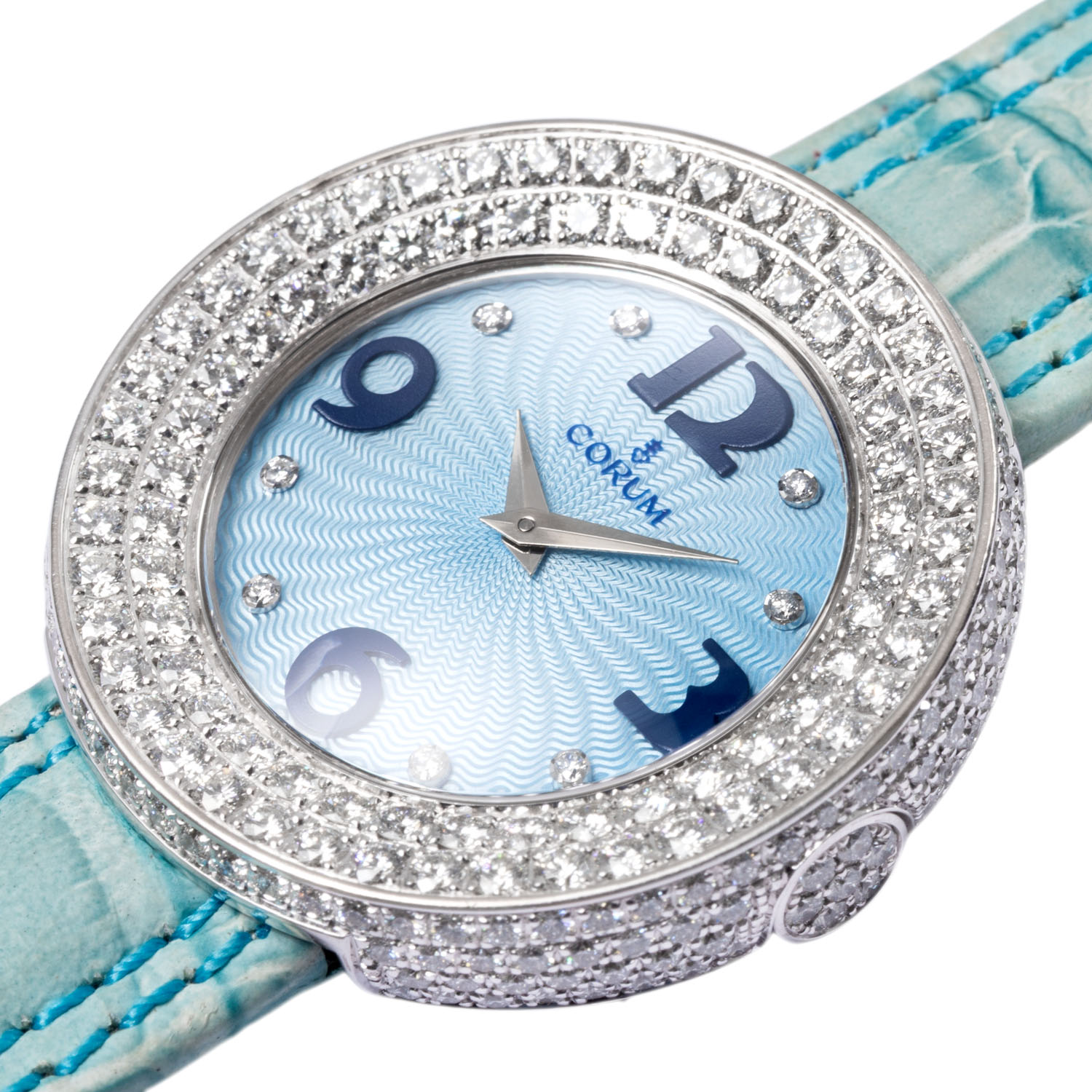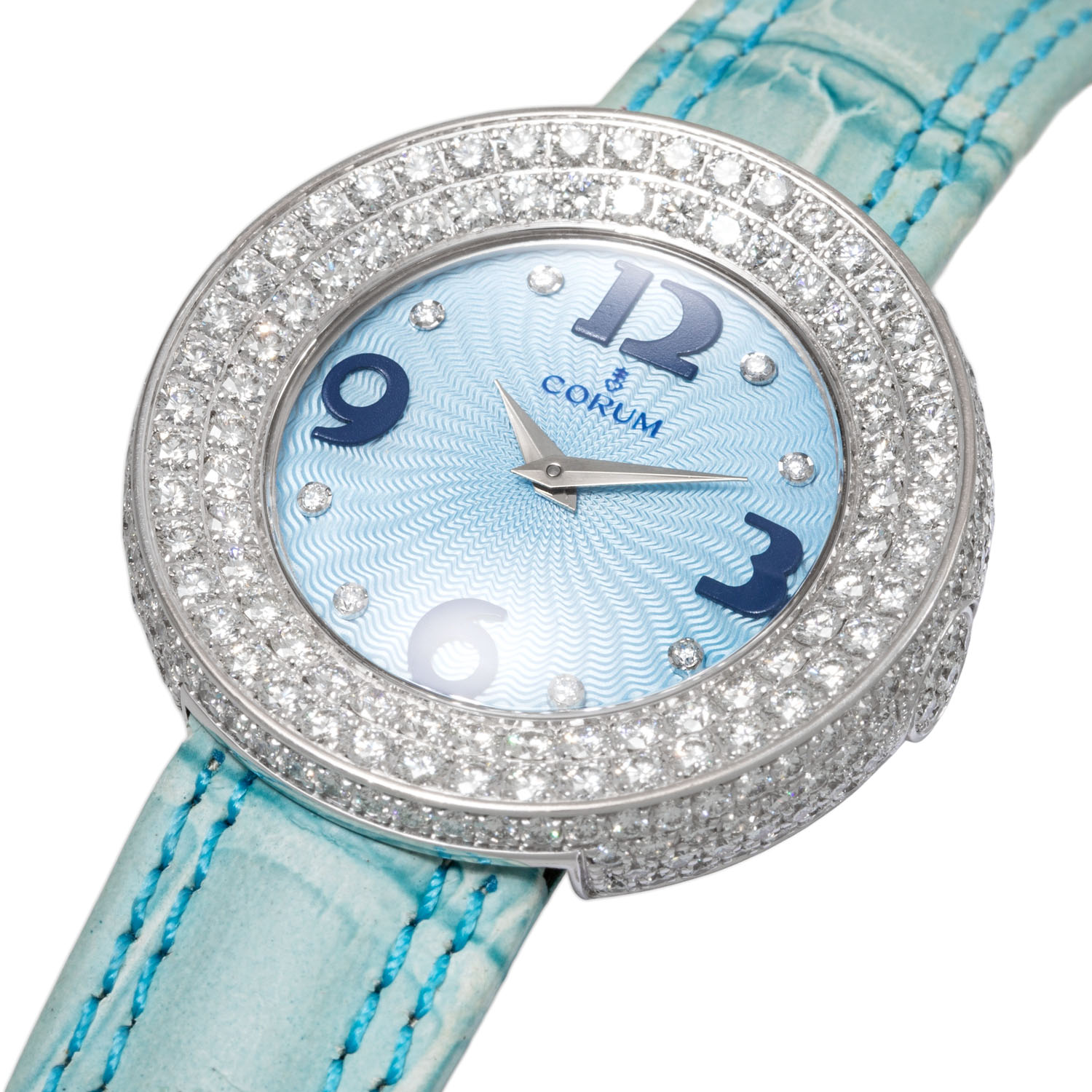 CORUM ultra-fine Full Moon “Factory Diamonds” ladies' watch, ref. 24.840.69. 18K white gold, case and crown factory set with 256 brilliant-cut diamonds (approx. 3.38ct total). Quartz movement with new battery. Light blue guilloche enamel dial with applied Arabic numerals and 8 brilliant-cut diamond hour markers, Dauphine hands. Leather strap with original folding clasp in 18K white gold, set with 20 brilliant-cut diamonds (approx. 0.2ct total). Very good condition, light signs of wear on the case and bracelet. Diameter approx. 35 mm measured without crown.