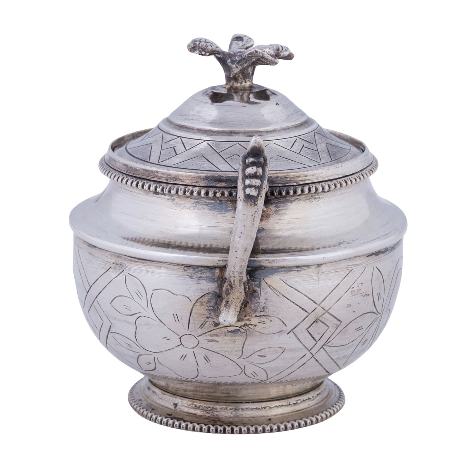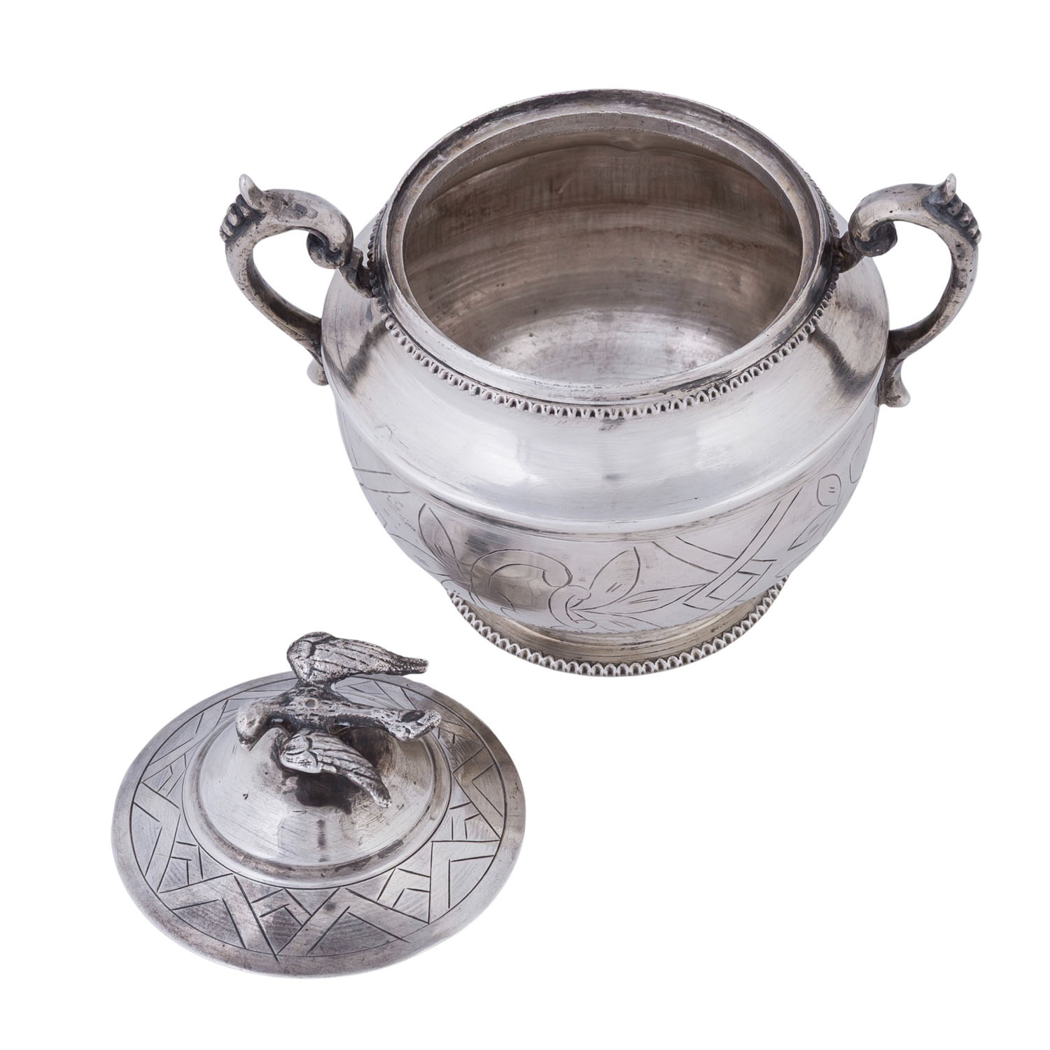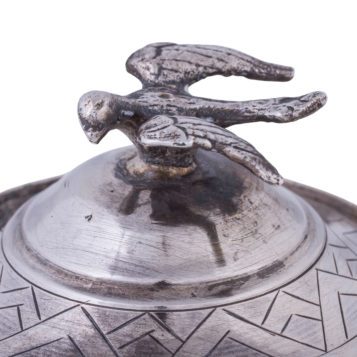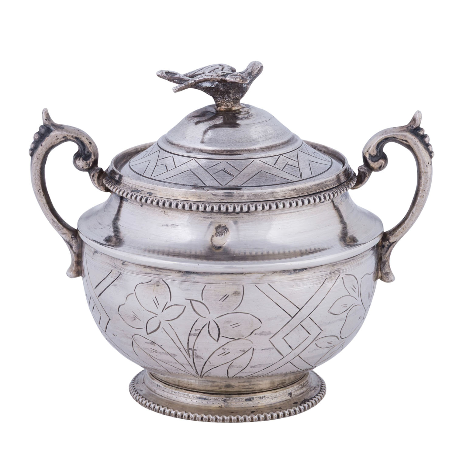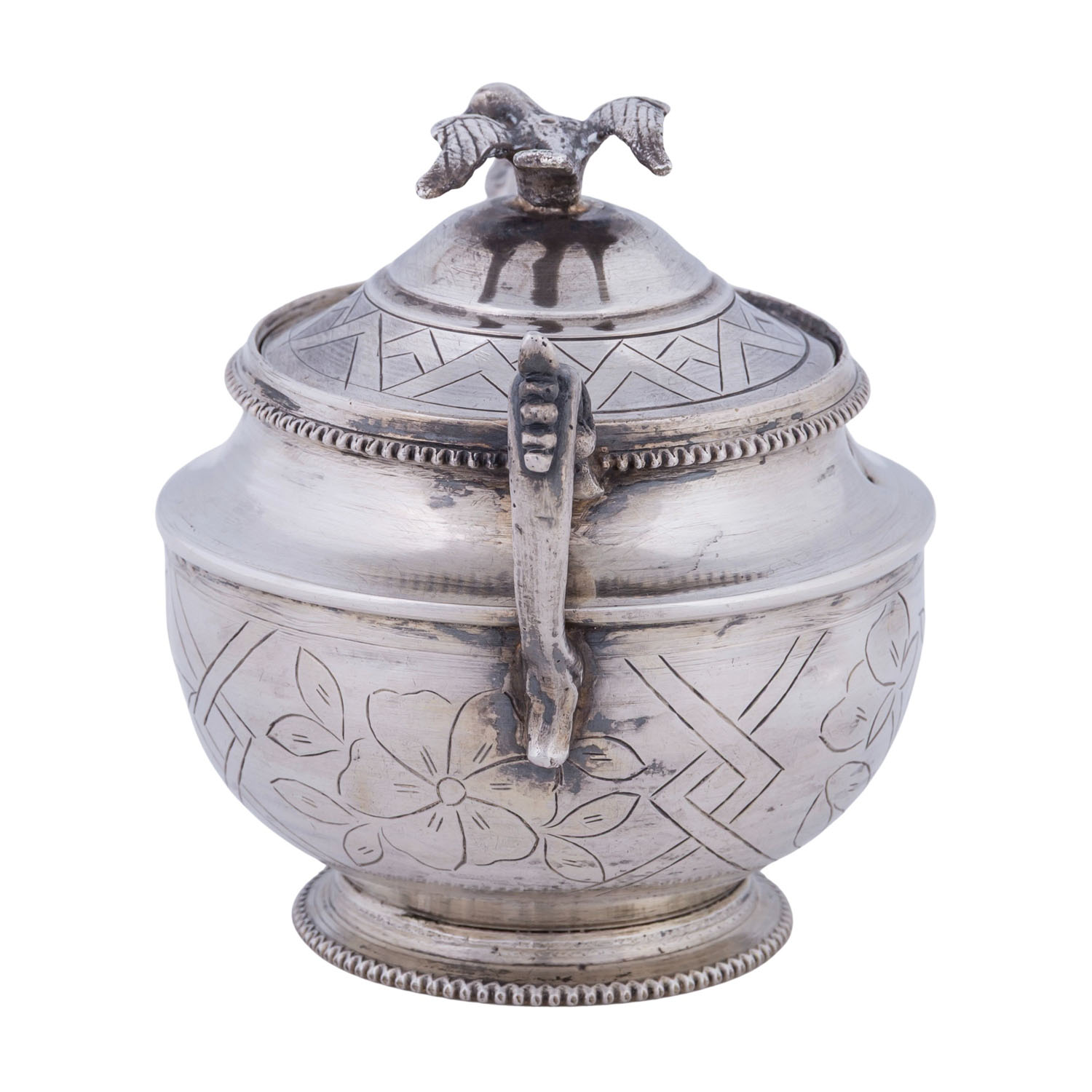 LID BOX, silver, 20th century, round, retracted base, bulbous body with floral engraving, fluted rim decoration, corresponding handles, lid knob in the shape of a dove, lxh: approx. 11x9.5 cm, hallmark (struck), weight approx. 227 g. Signs of age and use. Partly dented.