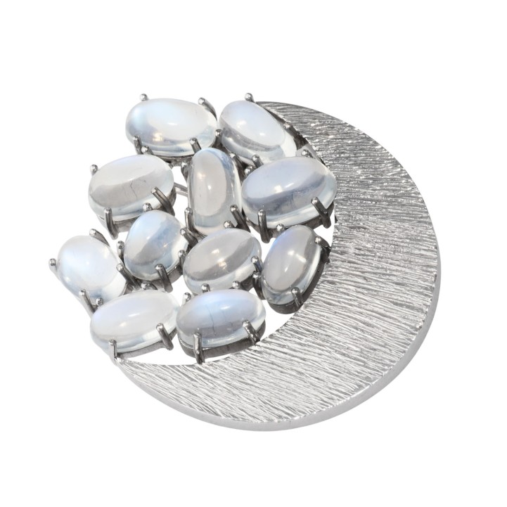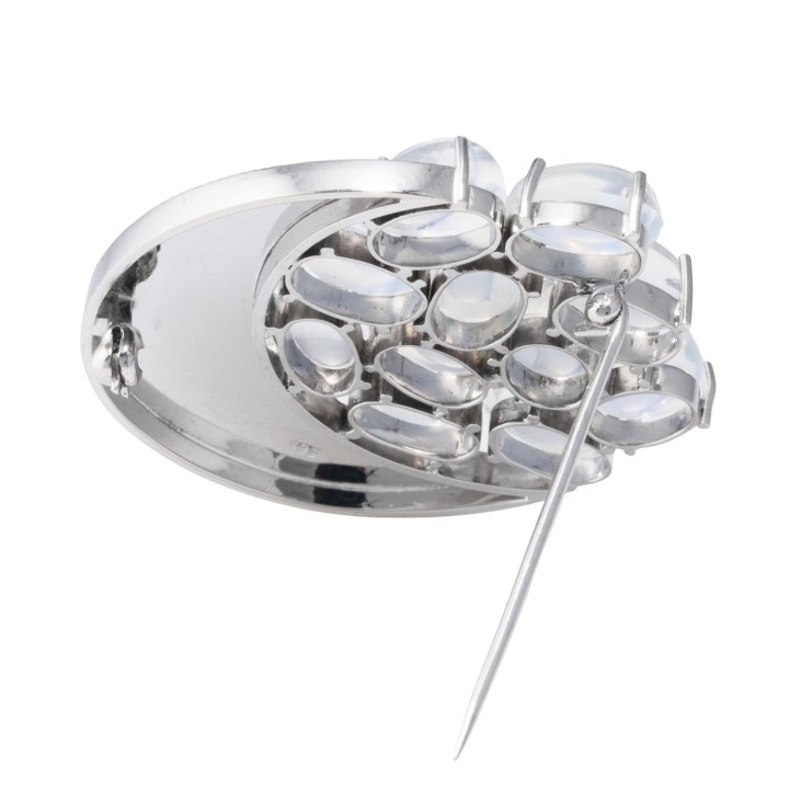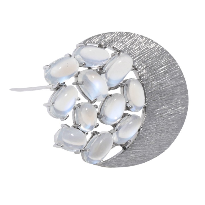 Brooch 'Half Moon' with 11 beautiful oval cabochon-cut moonstones, 14K white gold, 17.8 g, 4x3.7 cm, 1970s, good condition.