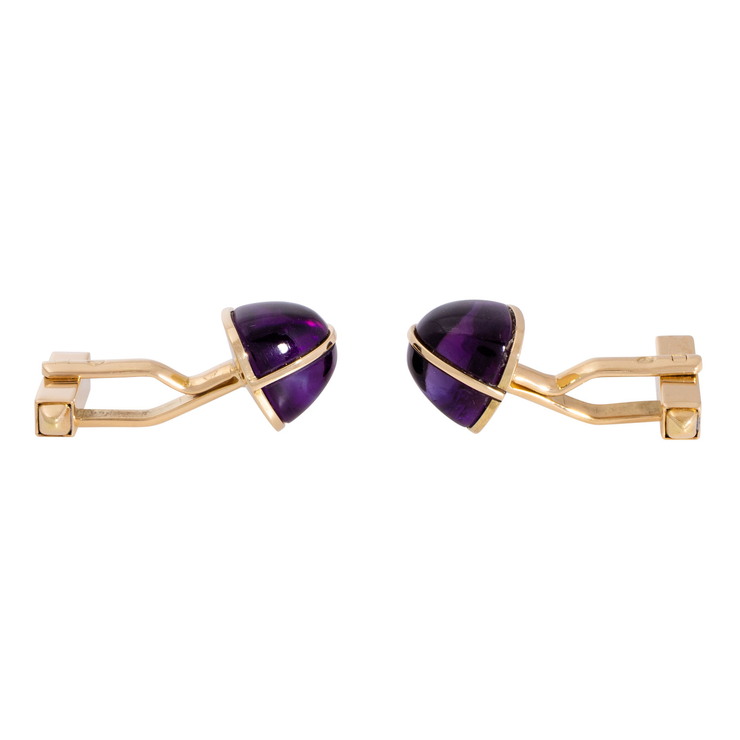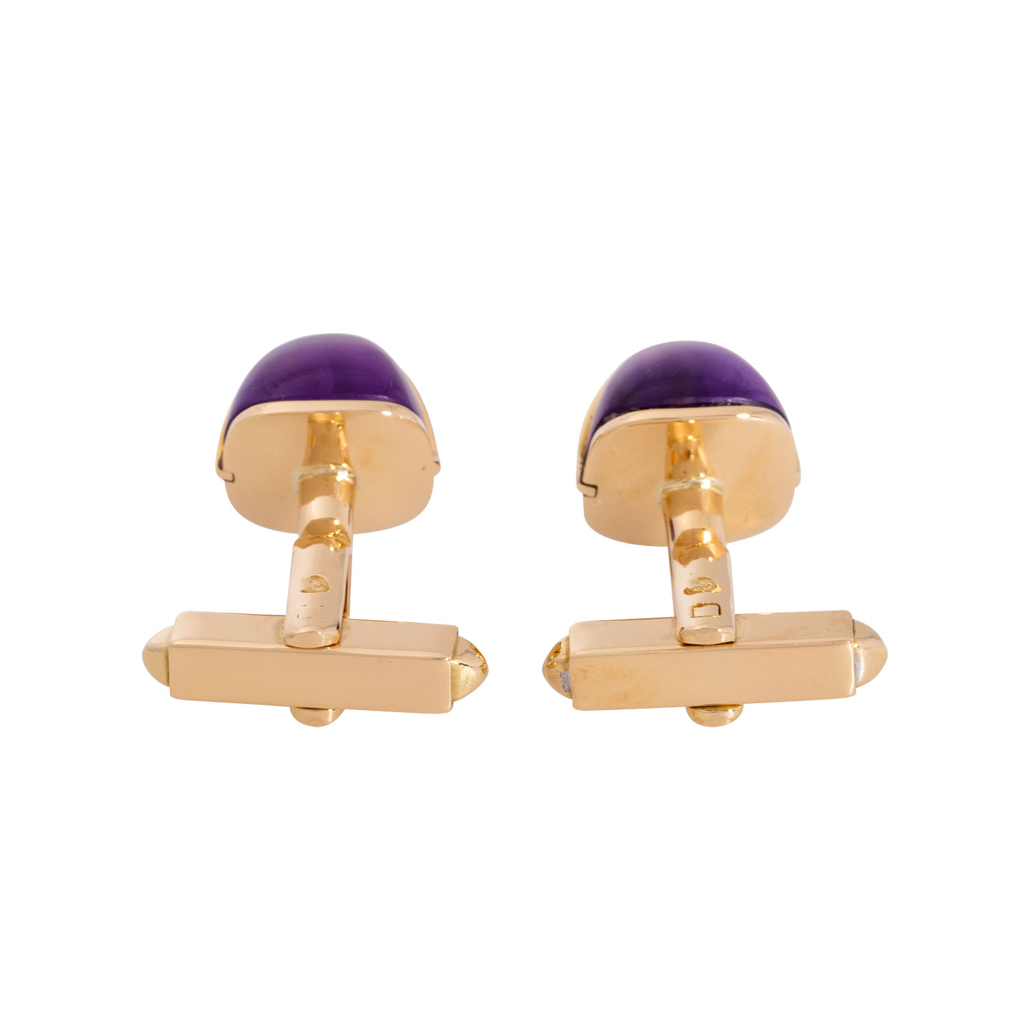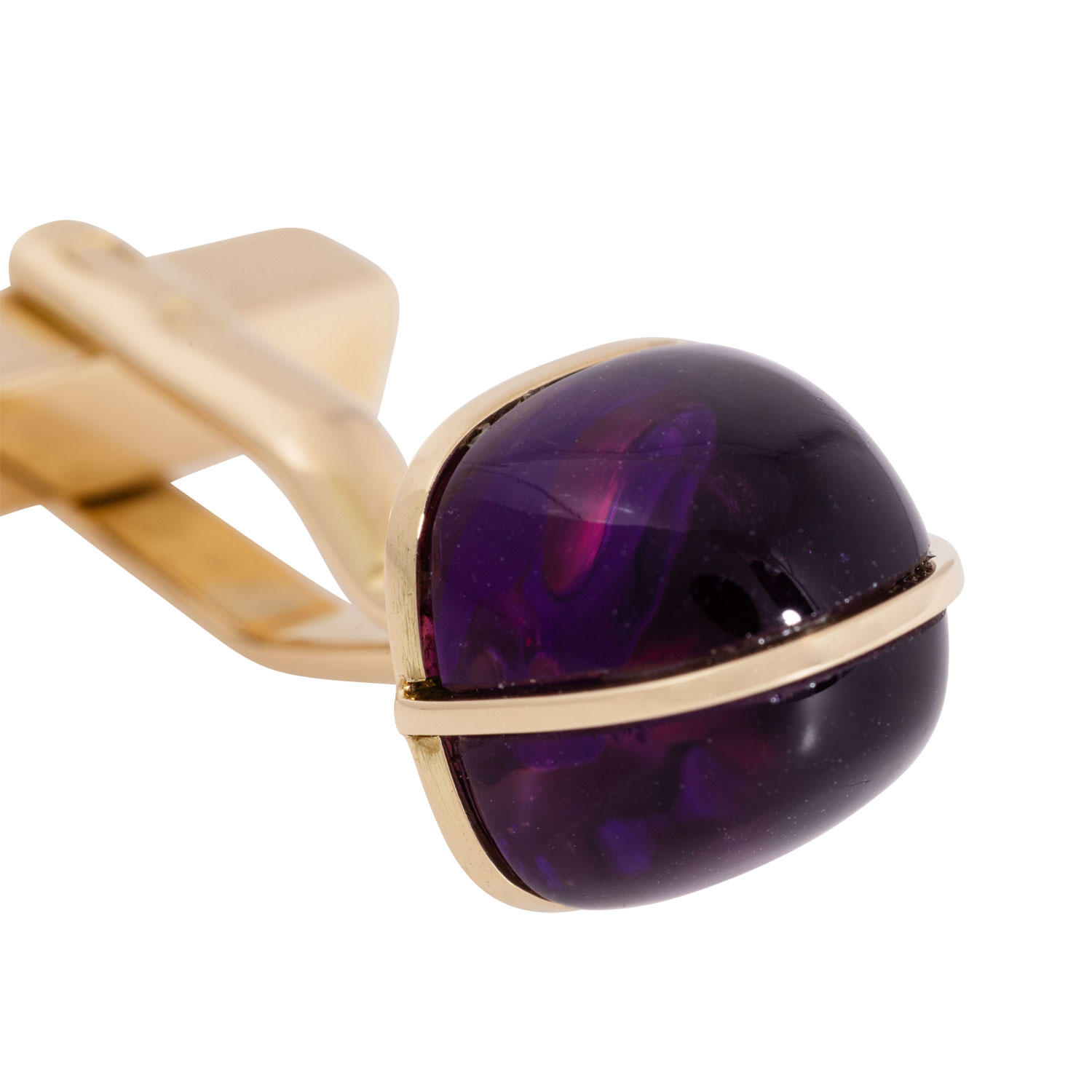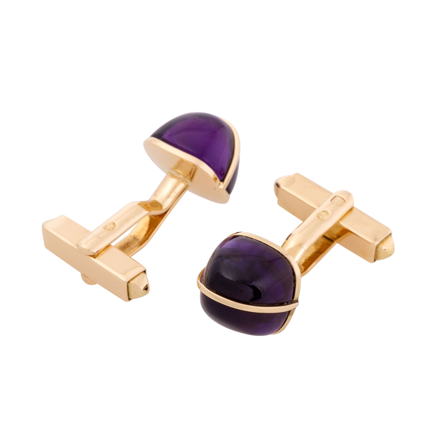 Pair of cuff links with 2 amethyst cabochons, D: ca. 12 mm, 18K yellow gold, 13.8 g, late 20th century, minimal signs of wear.