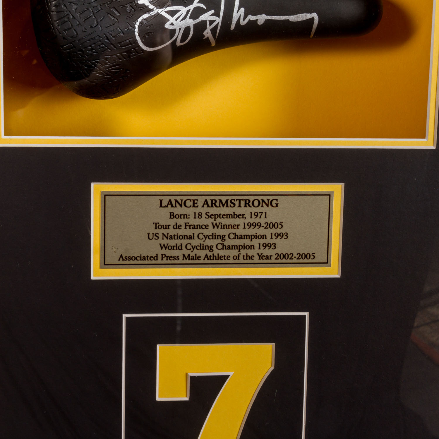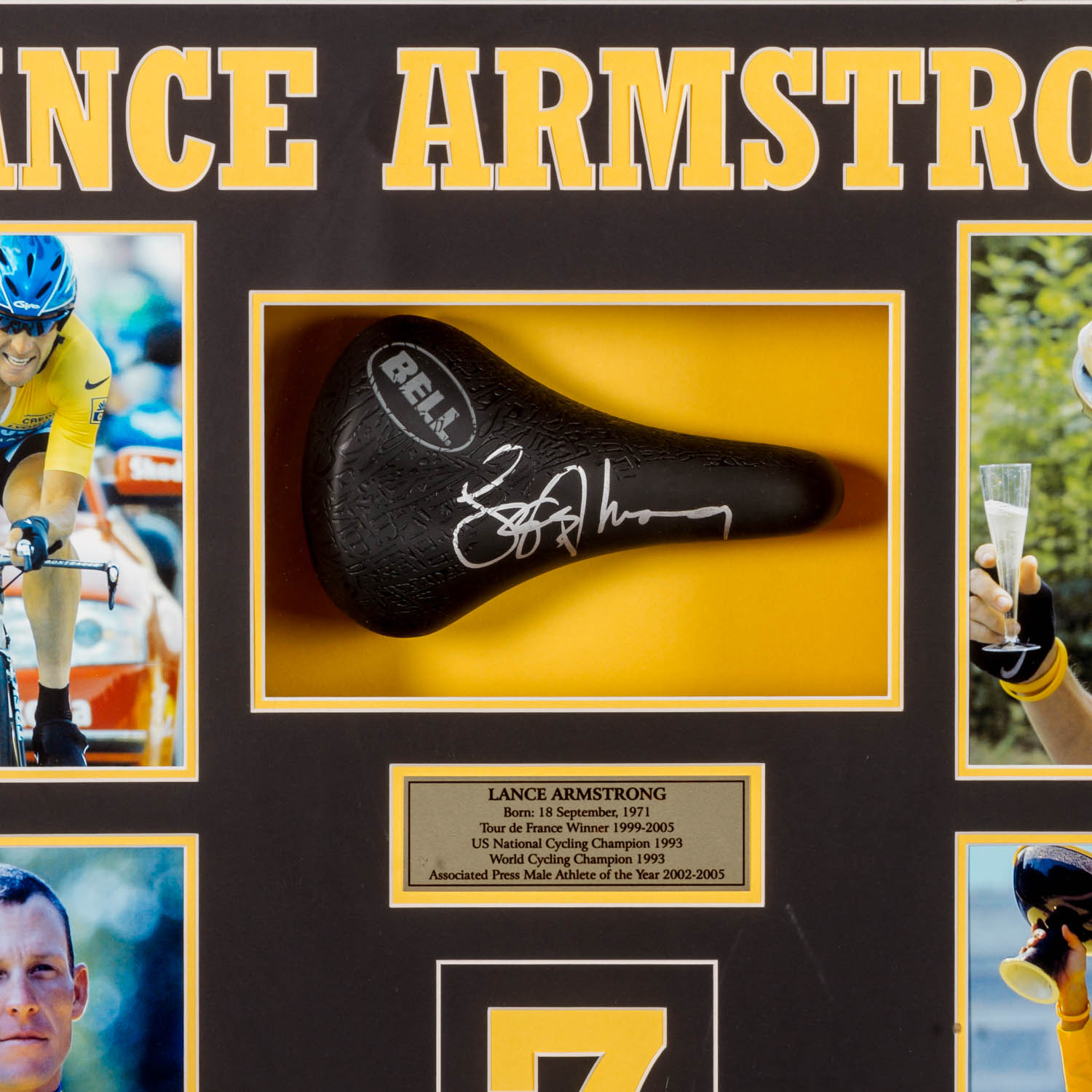 CYCLING RACING - LANCE ARMSTRONG Originally signed saddle in a huge showcase frame, with 4 photos and embedded plaque with the inscription 'Lance Armstrong, Born: 18 September, 1971, Tour de France Winner 1999-2005, US National Cycling Champion 1993, World Cycling Champion 1993, Associated Press Male Athlete of the Year 2002-2005'. Dimensions of the frame approx. 78 x 85 cm, depth approx. 14 cm. Slightly bumped on the outside, signs of wear.