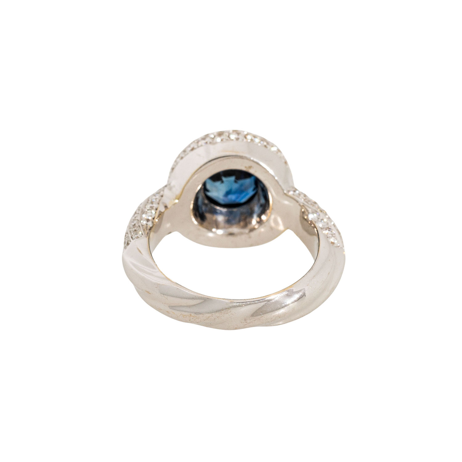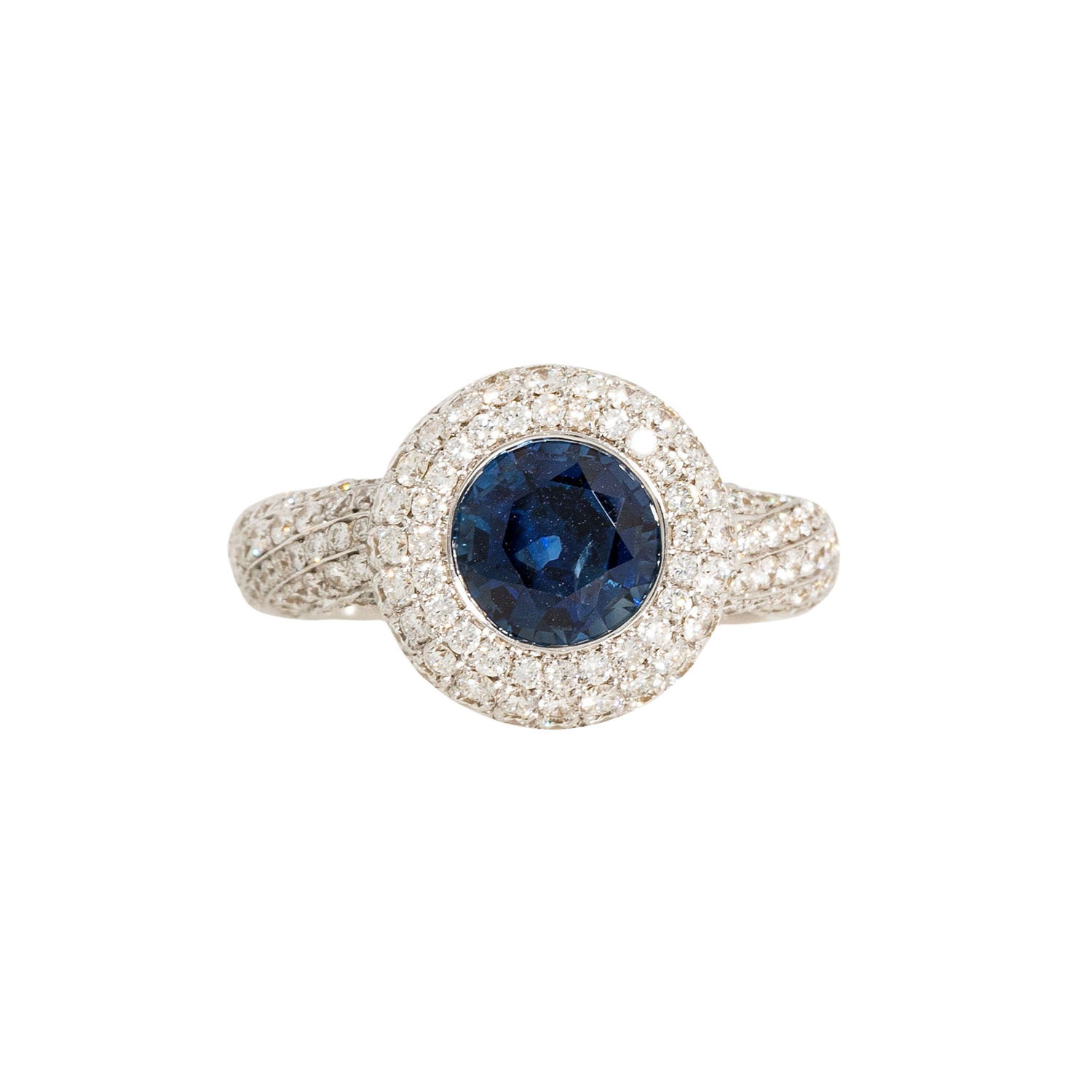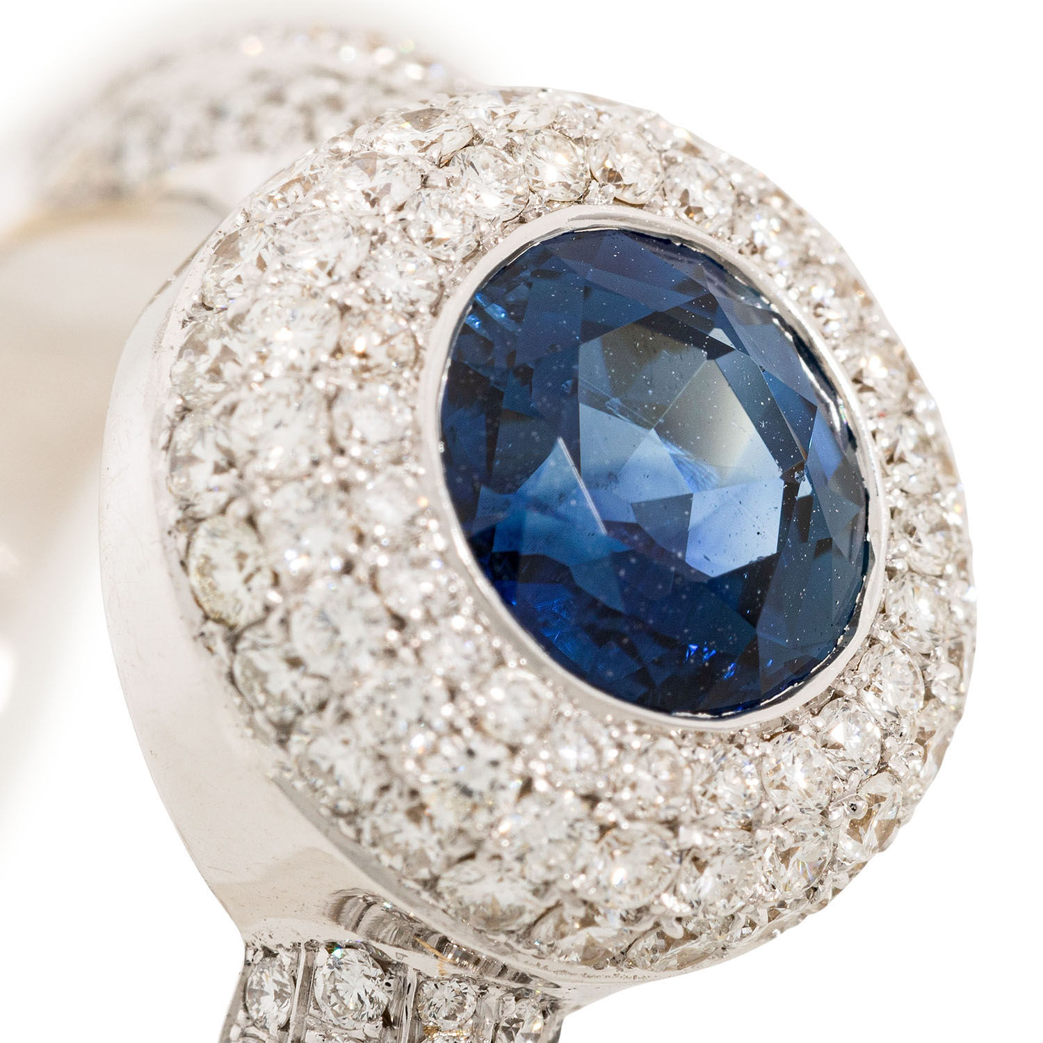 Ladies ring, set with 1 fine blue Ceylon sapphire ca. 3,0 ct. and brill. cut diamonds tot. ca. 1,6 cts. G/VSI1. WG 18 K, 12,3 g. Size ca. 54. High quality craftsmenship.