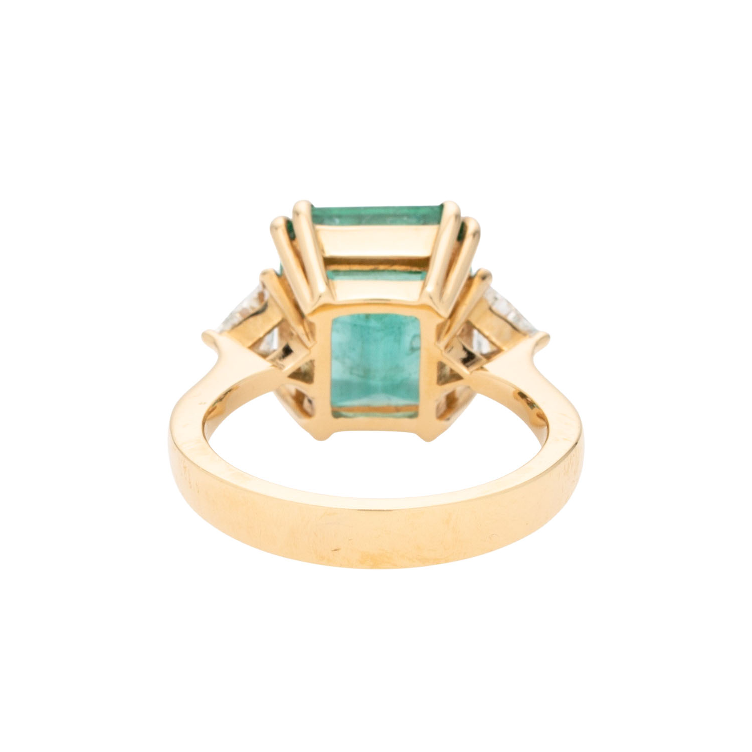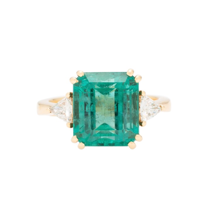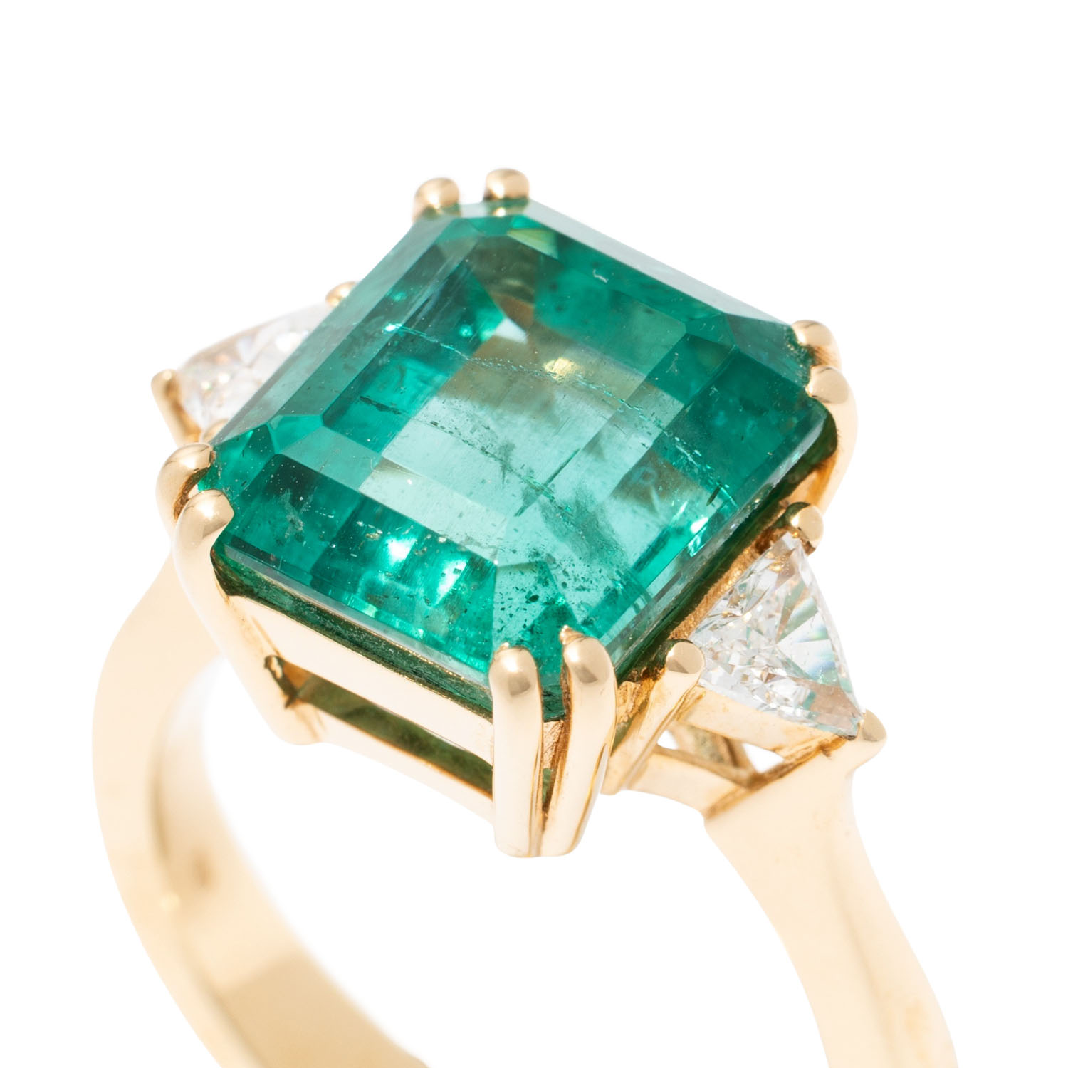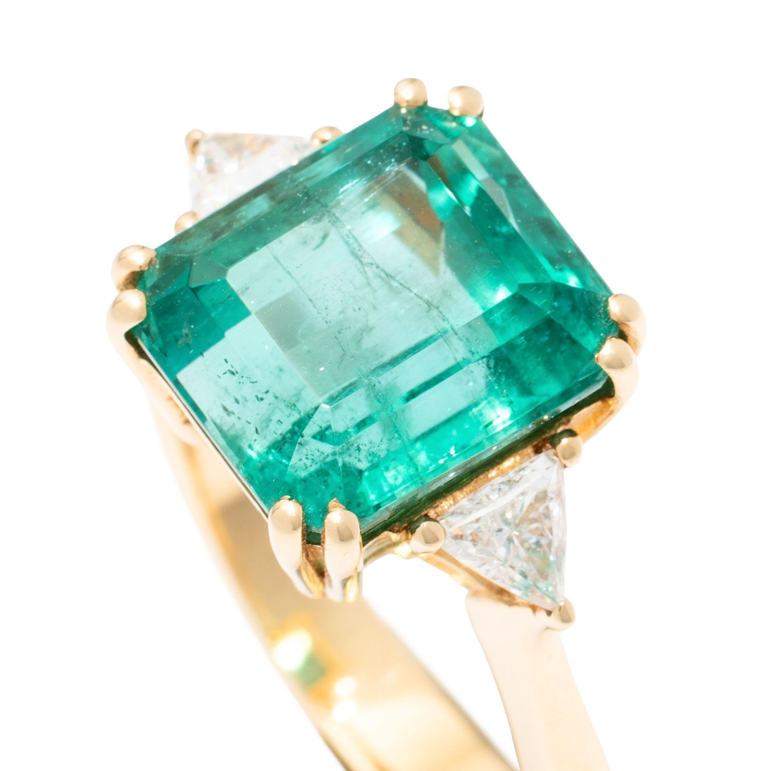 Ring with a vivid Zambian emerald 7,52 ct. and Diam. triangle cut tot. 0,41 ct. G/VSI. YG 18 K, 8,23 g. SIze ca. 55. High jewelry craftsmenship.