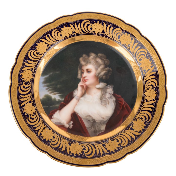Decorative plate ‘Mrs Braddyll’, 19th/20th century. White porcelain with cobalt blue and richly gold-decorated rim, the mirror with a fine painting of the portrait of Mrs Braddyll after the painting by Sir Joshua Reynolds from 1788, underglaze blue shield mark on the underside, handwritten numbers ‘12877 41’ and motif inscription, d. approx. 24.5 cm. Signs of age.