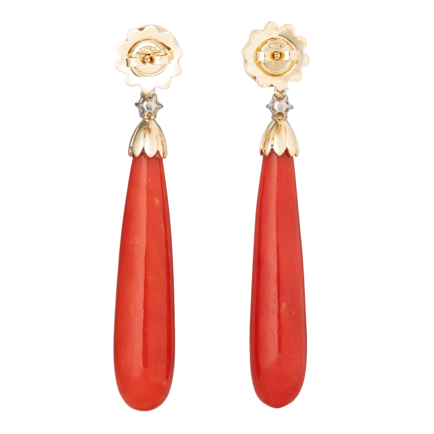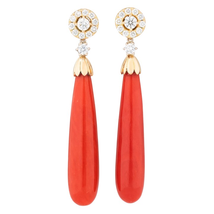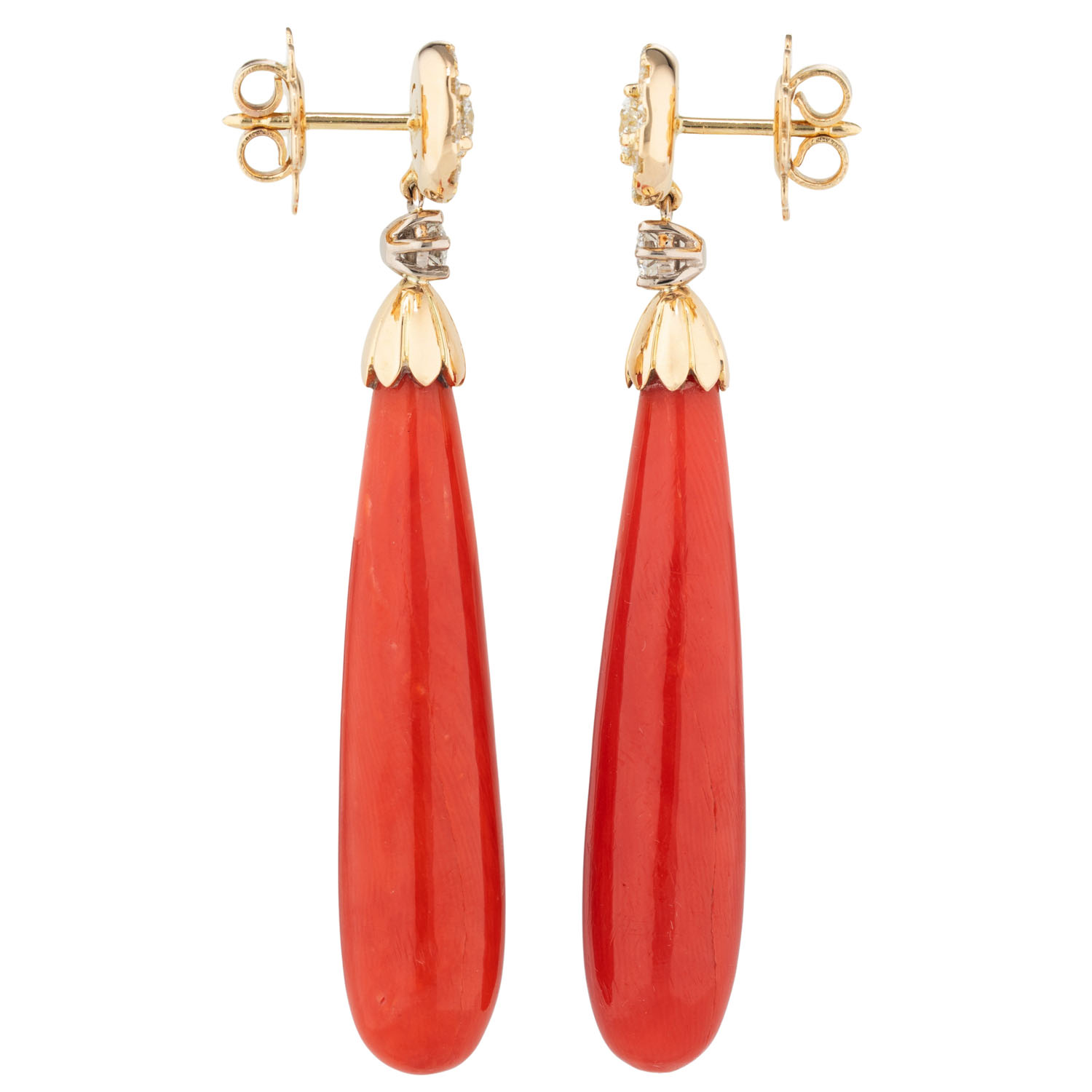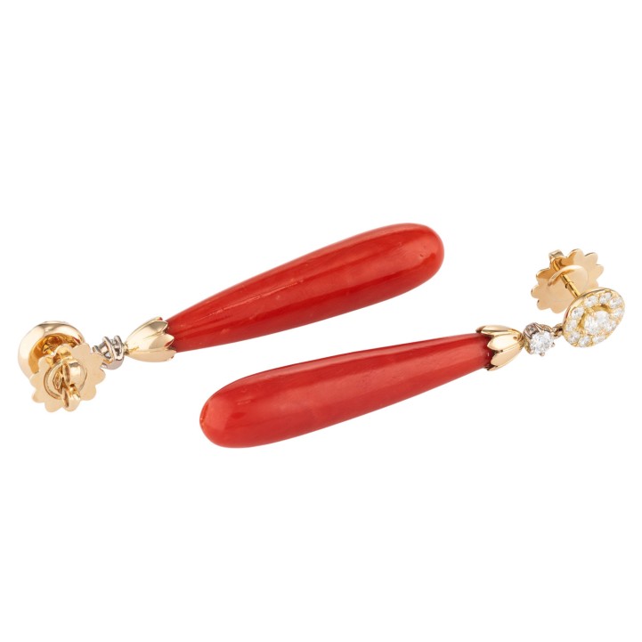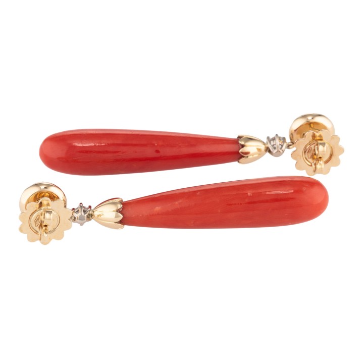 Long drop earrings with coral and diamonds totaling ca. 0.2 ct,