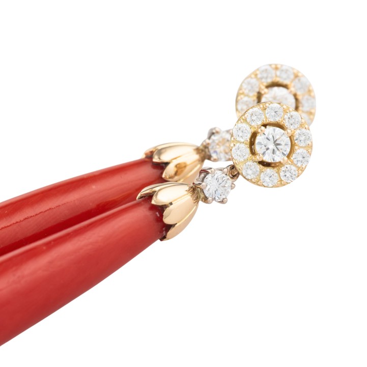 Decorative earrings with natural coral and diamonds brilliant cut TW/SI, tot. 0,97 ct. YG 18 K