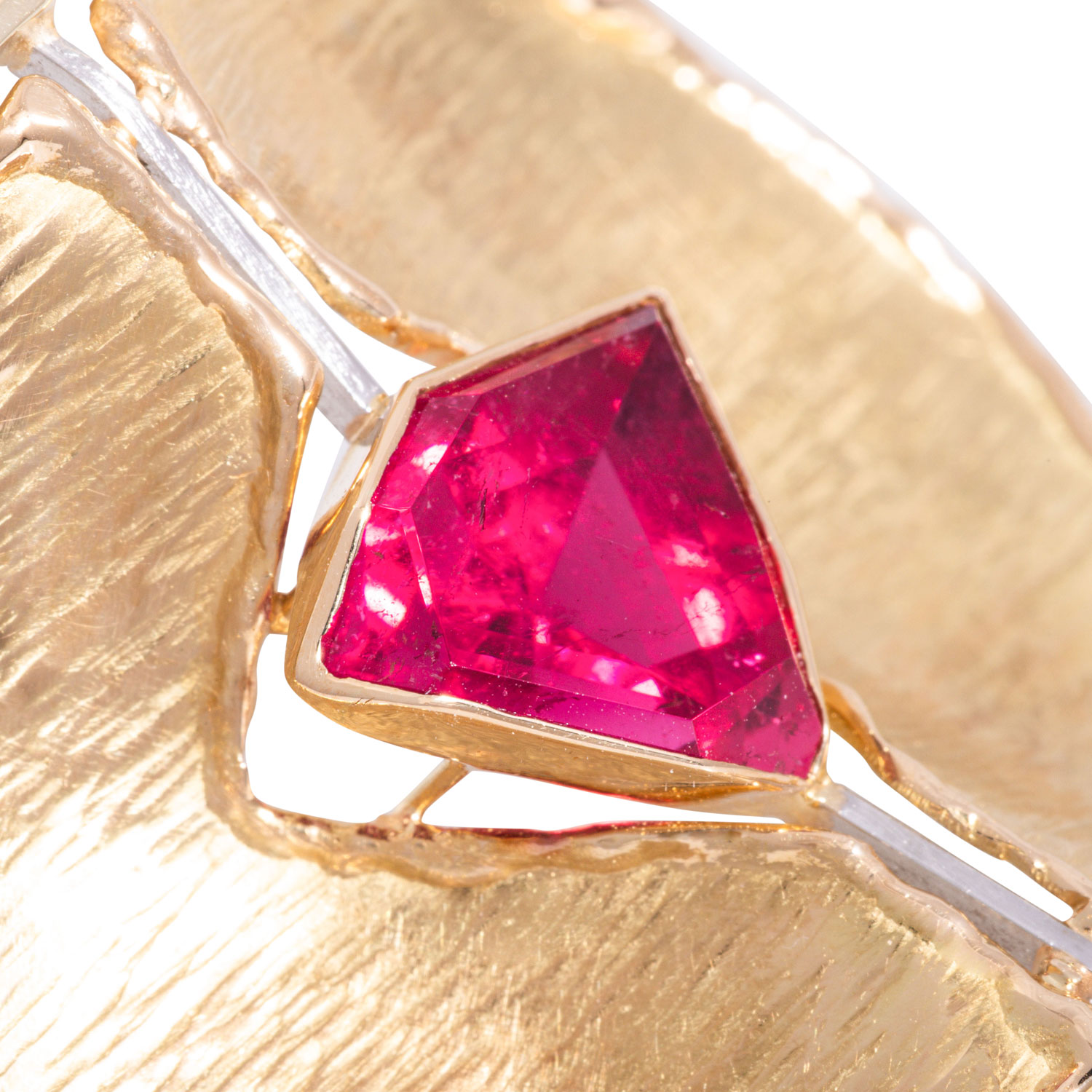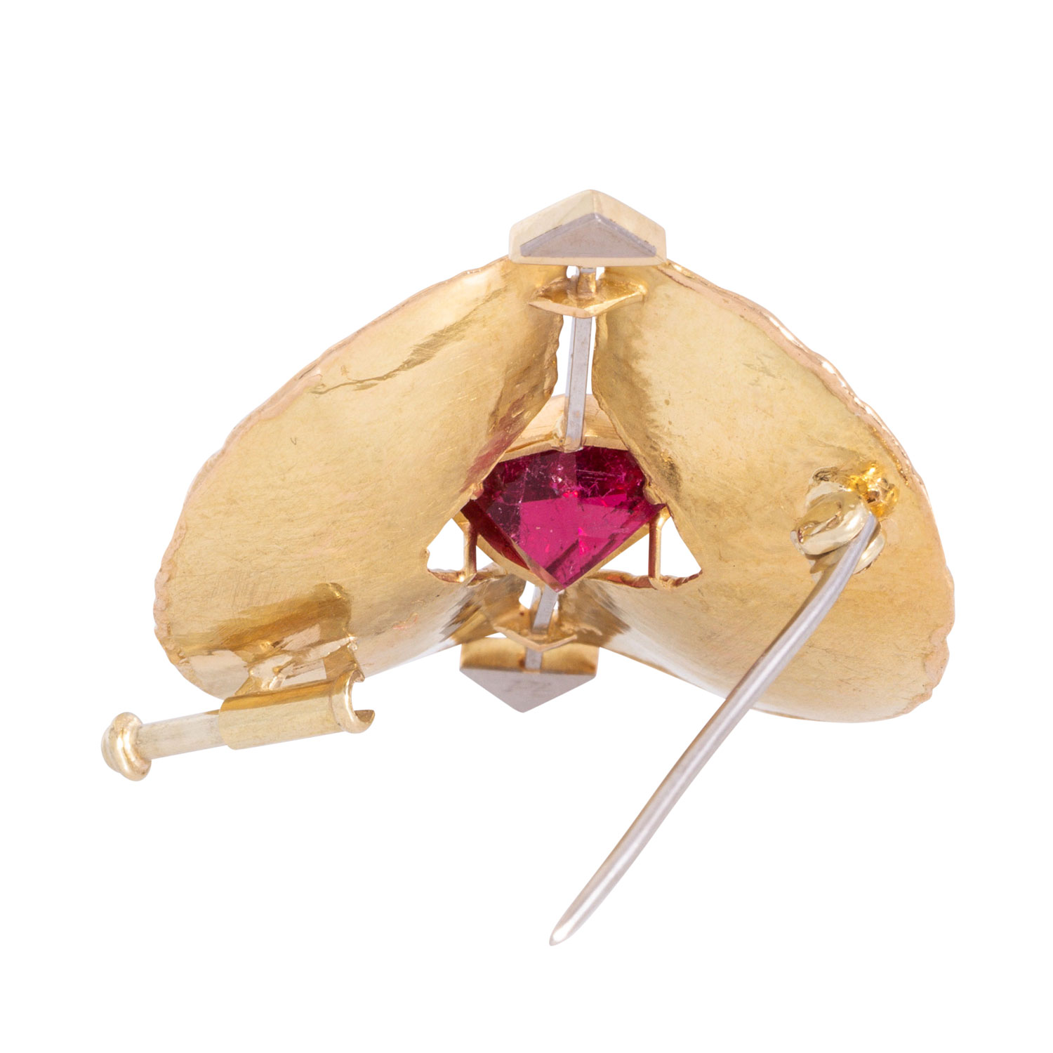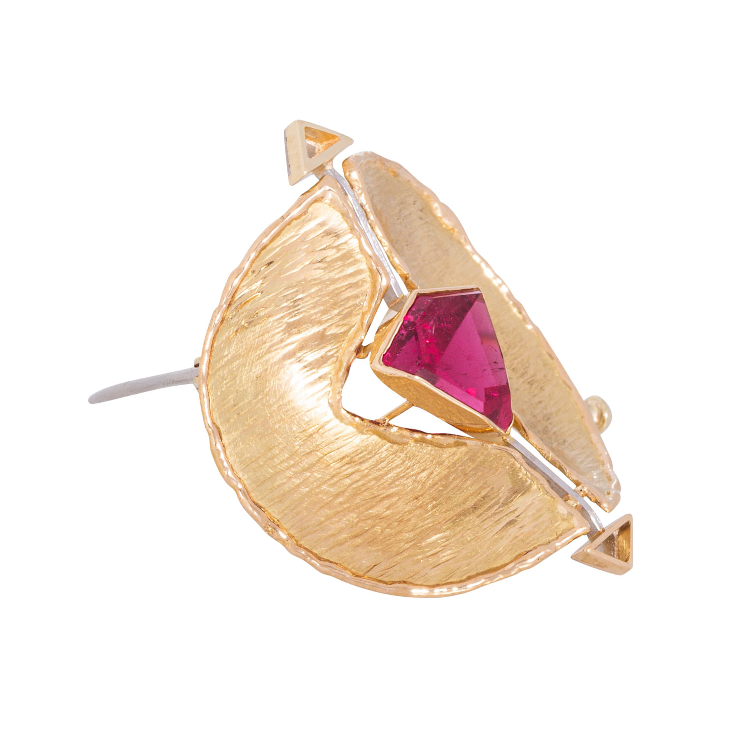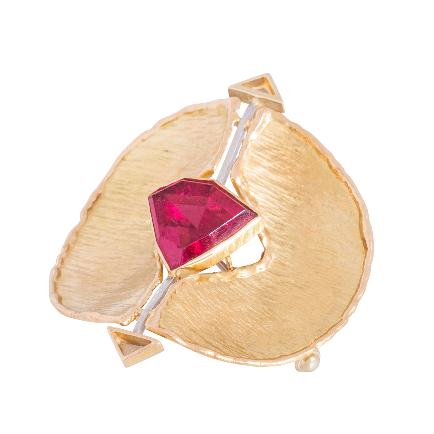 Designer's brooch with fine triangular rubelith tourmaline, intense colour, 18K yellow gold and platinum, 6.2 g, D: 3 cm, 1980s, good condition, with maker's signature (Matthias Zacke), handcrafted, including certificate.