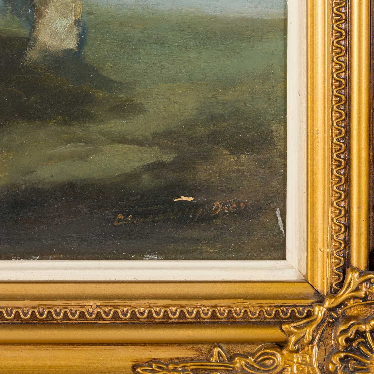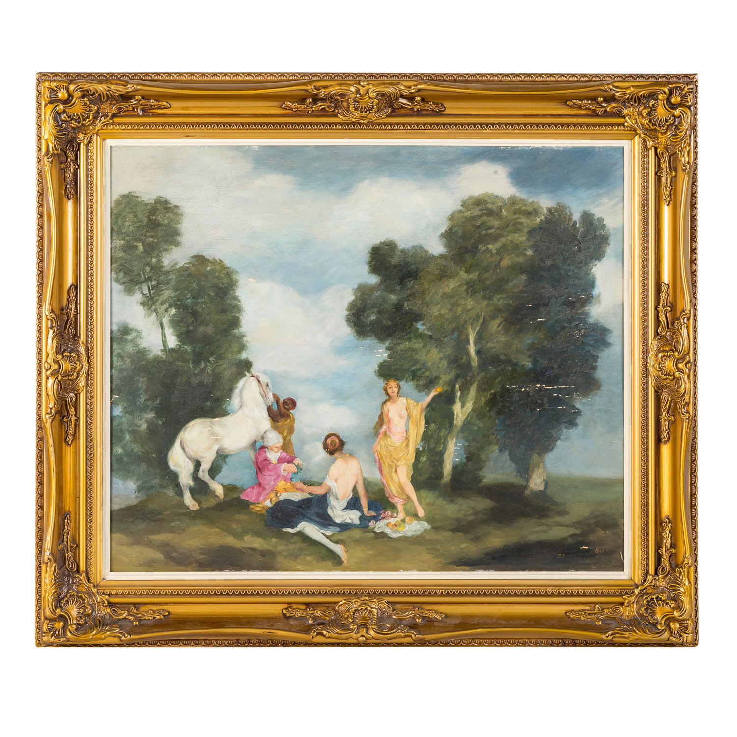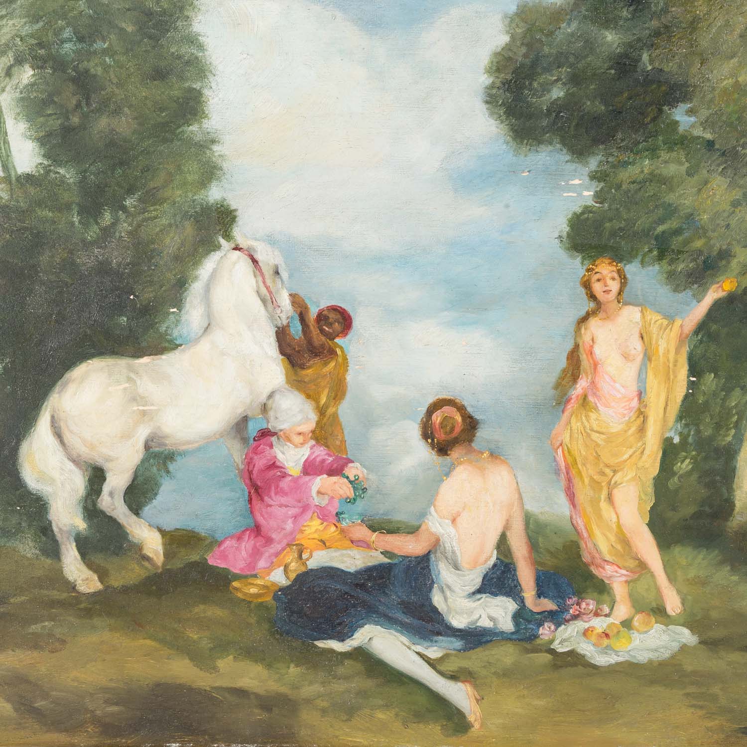 DIER, ERHARD AMADEUS (1893-1969), 'Gallant company on a summer meadow', two scantily clad young ladies with a servant and a horse tamer, in the Rococo style of the 1920s, signed, oil/wood, HxW: approx. 50x60 cm (65x75 cm with frame). Craquelé and chipped paint. With frame. signs of age.