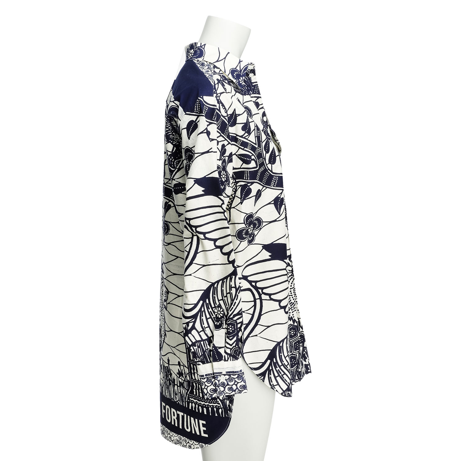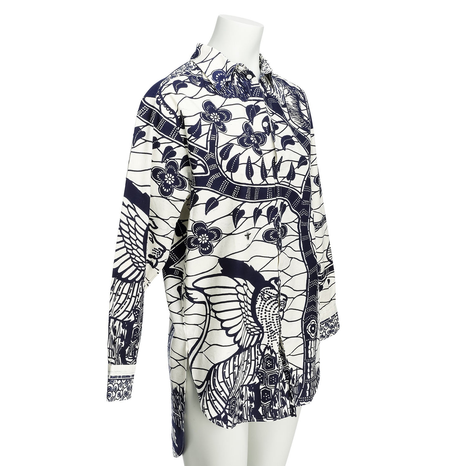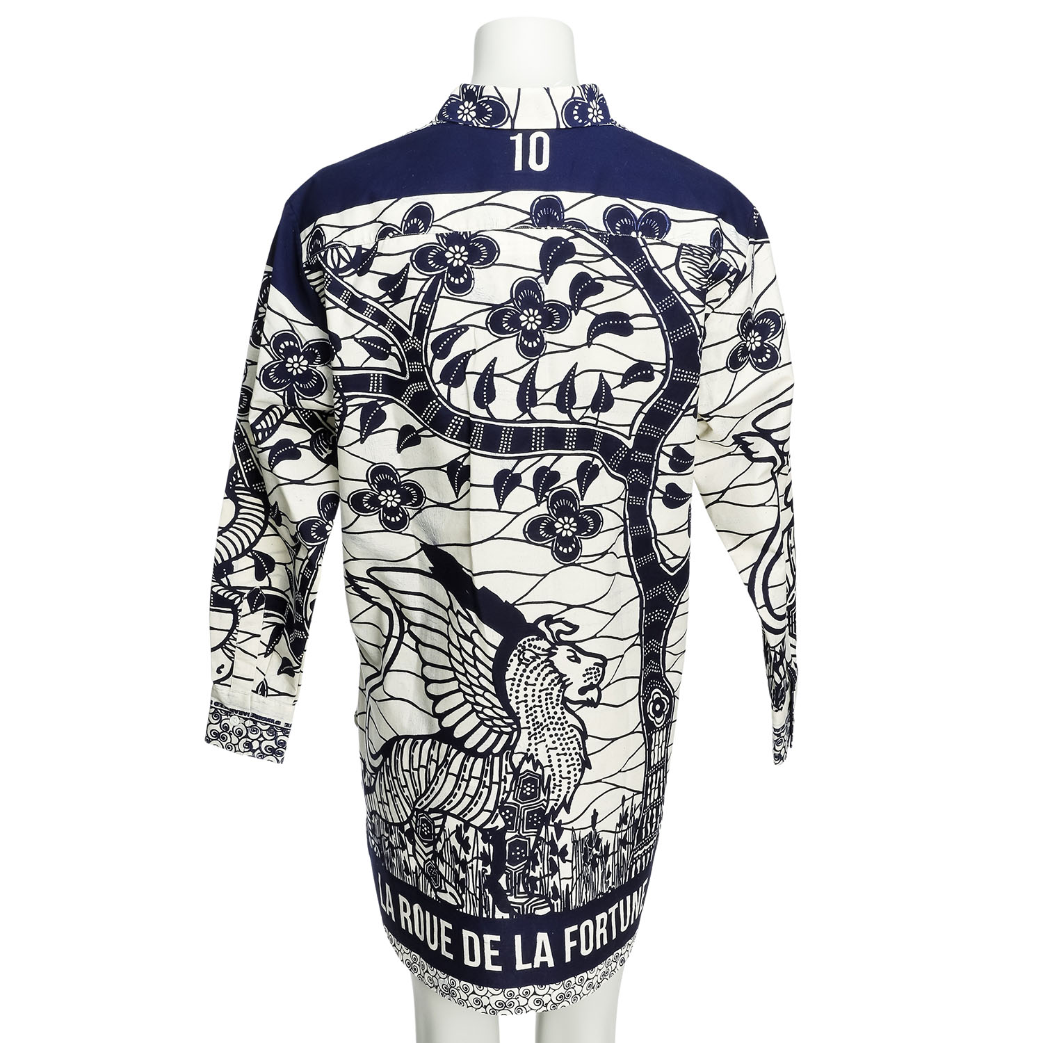 CHRISTIAN DIOR blouse ‘LA ROUE DE LA FORTUNE’, size 34. 100% cotton. Beige base colour with dark blue ‘La Roue de la Fortune’ pattern. Oversize cut. Mint condition.