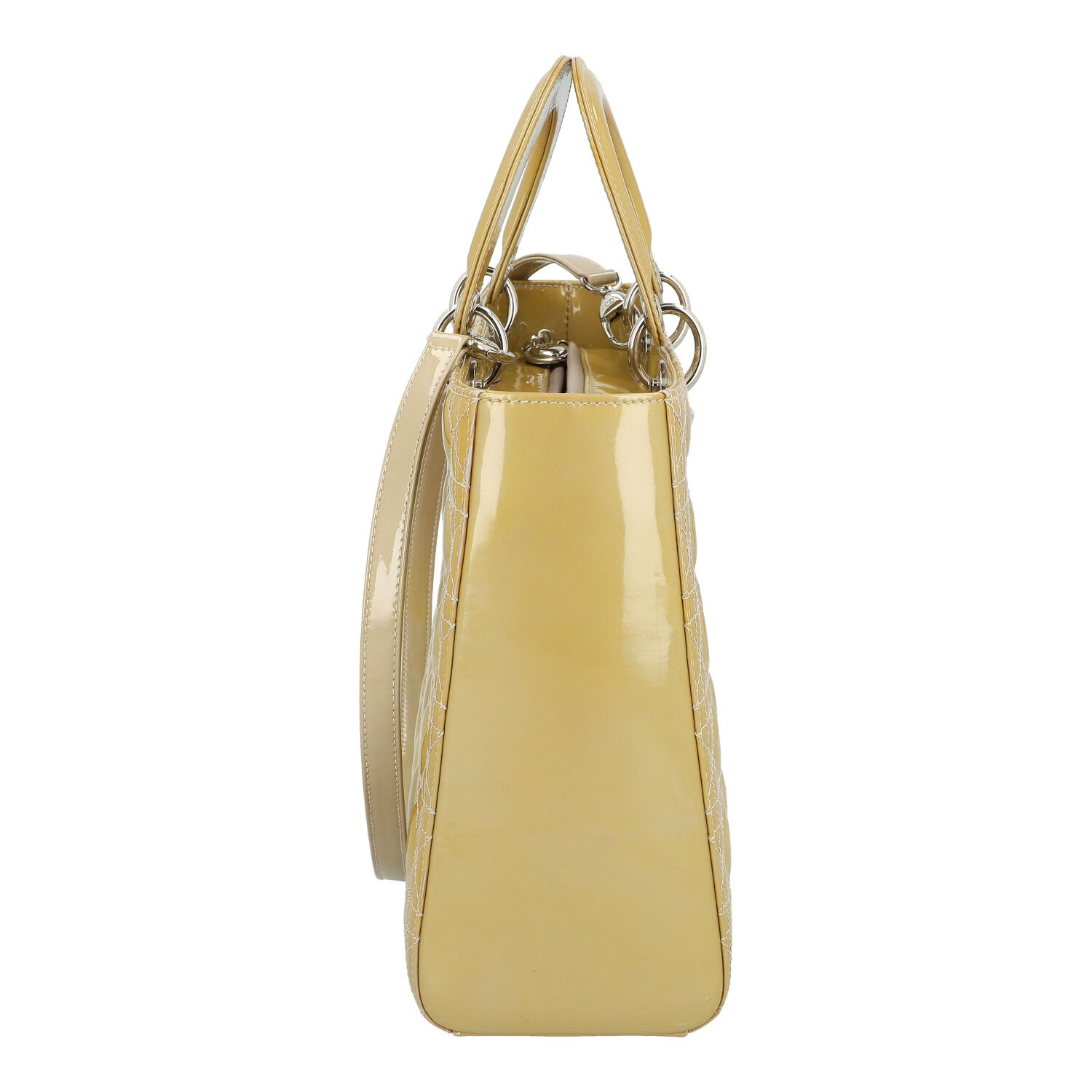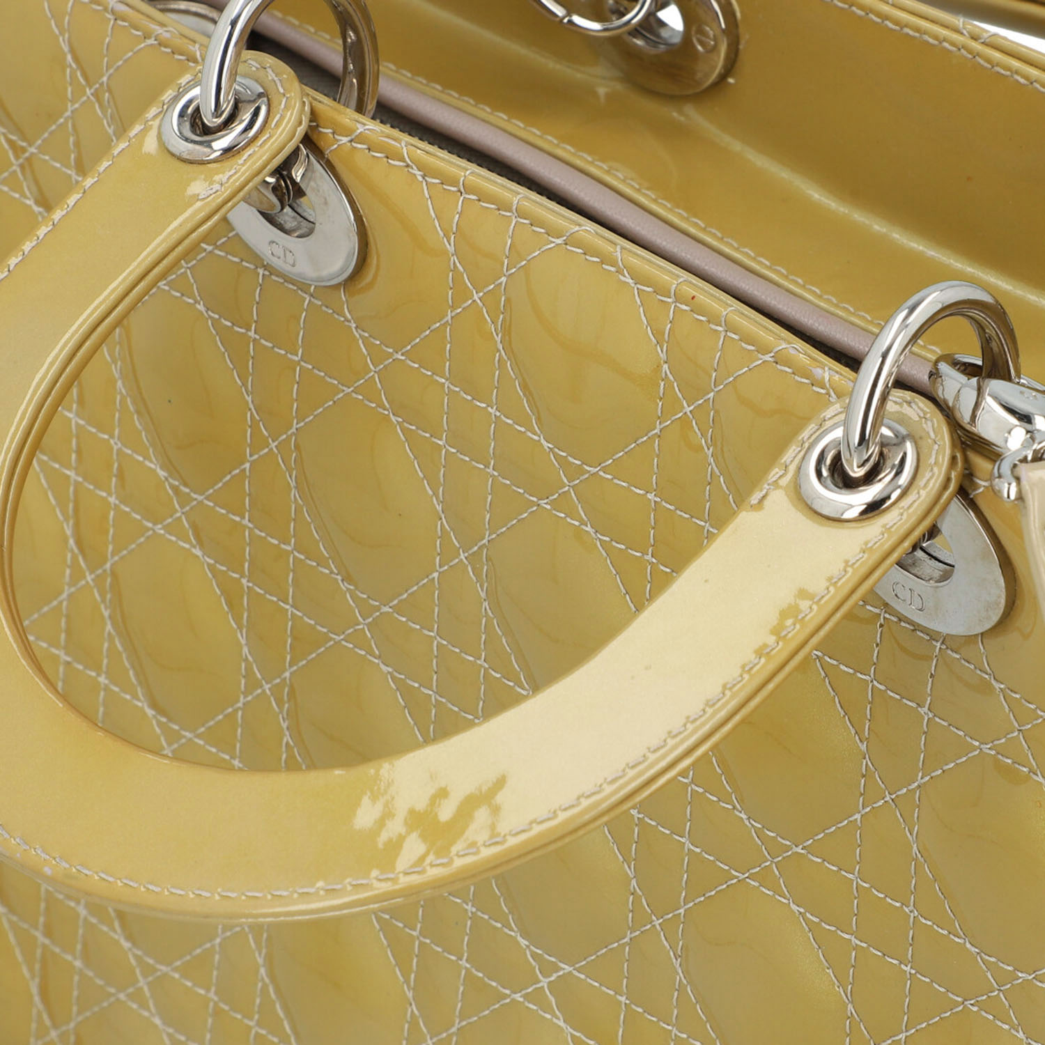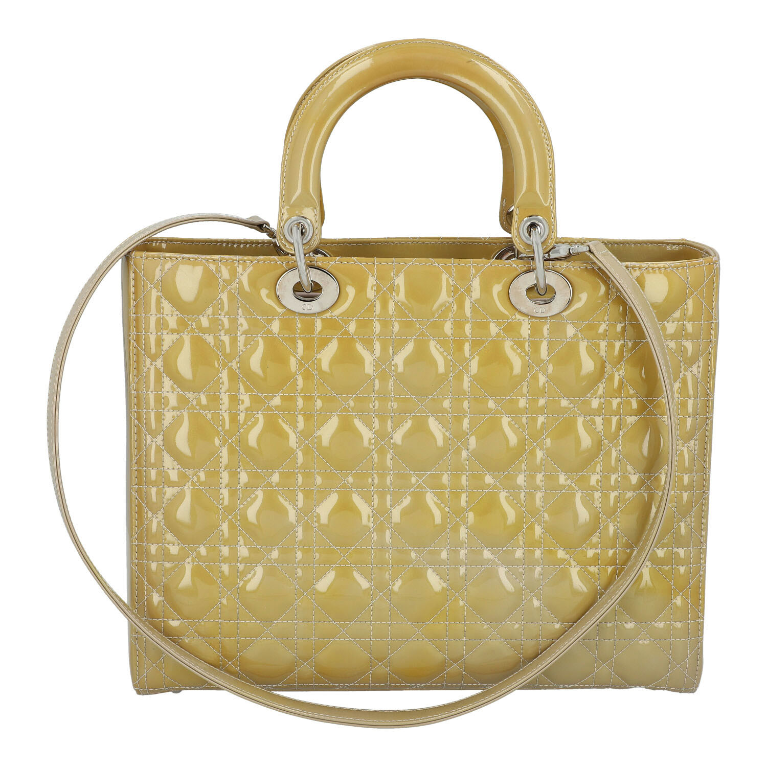 DIOR handbag 'GROSSE LADY DIOR'. Retail price 6.200€. Patent leather in gold with a green tint and cannage stitching, silver-coloured hardware, double handle, zipper and logo pendant. Interior with a zipped compartment and textile lining. Dust bag and shoulder strap included. Slight signs of wear and discoloration. 32 x 25 x 12 cm.