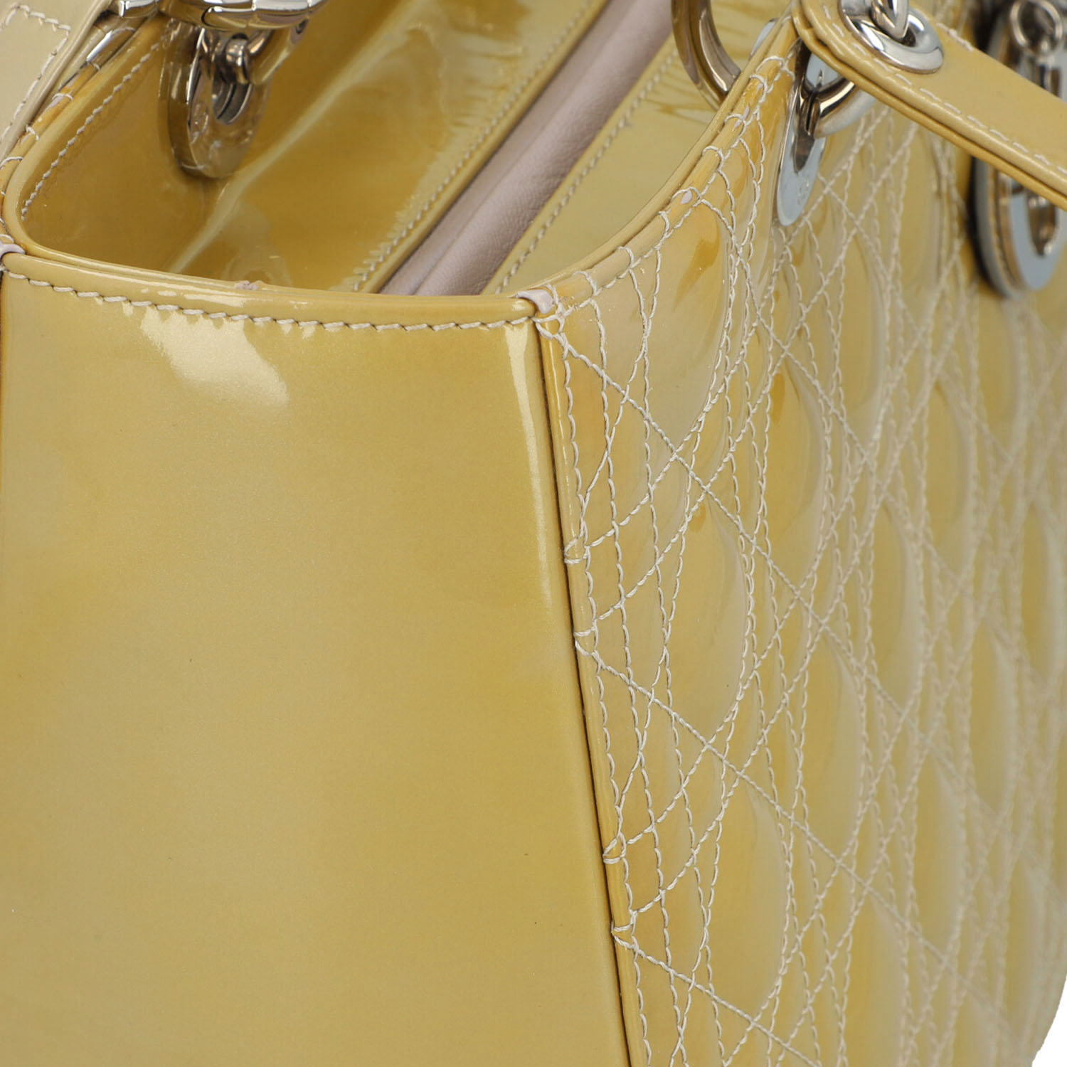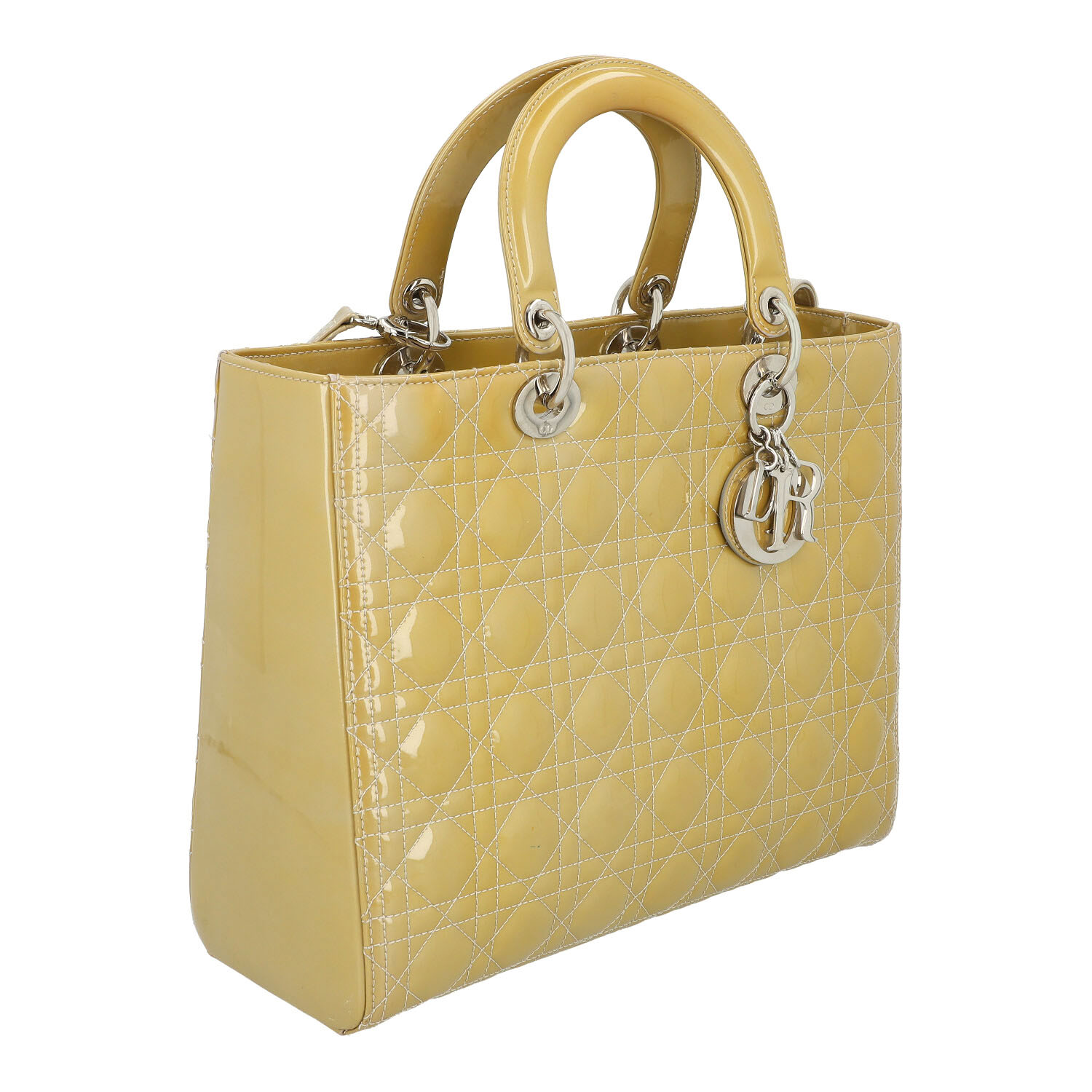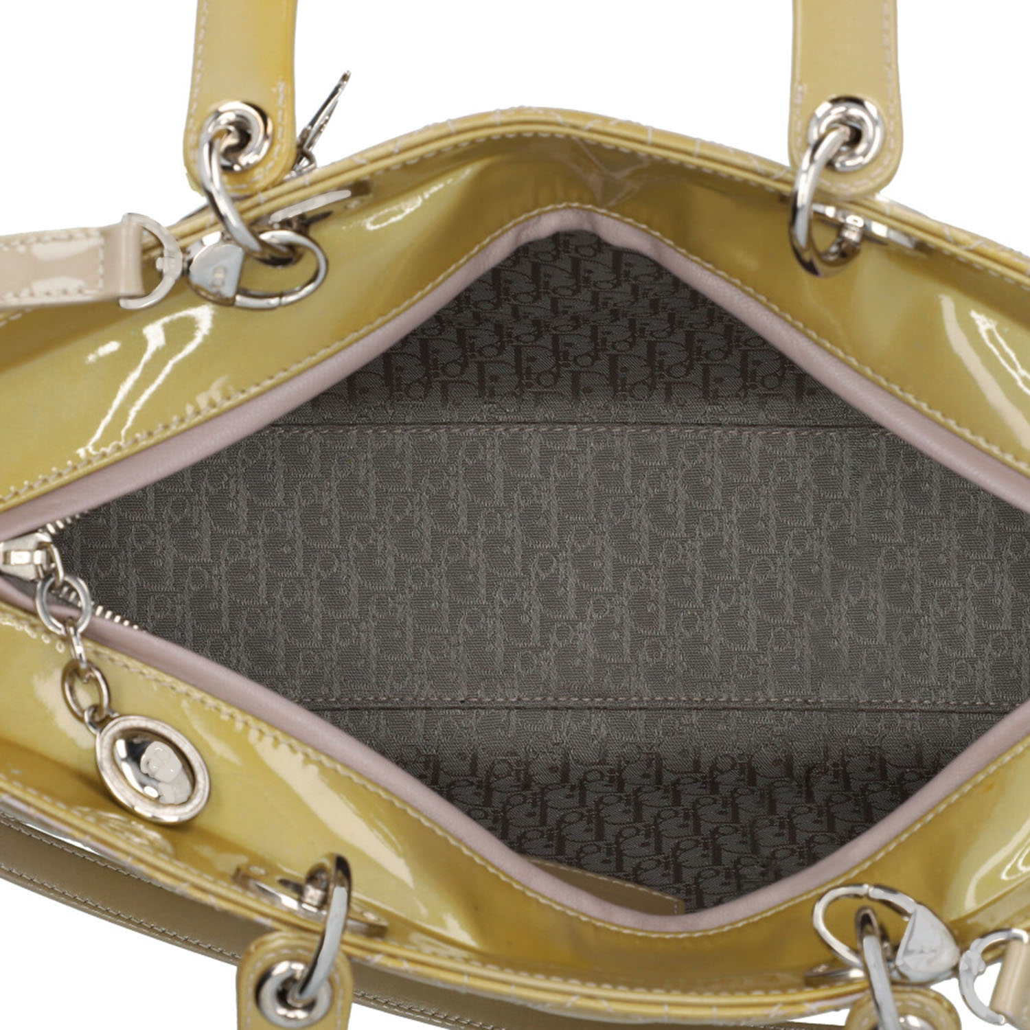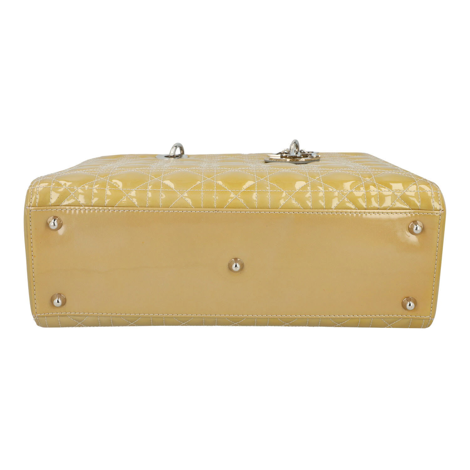 DIOR handbag 'GROSSE LADY DIOR'. Retail price 6.200€. Patent leather in gold with a green tint and cannage stitching, silver-coloured hardware, double handle, zipper and logo pendant. Interior with a zipped compartment and textile lining. Dust bag and shoulder strap included. Slight signs of wear and discoloration. 32 x 25 x 12 cm.