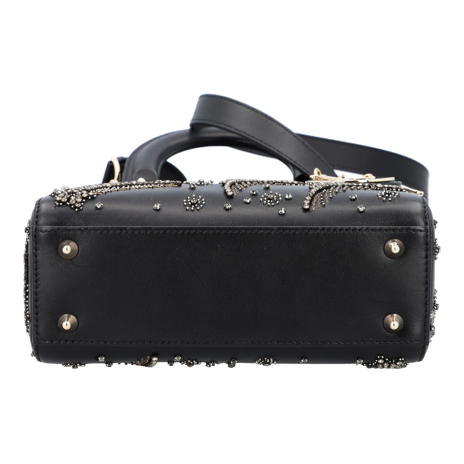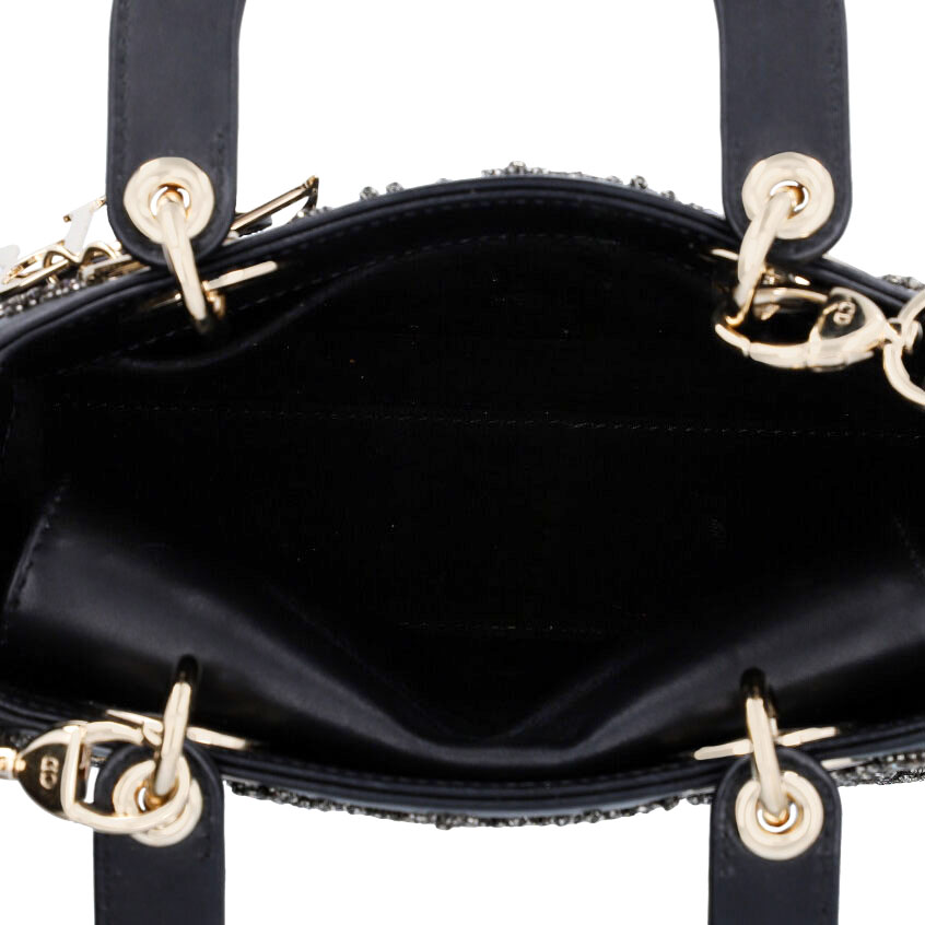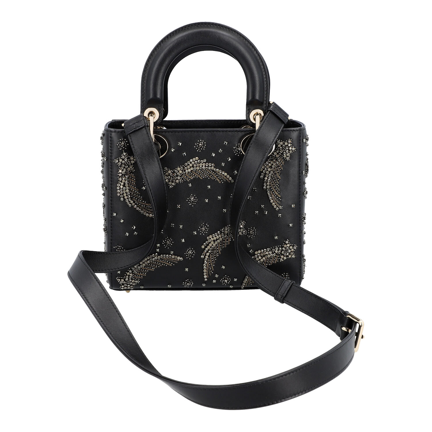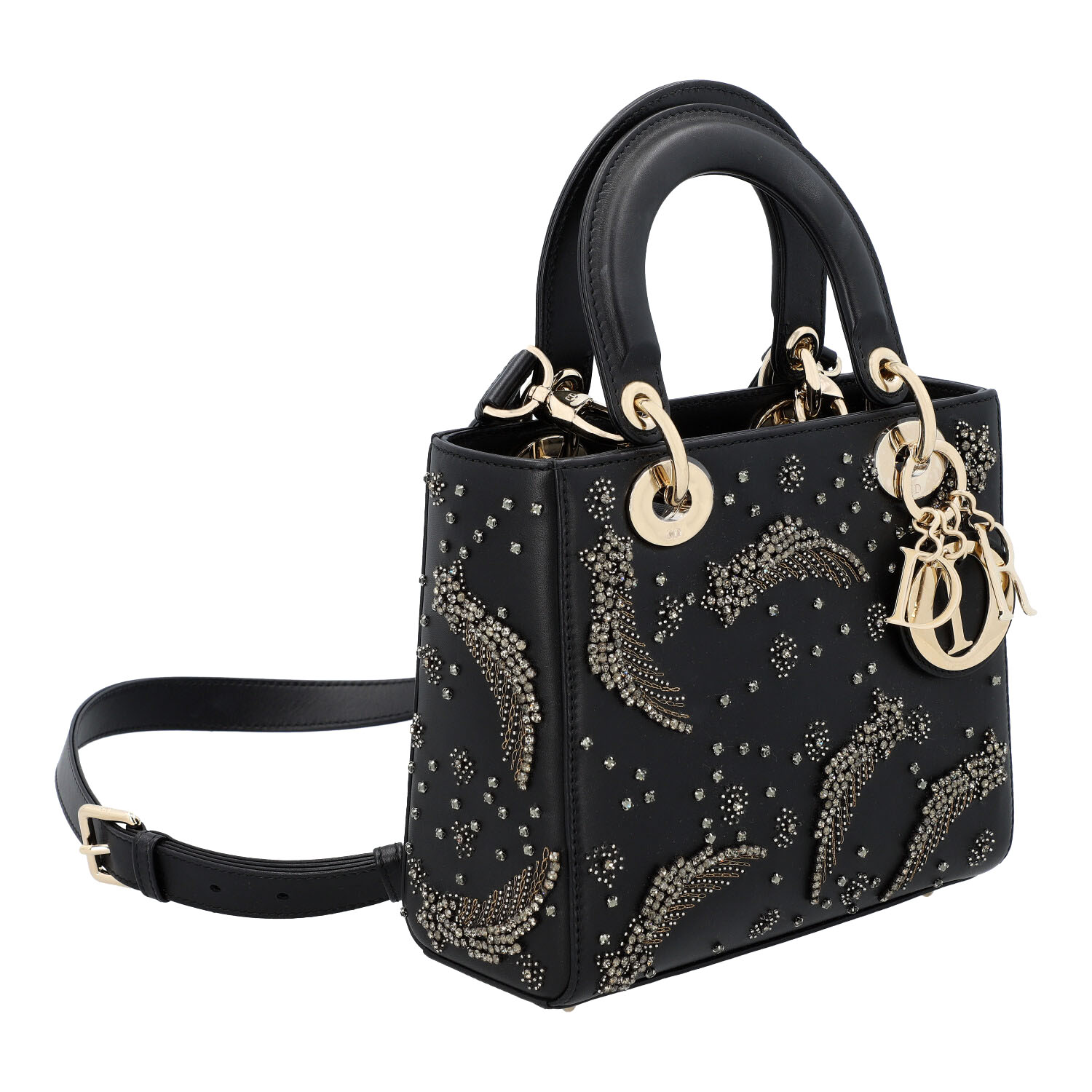 DIOR handbag “LITTLE LADY DIOR”, coll. 2024. Retail price 7.900,-€. Lambskin leather with star-snake embroidery in black. Decorative rhinestone details. Model no longer available. Box, dust bag and shoulder strap enclosed. Slight signs of wear on the inside and outside. Small size 20x8x18cm.