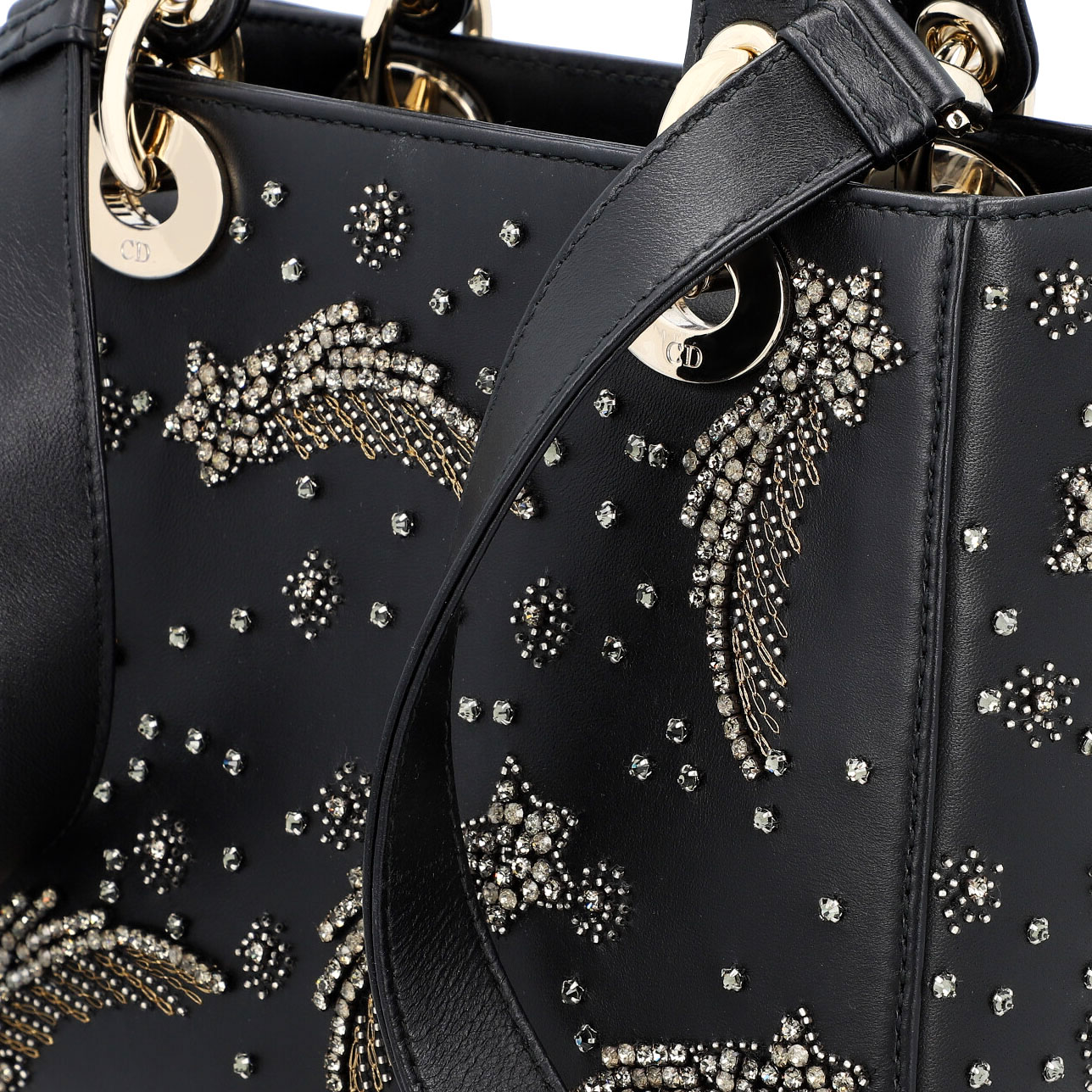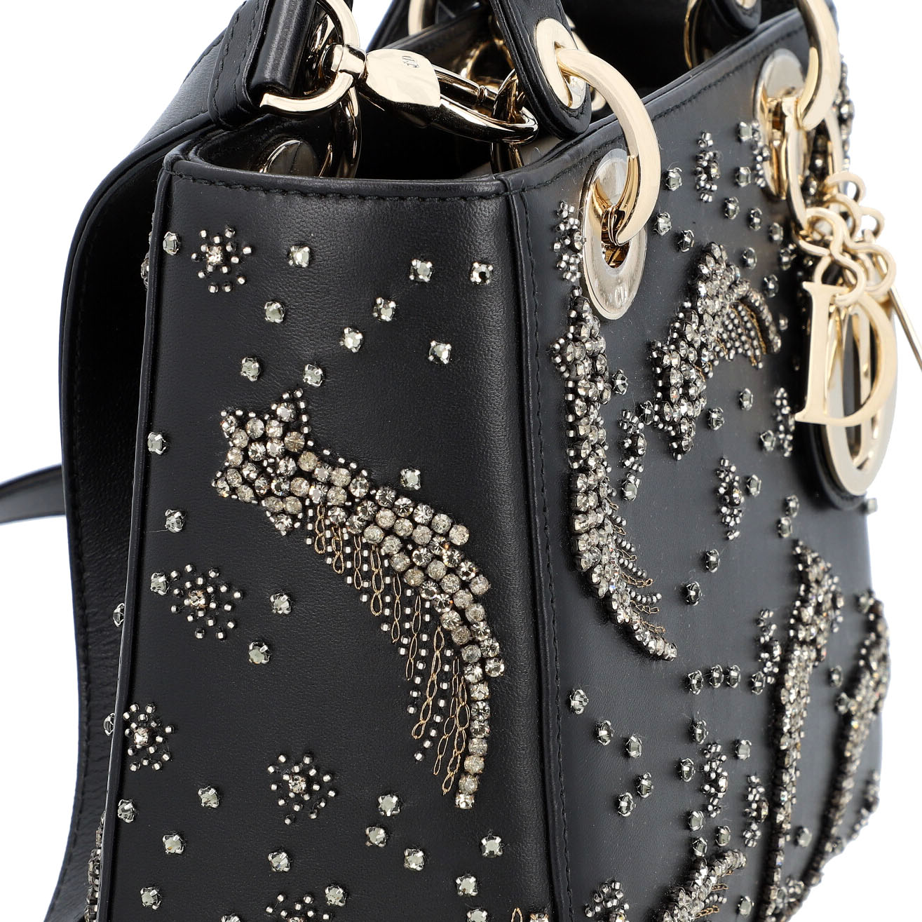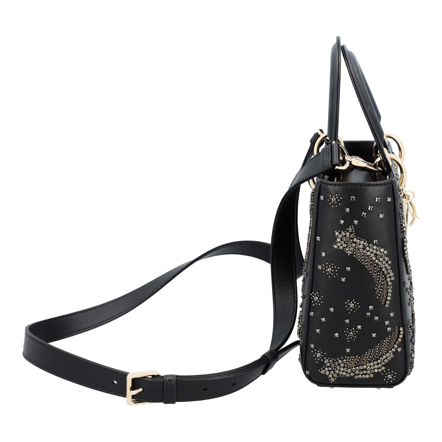 DIOR handbag “LITTLE LADY DIOR”, coll. 2024. Retail price 7.900,-€. Lambskin leather with star-snake embroidery in black. Decorative rhinestone details. Model no longer available. Box, dust bag and shoulder strap enclosed. Slight signs of wear on the inside and outside. Small size 20x8x18cm.