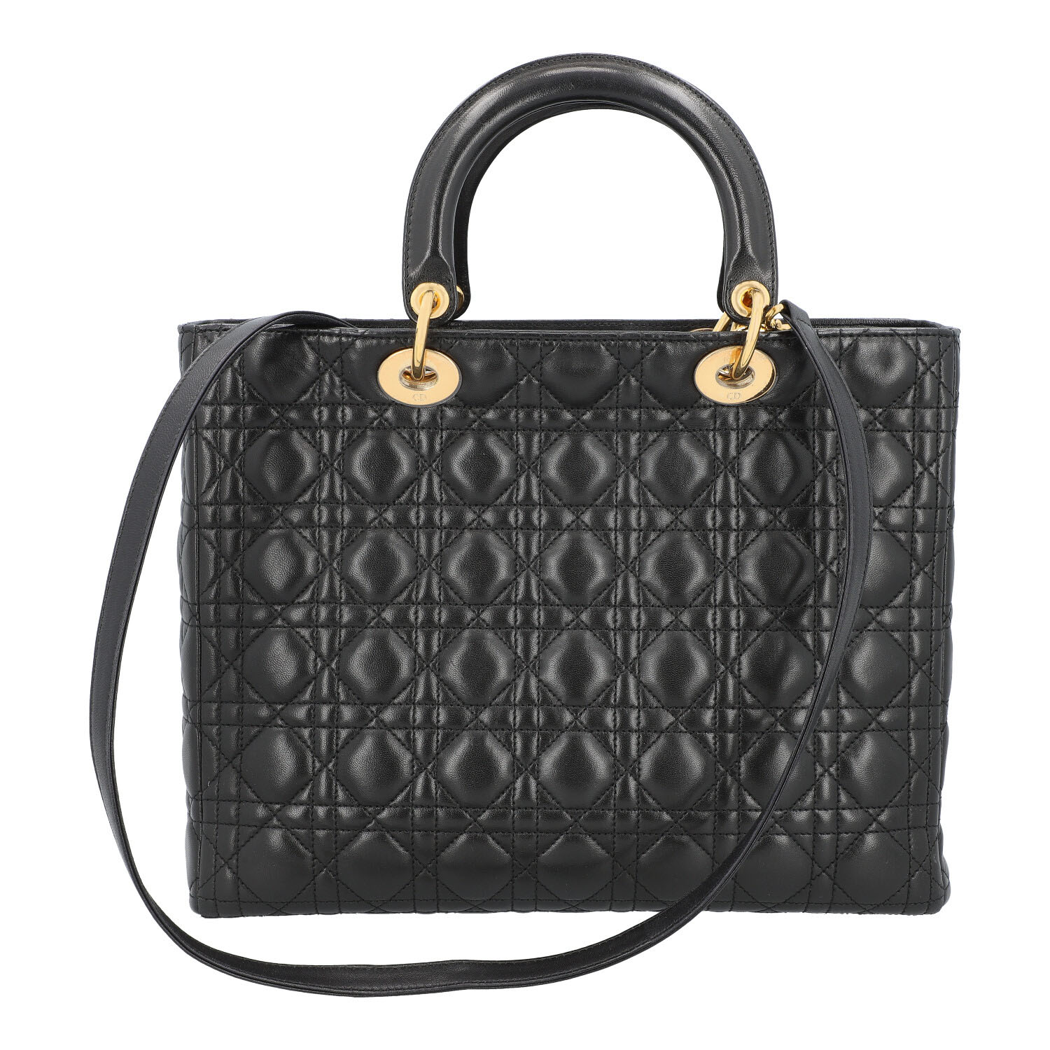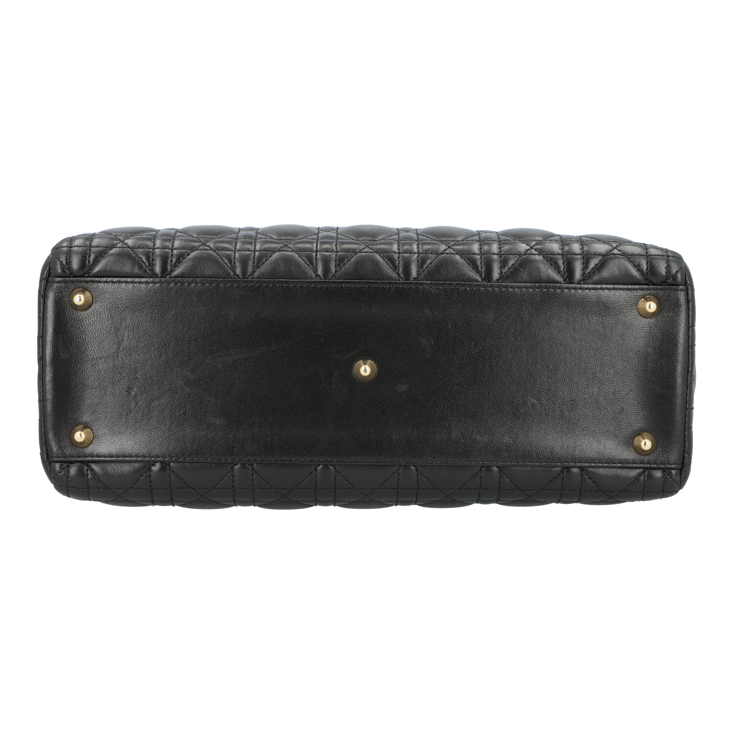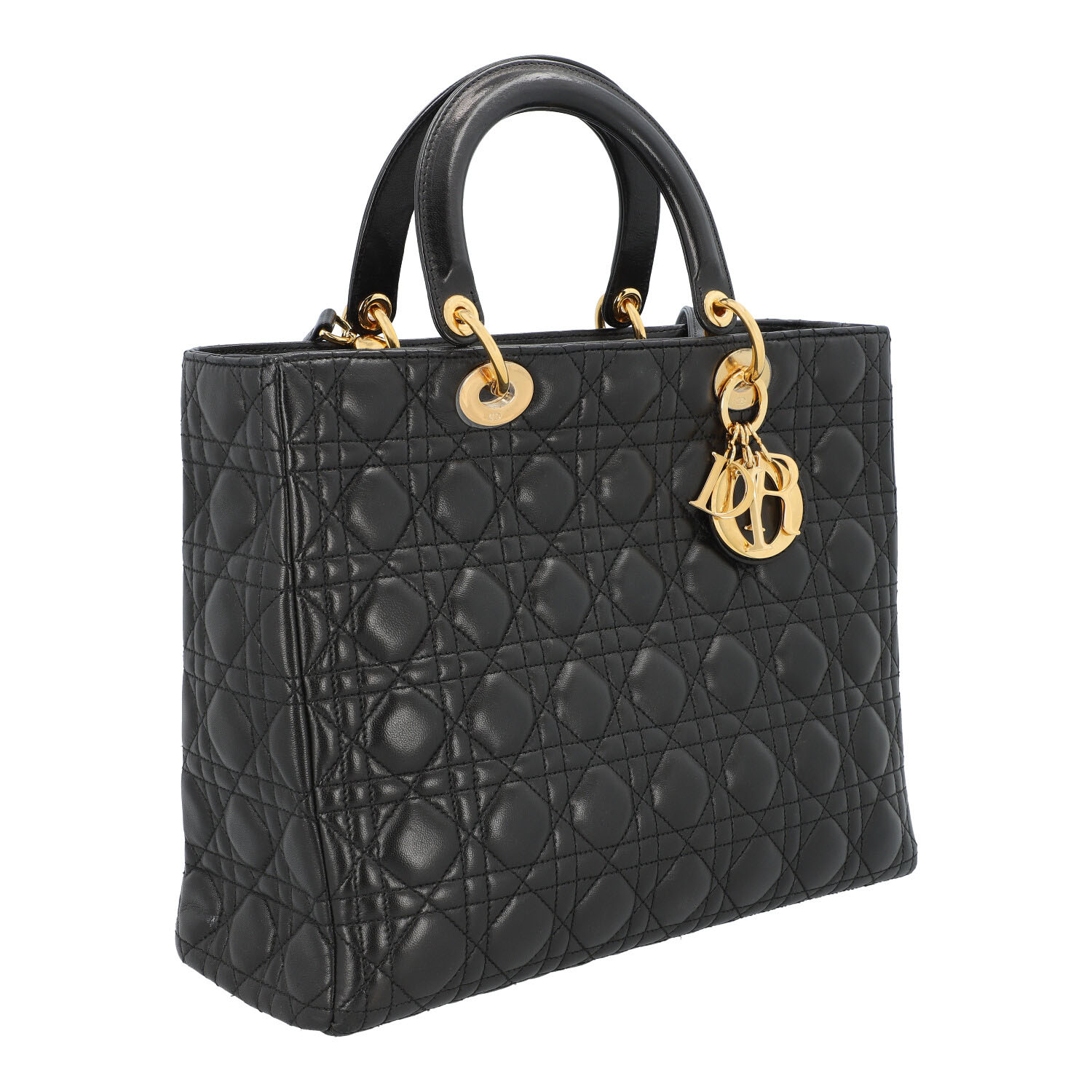 DIOR handle bag ‘LARGE LADY DIOR’, coll.: 2008, retail price: €6,200. Black cannage lambskin with gold-coloured metal fittings, double handle, zip fastening, logo pendant and detachable shoulder strap. Red textile interior with a zip compartment. Invoice and card enclosed. Signs of wear. 32 x 12 x 25 cm.