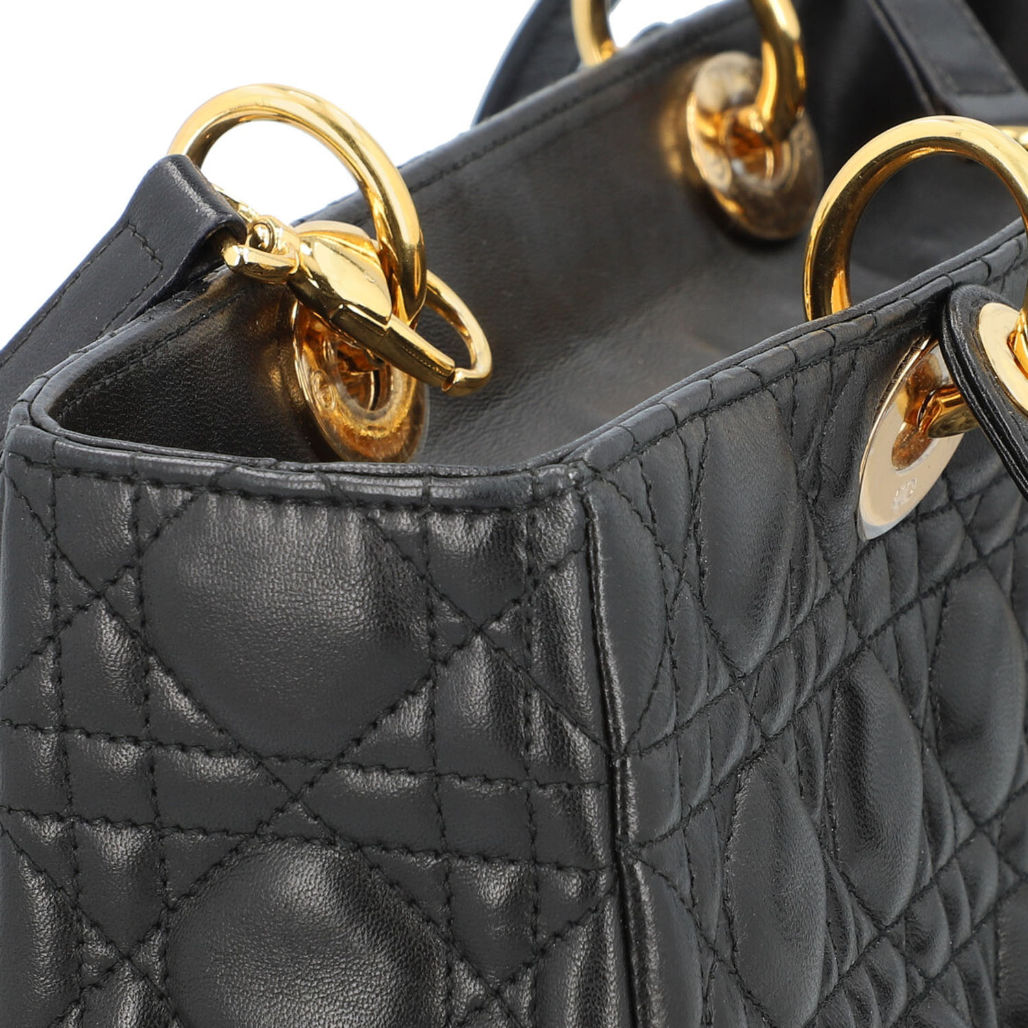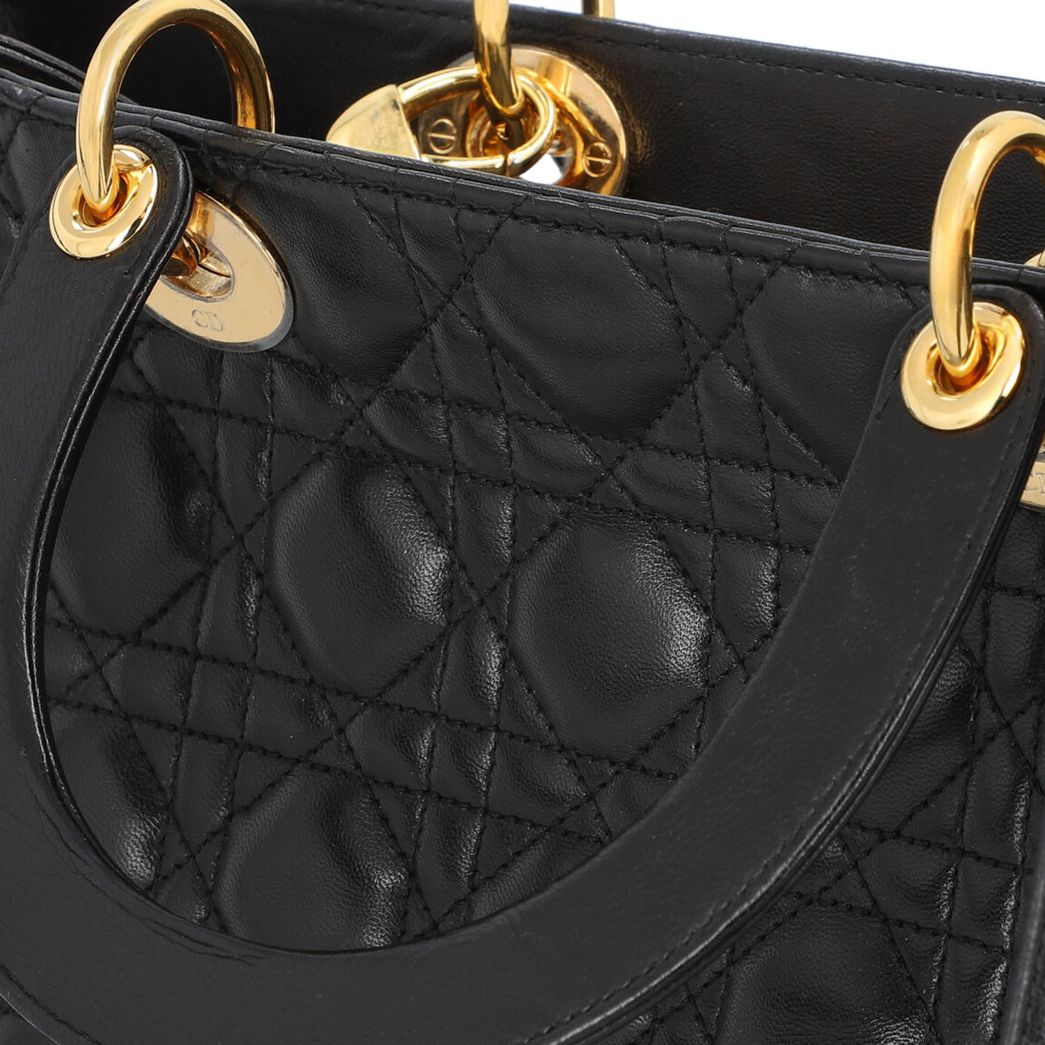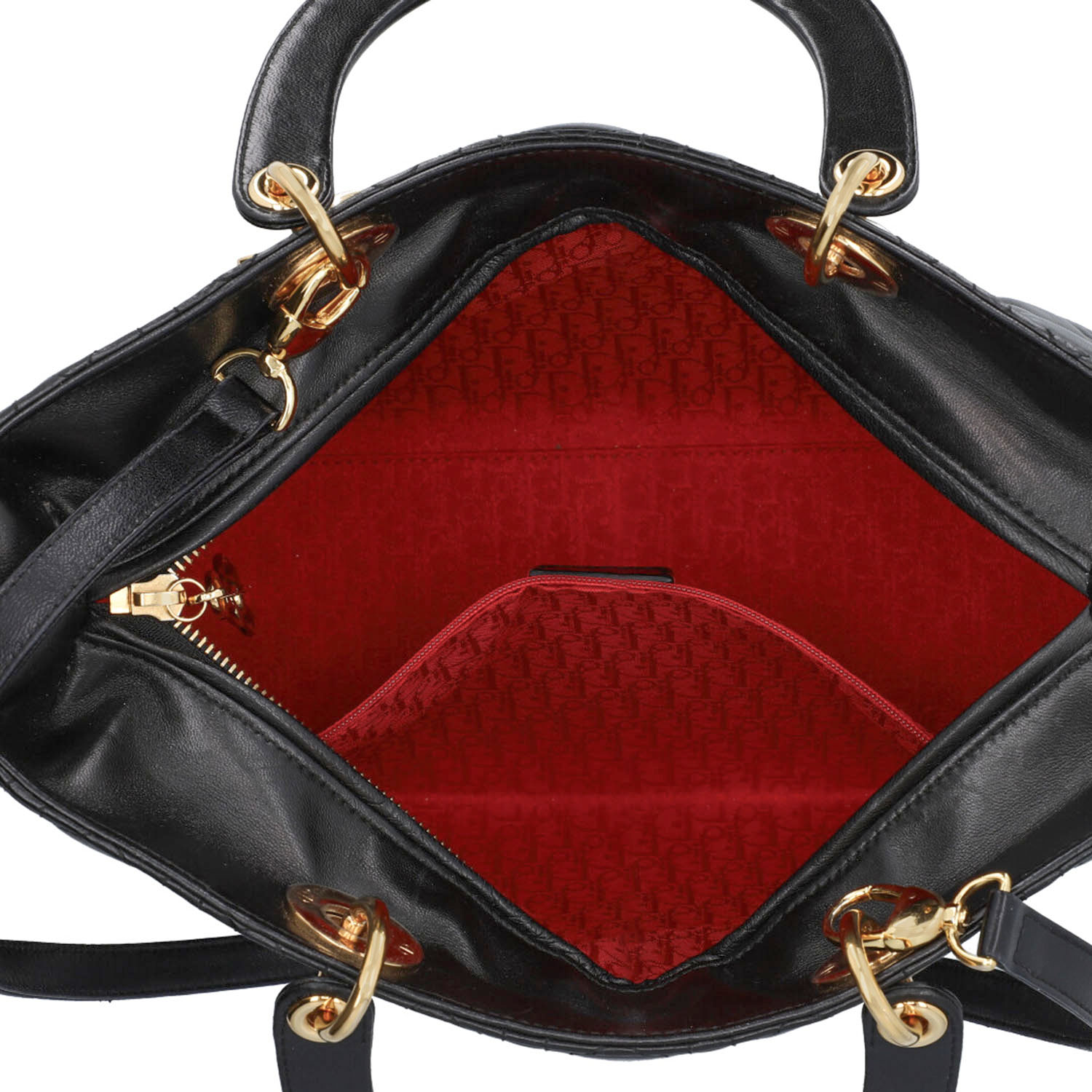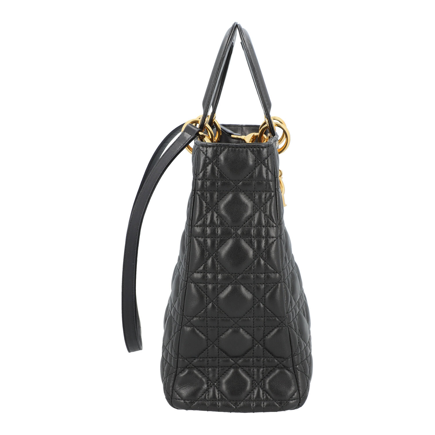 DIOR handle bag ‘LARGE LADY DIOR’, coll.: 2008, retail price: €6,200. Black cannage lambskin with gold-coloured metal fittings, double handle, zip fastening, logo pendant and detachable shoulder strap. Red textile interior with a zip compartment. Invoice and card enclosed. Signs of wear. 32 x 12 x 25 cm.